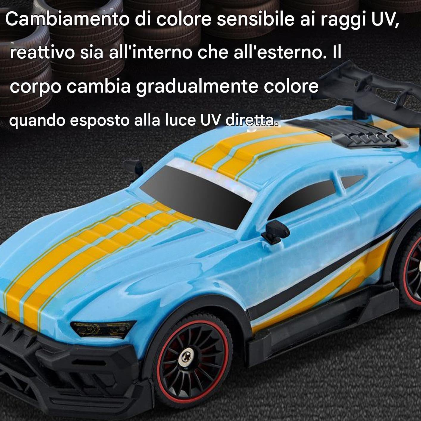 Cambio Colore Dinamico: La vernice sensibile ai raggi UV si attiva con la luce indoor ed esterna, stimolando la curiosità dei bambini con transizioni cromatiche dinamiche grazie alla tecnologia Color-Changs Capacità di Sterzata Dinamica: Utilizza tecnologia wireless 2.4G con copertura di 10 metri, fornisce risposta immediata, maneggevolezza e regolazioni di velocità variabile con trazione integrale 4WD per eseguire derivate e curve in modo impeccabile. Resistenza Provata: Progettata con una struttura robusta e una scocca rinforzata di spessore, l'auto radiocomandata è costruita per resistere a corse ad alta velocità assorbendo gli urti in modo efficace e mantenendo integrità dopo ripetuti utilizzi intensivi Dinamiche di guida realistiche: La combinazione di gomme larghe antiscivolo, feedback di velocità immersivo e carrozzeria stile GT con effetti sonori autentici crea un'esperienza di guida avvincente e realistica per gli appassionati di automobilismo Efficienza energetica ottimizzata: Cicli di ricarica brevissimi abbinati a 30 minuti di utilizzo intensivo. Soluzione ideale per chi valuta praticità e continuità di gioco, con meccanismo di conservazione energia che prolunga la vita utile della batteria.