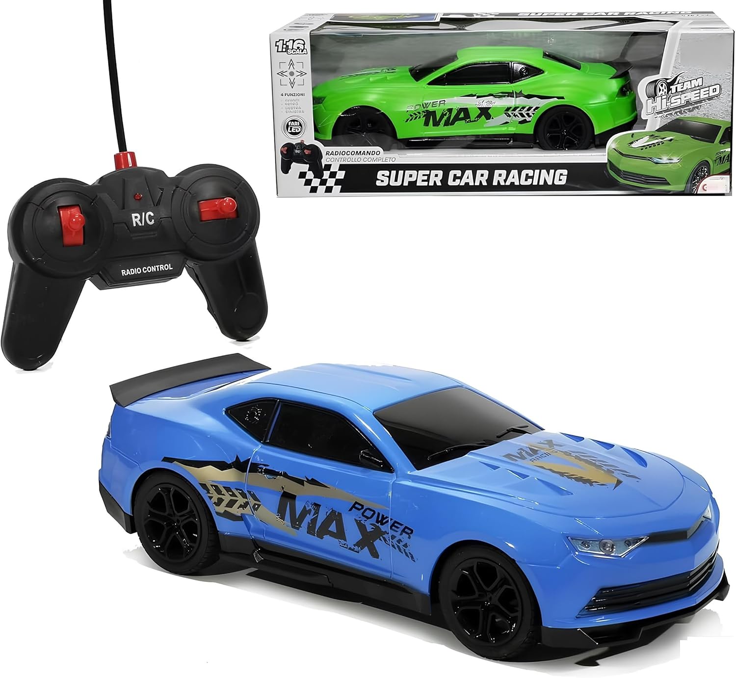 Auto Sportiva Telecomandata Maxi Coupe Scala 1:16 con radiocomando multifunzione: questa macchina telecomandata da corsa è progettata per offrire un’esperienza di guida realistica e dinamica, grazie alla super velocità, alle sospensioni precise e alla carrozzeria aerodinamica. Il radiocomando semplice e intuitivo consente movimenti avanti, indietro, destra e sinistra, permettendo a bambini e adulti di divertirsi in sfide mozzafiato. Colori assortiti, spedizione con colore casuale. Macchina Radiocomandata Super Car Racing con fari LED: i fari luminosi a LED rendono il gioco più realistico e avvincente, ideali per corse diurne e notturne. Le gomme soft e il telaio leggero offrono un’ottima aderenza e una regolazione sterzata precisa anche su superfici lisce, parquet, piastrelle e tappeti. Perfetta per gare indoor e outdoor, questa auto telecomandata è pensata per regalare emozioni da vera auto sportiva. Macchina Radiocomandata Super Car Racing con fari LED: i fari luminosi a LED rendono il gioco più realistico e avvincente, ideali per corse diurne e notturne. Le gomme soft e il telaio leggero offrono un’ottima aderenza e una regolazione sterzata precisa anche su superfici lisce, parquet, piastrelle e tappeti. Perfetta per gare indoor e outdoor, questa auto telecomandata è pensata per regalare emozioni da vera auto sportiva. Macchina telecomandata grande scala 1:16 ideale come regalo: con una lunghezza di 26 cm e un design curato nei dettagli, questa auto radiocomandata è perfetta come idea regalo per bambini dai 5 anni in su, ragazzi e adulti appassionati di motori e modellismo. Confezione curata e pronta per essere regalata in occasioni speciali come compleanni, Natale, feste e ricorrenze, garantendo ore di divertimento. Auto RC con radiocomando a 4 funzioni: il controller incluso permette di comandare facilmente l’auto in tutte le direzioni, offrendo massima libertà di movimento. Funziona con 2 batterie AA (non incluse), mentre l’auto funziona con 4 batterie AA (non incluse). Facile da usare e pronta a correre, rappresenta un ottimo compromesso tra prestazioni, durata e facilità d’uso, adatta sia a principianti che a piccoli piloti esperti. Super Car Racing con sospensioni e gomme soft: la presenza delle sospensioni migliora la stabilità del veicolo su diversi terreni, mentre le gomme in materiale morbido garantiscono una guida fluida e un’aderenza superiore, riducendo il rischio di slittamento. Perfetta per sfide tra amici, gare di velocità e giochi di abilità, stimolando la coordinazione e la fantasia dei bambini in totale sicurezza. Auto sportiva telecomandata con confezione Super Car Racing Team Hi-Speed: la scatola colorata e accattivante mette in evidenza le caratteristiche principali come fari LED, scala 1:16 e radiocomando multifunzione. Ottima anche per esposizione e collezione, questa macchina RC unisce estetica e performance. Con colori assortiti e spedizione casuale, ogni acquisto diventa un’esperienza emozionante e imprevedibile.