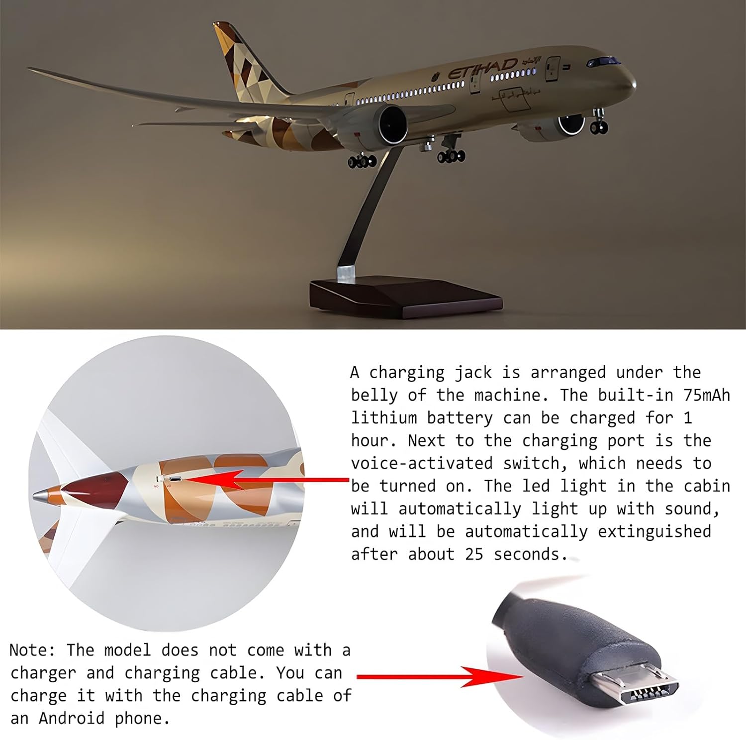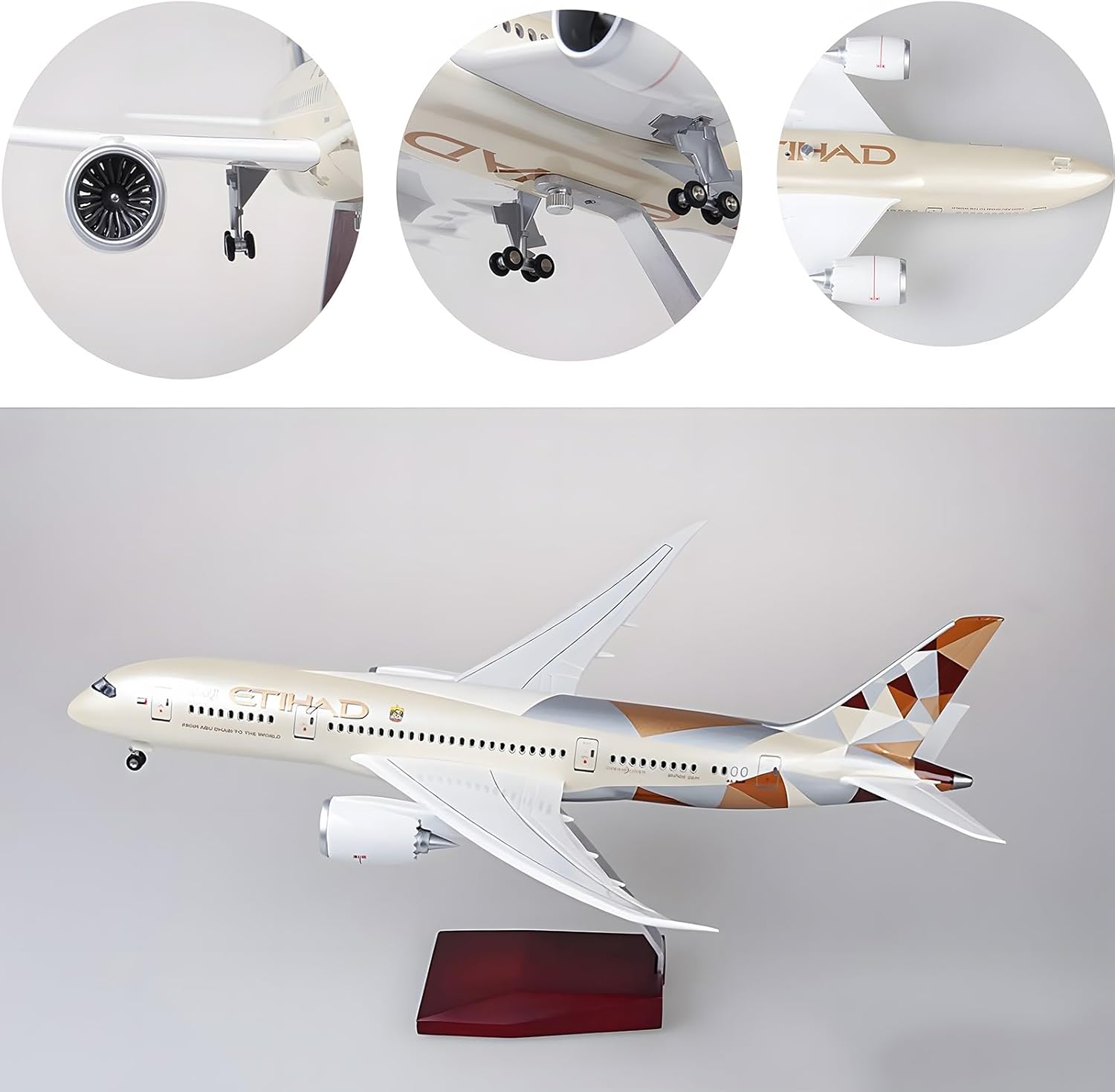 Simulazione di un modello di aereo - Scopri il fascino del modello di aereo B787 Etihad Airways con luci attivate tramite comando vocale che si illuminano al tocco, creando un'esperienza incantevole. Le luci si spengono automaticamente dopo 20 secondi, esaltando il fascino del modello e rendendolo un perfetto elemento decorativo. Aeromodello americano - Questo splendido modello di aereo B787 Etihad Airways presenta un design meticolosamente realizzato con carrello di atterraggio staccabile, luci di cabina e abitacolo, motori scavati e pale del motore con effetto vento. Con una lunghezza di 42 cm e una larghezza di 47 cm, questo modello di grandi dimensioni presenta dettagli incredibili. Materiali di alta qualità: realizzato in resina di alta qualità, il modellino dell'aereo B787 Etihad Airways è sostenuto da una robusta base trapezoidale in legno e da una staffa in metallo, che ne garantiscono la stabilità e ne esaltano l'estetica. I materiali resistenti garantiscono un divertimento duraturo. Tecnologia di simulazione avanzata: questo modello di aereo B787 Etihad Airways incorpora le tecnologie più recenti, con carrello di atterraggio rimovibile e finestrini pilota progettati for emulare la trasparenza di un vero aereo. L'innovativa illuminazione a comando vocale offre un'esperienza visiva straordinaria for gli appassionati di aviazione. Per qualsiasi ambiente - Ideale for decorare l'ufficio, la casa o il negozio, il modellino dell'aereo B787 Etihad Airways è un regalo eccellente for occasioni di lavoro, compleanni o festival. Con i suoi dettagli intricati, è un pezzo unico che piace sia ai collezionisti che agli ammiratori occasionali.