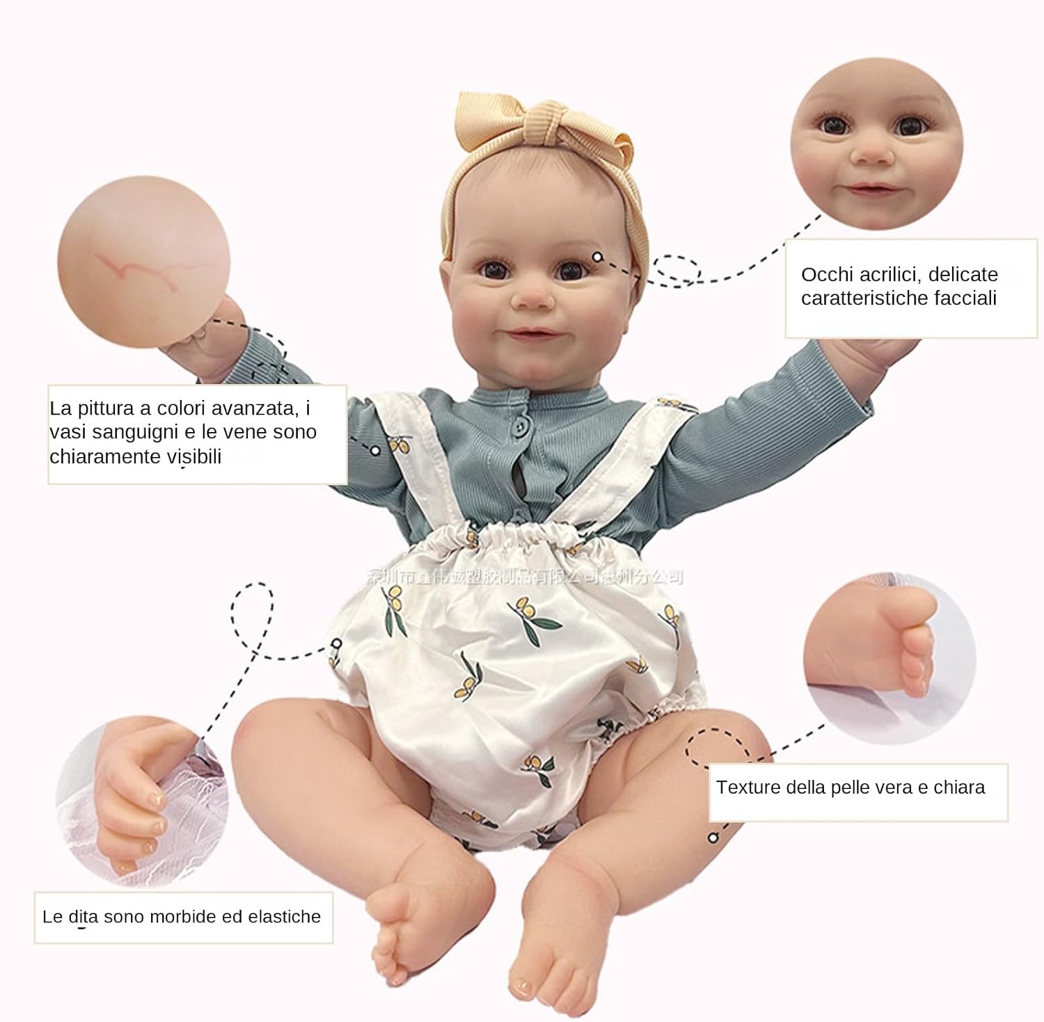 Silicone Morbido e Naturale: Costruita con silicone ecologico, morbido ed elastico, questa dona una sensazione identica alla pelle di un bambino reale, rendendola perfetta per abbracci prolungati e sessioni di gioco. Il silicone utilizzato è delicato al contatto e si adatta al calore del corpo, offrendo un'esperienza tattile e realistica. Ideale per chi cerca un compagno di gioco affettuoso, promuove momenti di tenerezza e allegria. La in silicone ecologico è Articolazioni Interattive: Le articolazioni flessibili di questa bambino portano l'interattività a un livello superiore, permettendo di posizionarla in molte diverse come sdraiata, seduta o tenuta in braccio. Questa versatilità di movimento aumenta notevolmente il realismo, creando un'esperienza di gioco più coinvolgente e varia grazie alla capacità di assumere pose naturali e in ogni situazione. Autenticità Insuperabile e Realistica: Questa utilizza una tecnologia di produzione avanzata per ripristinare fedelmente l'aspetto di un vero neonato, con espressioni facciali accuratamente progettate, una texture della pelle raffinata e dettagli corporei precisi. Ogni elemento contribuisce a un realismo straordinario, catturando le caratteristiche di un bebè reale in modo naturale e coinvolgente, ideale per appassionati che cercano un prodotto di alta qualità e dettagli iperreali Compagno di Cura Emotiva: Grazie alla sua capacità di alleviare lo stress e portare comfort, questa toddler insegna ai bambini il valore della cura verso gli altri e coltiva il loro senso di responsabilità. Funge da supporto emotivo costante, incoraggiando lo sviluppo di empatia e sensibilità attraverso attività di gioco coinvolgenti e educative. È un alleato prezioso per favorire una crescita armoniosa e equilibrata. Set Completo: Dotata di vestiti squisiti, bottiglie e , questa toddler aumenta il fattore della tua collezione. Ideale per imparare abilità di vita di base e favorire le interazioni, il set completo con e rende il gioco educativo e coinvolgente. La cura della bambola con i suoi realistici aiuta a sviluppare competenze quotidiane in modo naturale, aumentando la carineria e il realismo del gioco con la toddler e i suoi