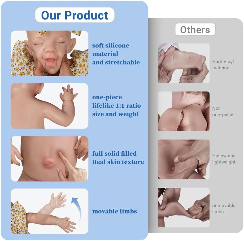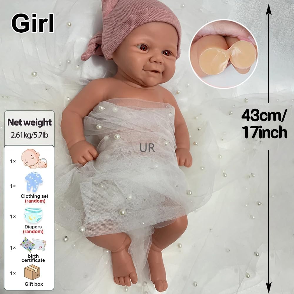 Design autentico per neonato: questa dolce ragazza alta 43 cm con un sorriso dolce è una bambola rinata realizzata in silicone per tutto il corpo. Convince con dettagli realistici e una struttura anatomicamente corretta e offre un'esperienza realistica per il bambino. Bambole in silicone per tutto il corpo: la bambola in silicone pieno è significativamente diversa dalla bambola in vinile cavo. Il silicone totale lo fa sentire come un vero bambino tra le tue braccia. Tocco delicato, perfetto per trattenere, dondolare e coccolare. Completamente lavabile, può essere lavato con il tuo bambino. Pittura concisa e delicata: realizzata a mano da artisti di talento, la pelle, l'espressione e le altre caratteristiche della bambola sono perfettamente restaurate per adattarsi all'aspetto di un vero bambino. Sicuro e certificato: la nostra bambola rinata in silicone soddisfa gli standard CPC, CE e ASTM, rendendola atossica e sicura per i bambini dai 3 anni in su. Il loro peso e la loro consistenza realistici li rendono perfetti per i bambini o come regalo. Divertiti con il bebè: vestilo come vuoi e rendilo il tuo bebè preferito. La scelta ideale per attività prescolari e familiari, accessori fotografici, giochi di ruolo, giochi amorevoli e collezione di bambole.
