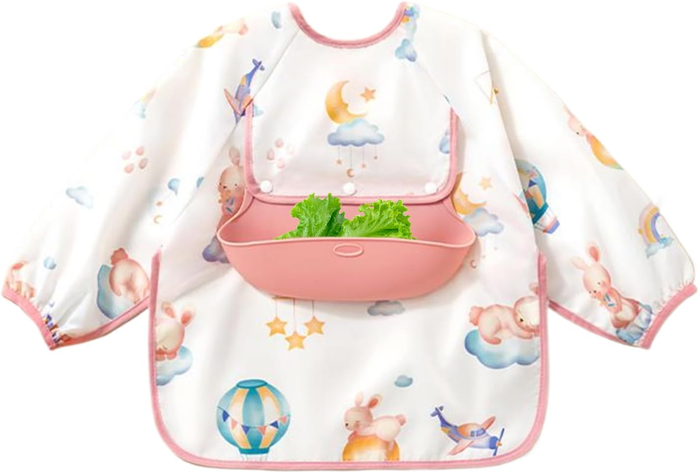 Generico Bavaglini con Maniche - Bavaglino Impermeabile con Maniche e Taschetta per Bambini | Copertura Completa Riutilizzabile Per Mangiare Dentizione Pittura Viaggi Momento Del Pasto