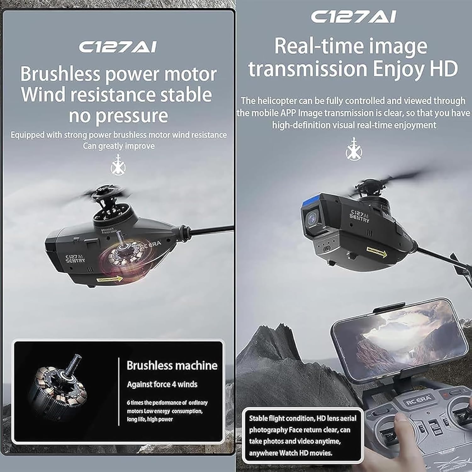 [C127AI Scout Drone Model]Sistema unico di inseguimento del bersaglio con riconoscimento AI, in grado di identificare 80 tipi di bersagli. Prova l'emozione di volare con il nostro elicottero militare RC, perfetto per le avventure all'aperto e per catturare splendide riprese aeree. [Elicottero RC con videocamera 1080P]Cattura riprese aeree mozzafiato con videocamera grandangolare 1080P e trasmissione di immagini 5G, goditi un volo stabile e in tempo reale e facile. per un'esperienza ad alta definizione, a bassa latenza e a lungo raggio. [Design innovativo]L'ultimo Scout Drone C127AI ad alta efficienza e buona resistenza al vento è dotato di un giroscopio elettronico a 6 assi per la stabilità, un barometro per il mantenimento dell'altitudine e il posizionamento ottico del flusso con un rotore singolo senza spazzole e senza alettoni. [Allarme di bassa tensione, protezione contro lo stallo del motore, protezione contro la perdita di controllo, cambio di dimensione del timone, decollo con un solo pulsante e atterraggio con un solo pulsante per un'esperienza intelligente e senza preoccupazioni. [Regalo ideale] L'artigianato superbo lo rende un grande regalo di vacanza per gli amici, la famiglia e i bambini. Crea un meraviglioso tempo libero per genitori e figli insieme