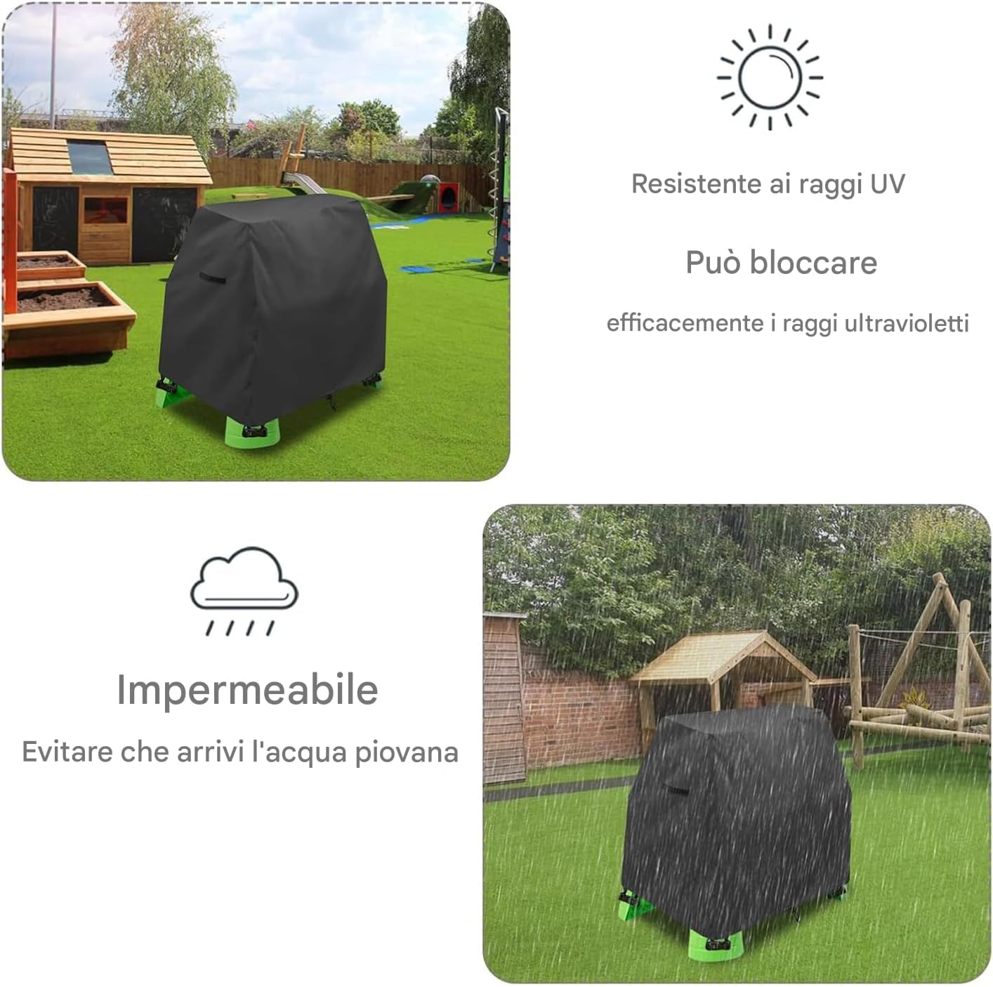 Resistenza Migliorata: Grazie al robusto tessuto Oxford 420D, garantisce eccellente resistenza agli strappi e mantenimento della forma, ideale per uso esterno prolungato con prestazioni durature Posizionamento Libero: Design flessibile per attività ludiche sicure, con peso ridotto e installazione istantanea, completato da maniglia superiore che permette movimentazione comoda in ogni situazione d'uso Copertura Antiacqua: Cuciture termosaldate rinforzate e tecnologia impermeabile avanzata a doppia tenuta proteggono efficacemente dalla pioggia, garantendo contenuti asciutti e prolungando la durata dei giocattoli conservati sotto durante le intemperie imprevedibili all'aperto Uso Multifunzione: Tecnologia integrata resistente a polvere e raggi UV con design avvolgente caldo offre protezione completa, mantiene le superfici pulite, senza corpi estranei e in condizioni ottimali in modo affidabile Copertura Stabile e Sicura: Progettata per rimanere saldamente in posizione, utilizza un a 4 cinghie e un cordino regolabile per un'ottimale, prevenendo il sollevamento dal e proteggendo il telaio del tavolo da danni.