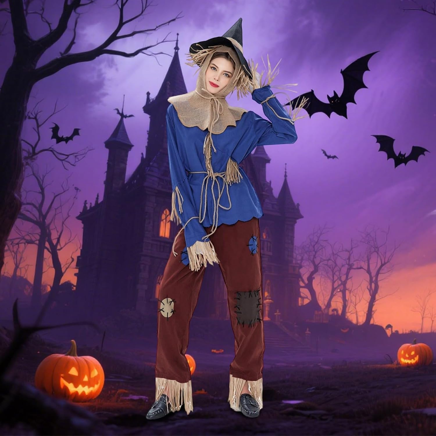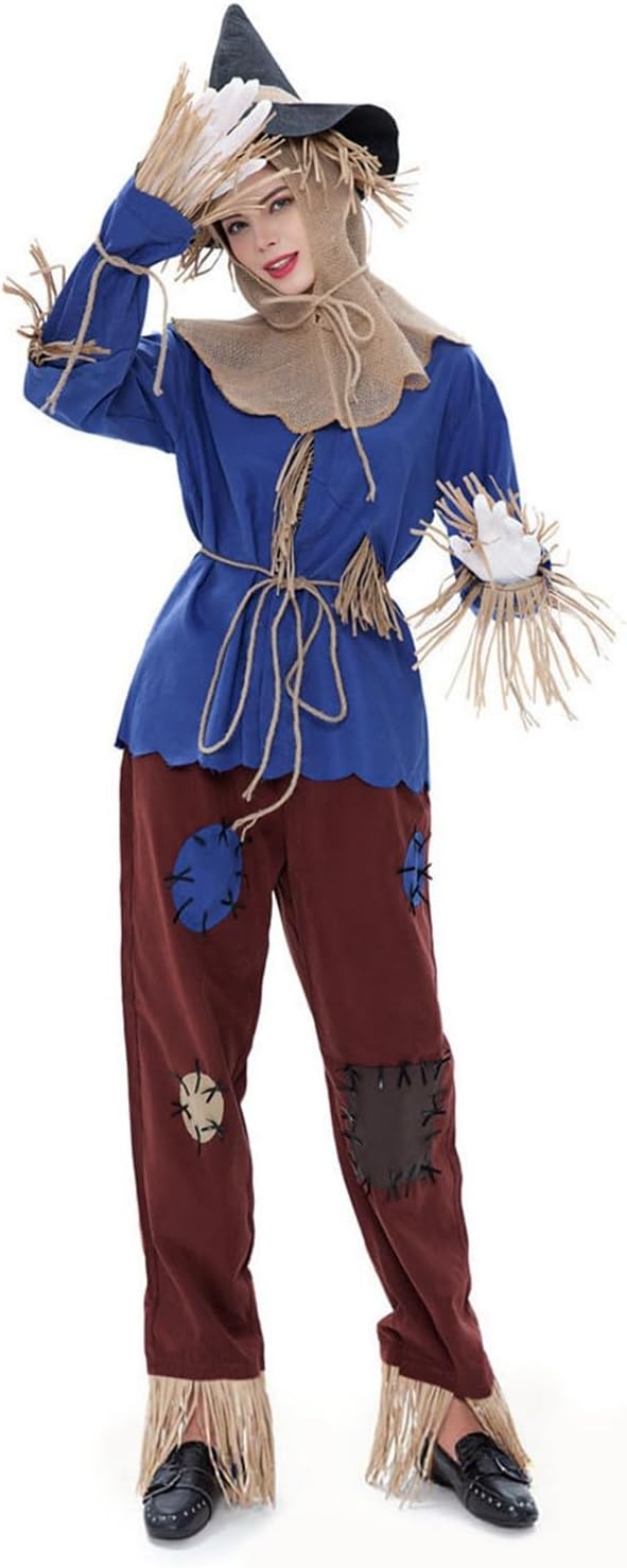 Questo costume spaventapasseri è una replica precisa di un classico con cappuccio e spago, mentre colori contrastanti e materiali misti iniettano dettagli stravaganti. Il taglio ampio è adatto per più scenari, toppe e accessori nascondono la narrazione, dalla modellazione ai dettagli, immergendoti nel focus di Halloween, accattivante e indossabile