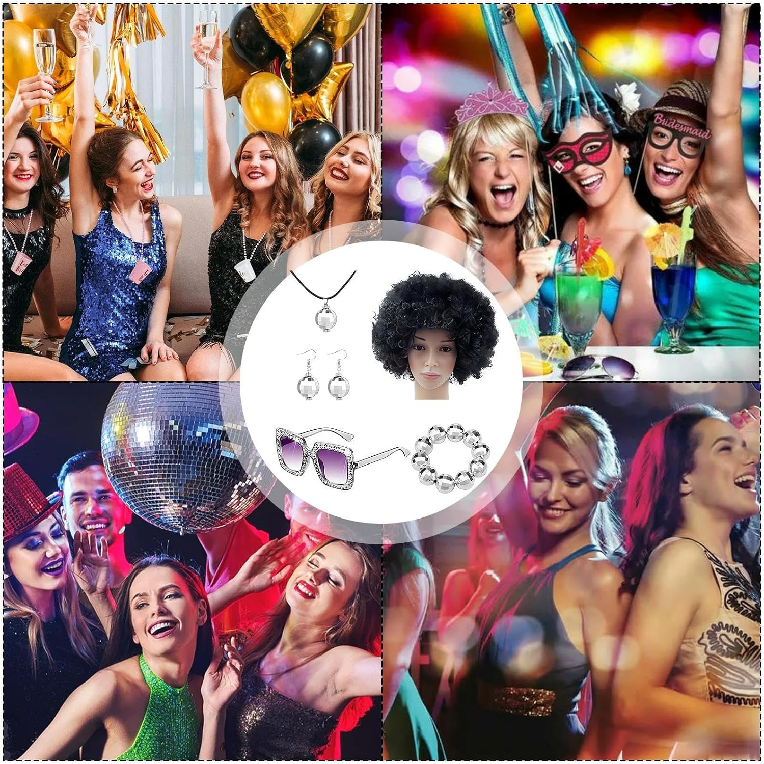 Descrizione prodotto Aggiungi un po' di brillantezza alla tua festa in discoteca con i nostri per costumi da discoteca! Questo set include un'abbagliante collana con palla da discoteca, perfetta per far brillare i tuoi orecchini sotto la palla da discoteca. La forte brillantezza e la luce brillante ti faranno sentire una regina della discoteca per tutta la notte. Specifica: Nome: set di da discoteca da donna degli anni '70 Materiale: fibra sintetica + PP Dimensioni del prodotto: come mostrato nell'immagine Peso: circa 230 g Lista imballaggio: Capelli corti e ricci anni '70 x1 Orecchini con sfera da discoteca x1 paio Collana con palla da discoteca x1 Bracciale con palla da discoteca x1 Occhiali da sole con montatura x1 Nota: 1. A causa dei diversi effetti di visualizzazione e di illuminazione, il colore effettivo del prodotto potrebbe essere leggermente diverso dal colore mostrato nell'immagine. Grazie! 2. A causa della misurazione manuale, è consentita una deviazione di misurazione di 1-3 cm. Avviso di sicurezza Non applicabile