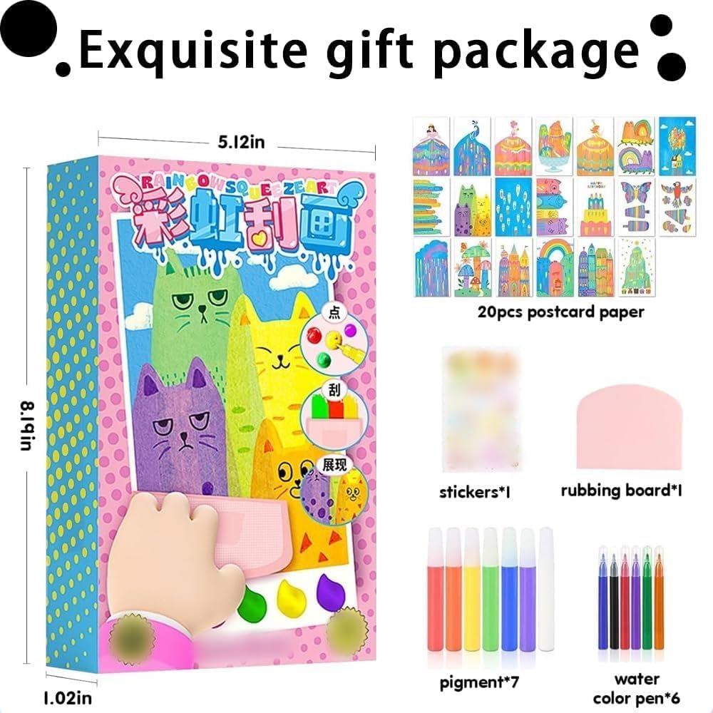 Interactive Scratch Art Fun:DIY rainbow scratch art contains 20pcs paintings,the magic craft kit brings vibrant rainbow colors to life with a simple scratch and reveal process,you can give free rein to your imagination and scratches out a variety of unique patterns and color combinations Interestingness & Imagination:Rainbow theme makes this kit truly stand out,offering a range of bold,brilliant colors that kids can bring to the surface as they scratch away,experimenting with different patterns and designs,creating unique artwork with every scratch DIY Postcards Design:What's even more surprising is that the backs of these are also postcards! The back of each one is like a small art window,waiting for you to fill it with words to convey that unique emotion and story Scratch Painting with Stickers: After applying the stickers, the painting seems to be given a new life, every detail is more vivid and every color is more vibrant Novelty Gifts:Ideal for birthdays,holidays,or party favors,this kit offers hours of creative entertainment and hands-on fun for boys and girls,a painting by yourself and a postcard on the back with a message of blessing is believed to be the best gift for Christmas