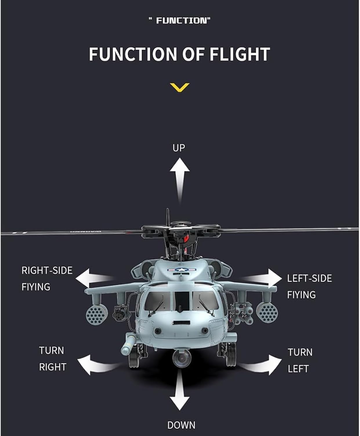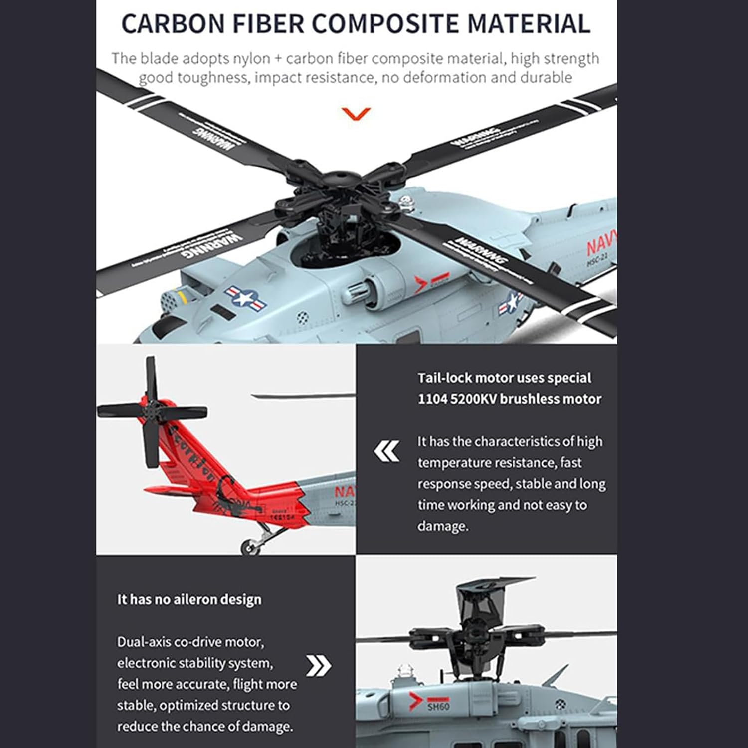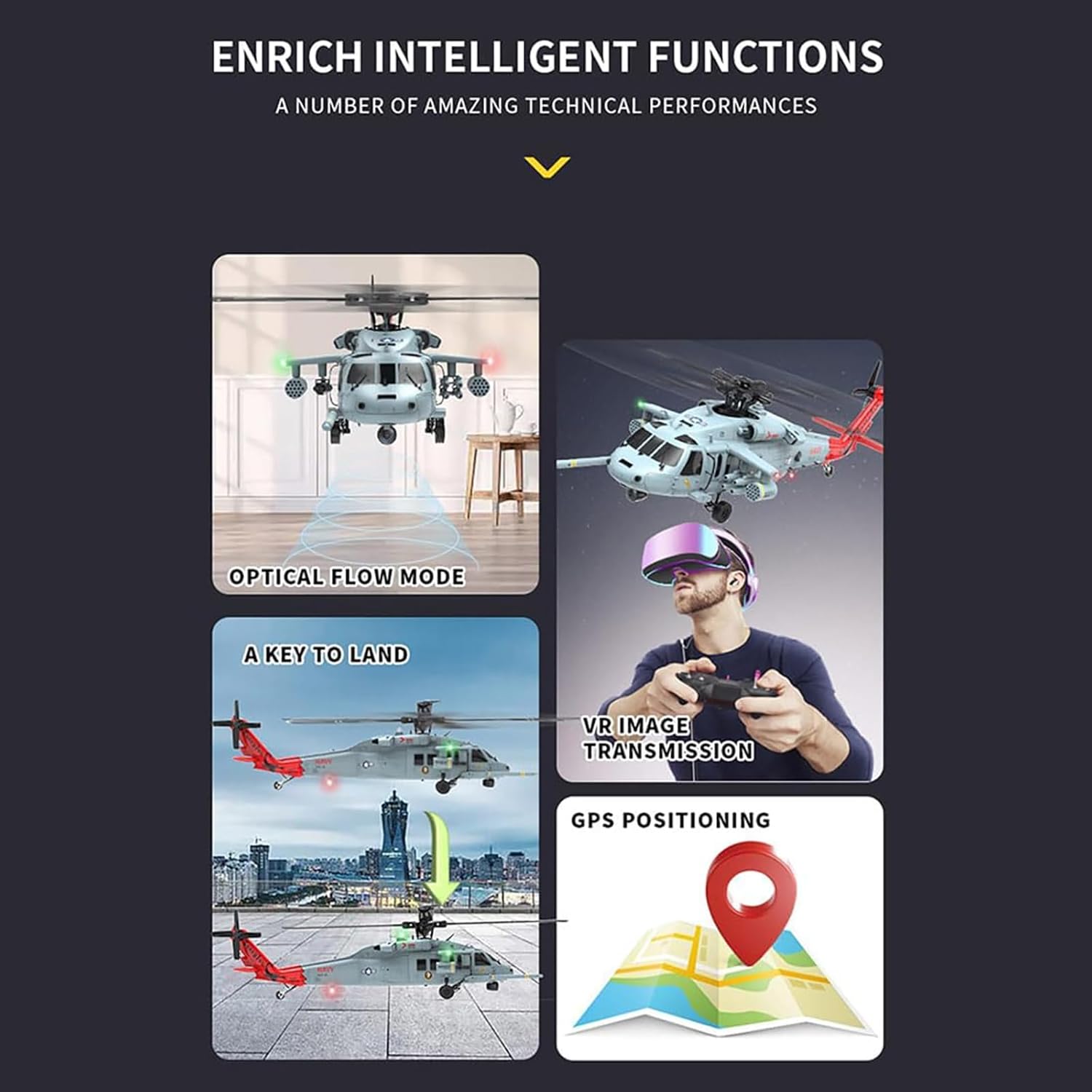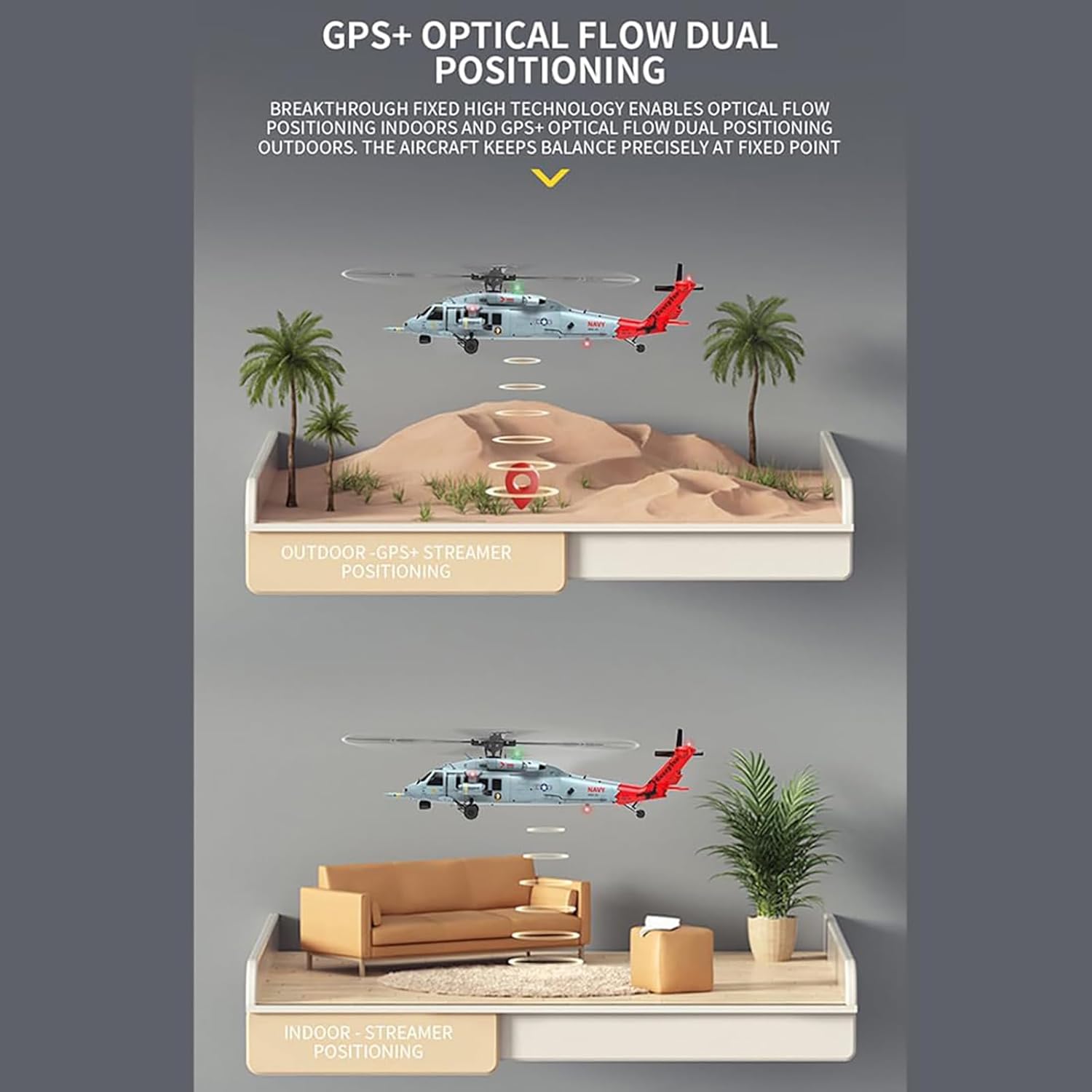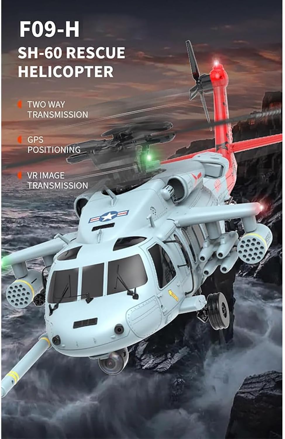 Modello Elicottero F09-H SH60 RC - Dettagli esterni realistici, illuminazione fredda, porte mobili, carrello d'atterraggio ammortizzato Versione intelligente GPS - Controllo di volo intelligente, stabilizzazione GPS, volo con visione verso il basso, ritorno con un solo tasto, ritorno intelligente a batteria scarica Doppio motore brushless: riduce al minimo il rumore degli ingranaggi, massimizza la coppia, la potenza erogata e l'efficienza operativa. Modalità di volo 6G/3D - Controllo reattivo, manovre acrobatiche, adatto a piloti principianti ed esperti Batteria ad alte prestazioni - Lunga durata di volo, oltre 500 cicli, impedisce la sovraccarica, la sovrascarica e l'indicazione di batteria scarica