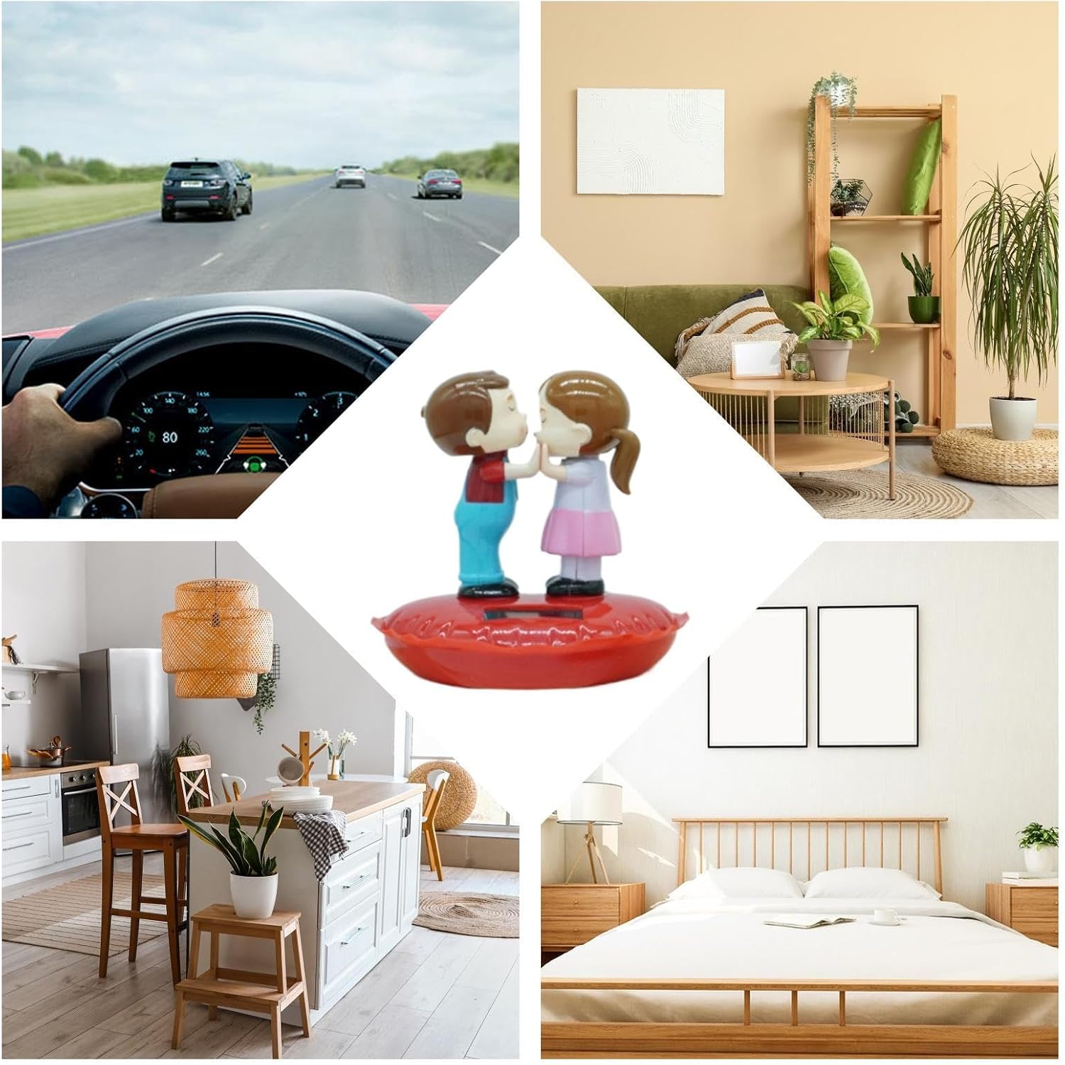 Accessori Romantic per Auto: Trasforma l'interno della tua auto con decorazioni carine a tema personaggi, dotate di movimento dinamico a forma di bacio per creare un'atmosfera dolce e romantica. Ideali per valorizzare l'estetica e l'appeal emotivo durante ogni viaggio. Dispositivo Movimento Solare: Sfrutta la tecnologia solare autoadattiva per garantire un funzionamento continuo e silenzioso. Accessorio automobilistico a risparmio energetico con meccanismo a scossa automatica, zero manutenzione richiesta. Innovazione anti-oscillazione: integrato anti-scivolamento e struttura anti-vibrazione prevengono movimenti indesiderati, soluzione pratica per mantenere stabilità degli oggetti decorativi in tutte le condizioni stradali Prestazioni durature: Tecnologia di colorazione permanente unita a struttura in PVC robusto assicura stabilità cromatica e resistenza meccanica, ideale per esposizioni prolungate a sole e variazioni termiche senza degrado estetico Regalo : Accessori decorativi pratici e allegri per cruscotto auto, adatti a tutte le vetture come berline e furgoni, soluzione originale per sorprendere gli appassionati di motori