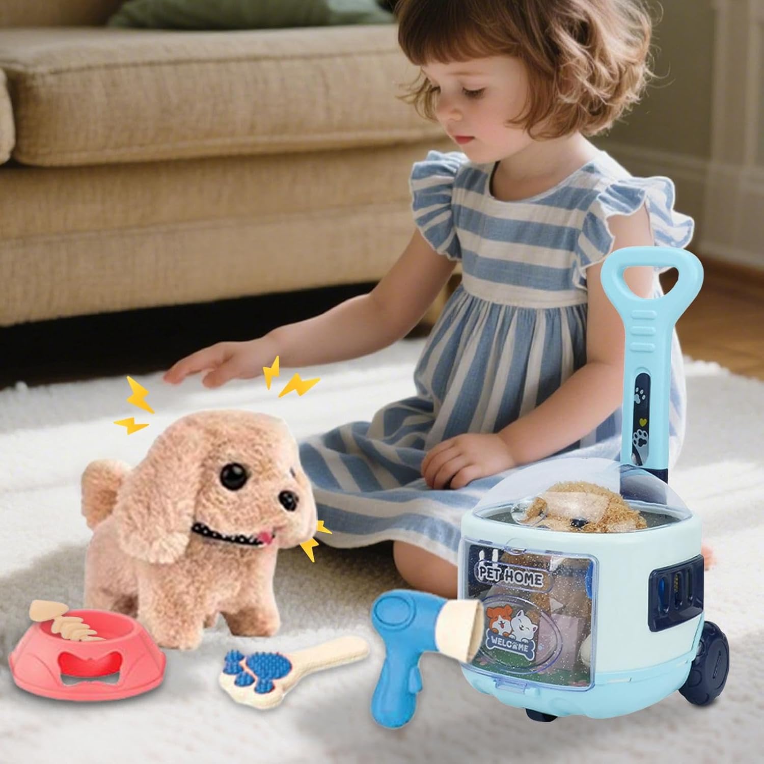 Esperienza di Accudimento Immersivo: Il elettronico intelligente potenzia un'accudimento immersivo, spingendo gli utenti a sviluppare responsabilità mentre partecipano a una simulazione realistica di animale domestico e godono di una profonda compagnia emotiva con il loro compagno elettronico interattivo Sviluppo Competenze Interattive: Supporta avventure di finzione per stimolare la creatività, alleviare lo stress e costruire abilità come coordinazione ed empatia, utilizzando il coinvolgimento dinamico di animali elettronici per utenti giovani Qualità Tessuto Peluche: Realizzato con un fine tessuto peluche corto, questo animale domestico elettronico una texture morbidissima e densa, garantendo comfort durante il gioco quotidiano e un'esperienza sicura grazie a materiali ipoallergenici e delicati sulla pelle. Design ergonomico manico: Dotato di un manico ergonomico per una presa comoda, questo passeggino è ideale per le uscite genitore-figlio e le passeggiate in cortile, garantisce il trasporto facile all aperto con il design user-friendly per la mobilità senza sforzo durante le attività familiari Design Intuitivo: Esperienza di gioco immediata e piacevole senza configurazioni complicate, grazie al controllo semplificato a un pulsante e alla batteria di lunga durata che supporta ore di intrattenimento continuo