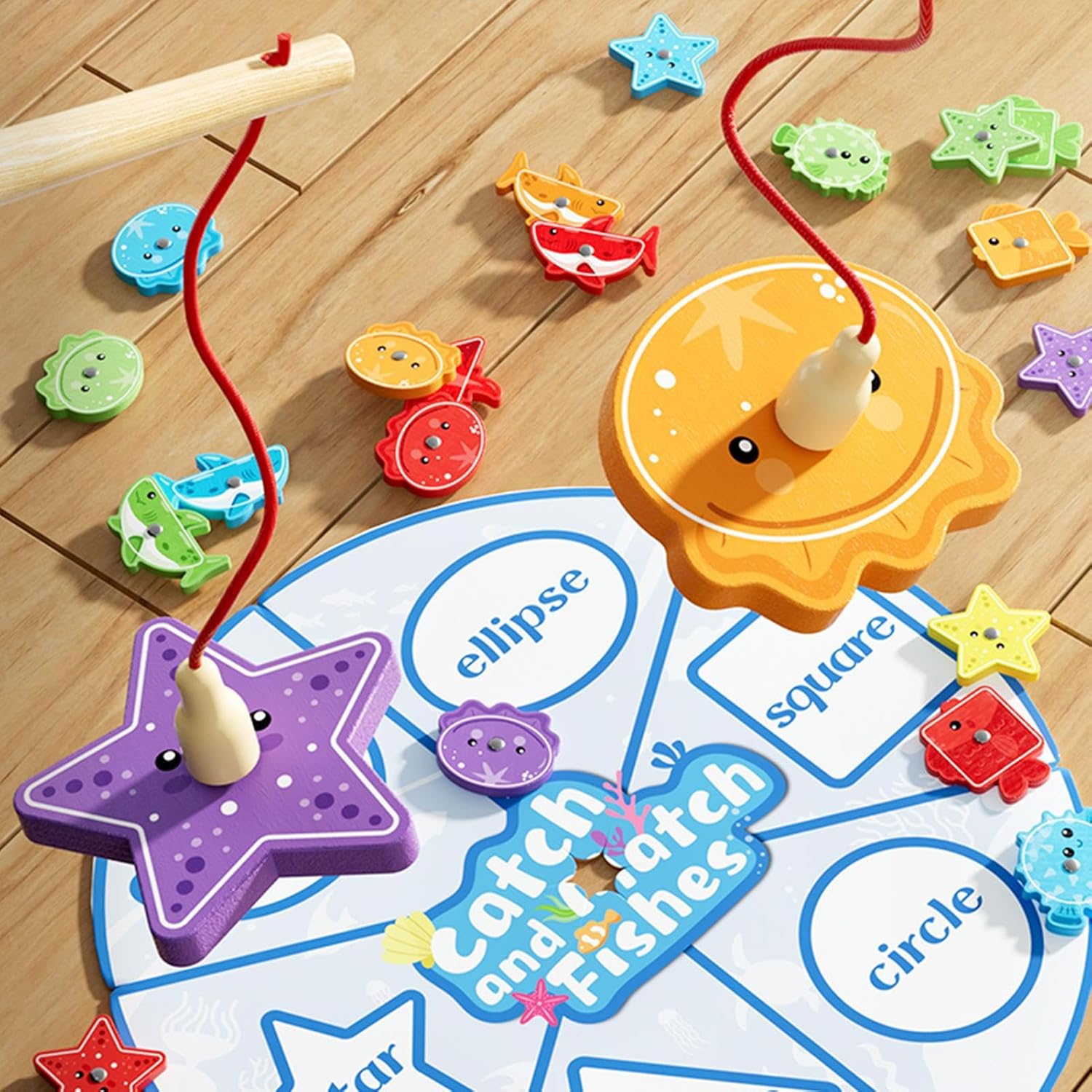 Istruzione corrispondente a colori: il giocattolo da pesca magnetico migliora il riconoscimento del colore usando l'asta magnetica per raccogliere il pesce e abbinare vari colori per l'apprendimento efficace Sviluppo delle abilità critiche: gioco educativo di intrattenimento che sviluppa le necessarie abilità pratiche per i bambini, migliorando il pensiero logico e promuovendo efficacemente le capacità di risoluzione dei problemi Aiuta a imparare i modelli: graziose forme di creature marine, fungendo da giocattoli di smistamento di , aiuta a imparare i modelli e sviluppano il riconoscimento delle forme senza sforzo mentre i bambini vengono coinvolti e imparano le forme Sicuro e resistente all'usura: realizzato a mano in legno massiccio e vernice con colori a base d'acqua, il nostro gioco di pesca magnetico assicura un divertimento duraturo rimanendo al sicuro e resistente all'usura per tutte le età Foster Game with Friends: il giocattolo da pesca in legno comprende due canne da pesca che consentono ai bambini di a turno e sfidarsi a vicenda in questa coinvolgente gioco di pesca magnetica