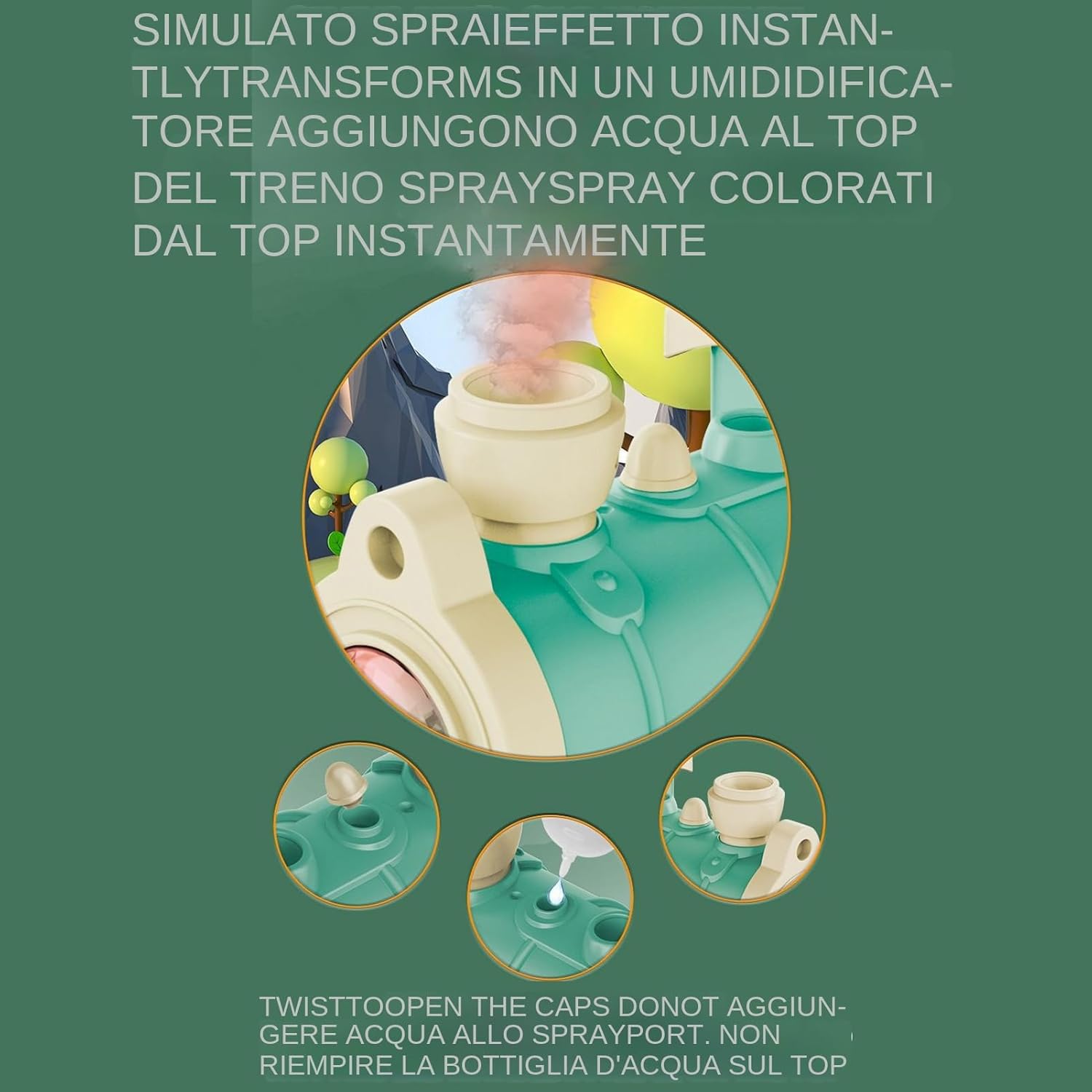 Qualità e Sicurezza: Prodotto con materiali certificati sicuri, garantisce superfici lisce e inodori, creando un'esperienza di gioco protetta per bambini che soddisfa requisiti essenziali Forma Incantevole:Caratterizzato da colori vivaci e una del adorabile, è progettato per affascinare i bambini, migliorare la stimolazione sensoriale e offrire infinite opportunità per scenari di gioco simbolico pieno di gioia. Design Interattivo:Stimola lo sviluppo sensoriale con trenini progettati per esercitare le capacità percettive, sviluppando abilità pratiche attraverso esperienze di gioco manuale che alimentano la curiosità e l'immaginazione dei bambini in modo spontaneo Gioco Interattivo:Comprende scivolo, funzione spray, sfera levitante, effetti luminosi e musica per coinvolgere attivamente il bambino, sviluppando capacità cognitive ed esplorazione immaginativa attraverso elementi sensoriali dinamici e multifunzionali. La Scienza del : Il flusso d'aria controlla il movimento della sfera, creando un affascinante effetto di levitazione che favorisce l'apprendimento scientifico mentre incoraggia l'esplorazione creativa durante il gioco con questo innovativo .