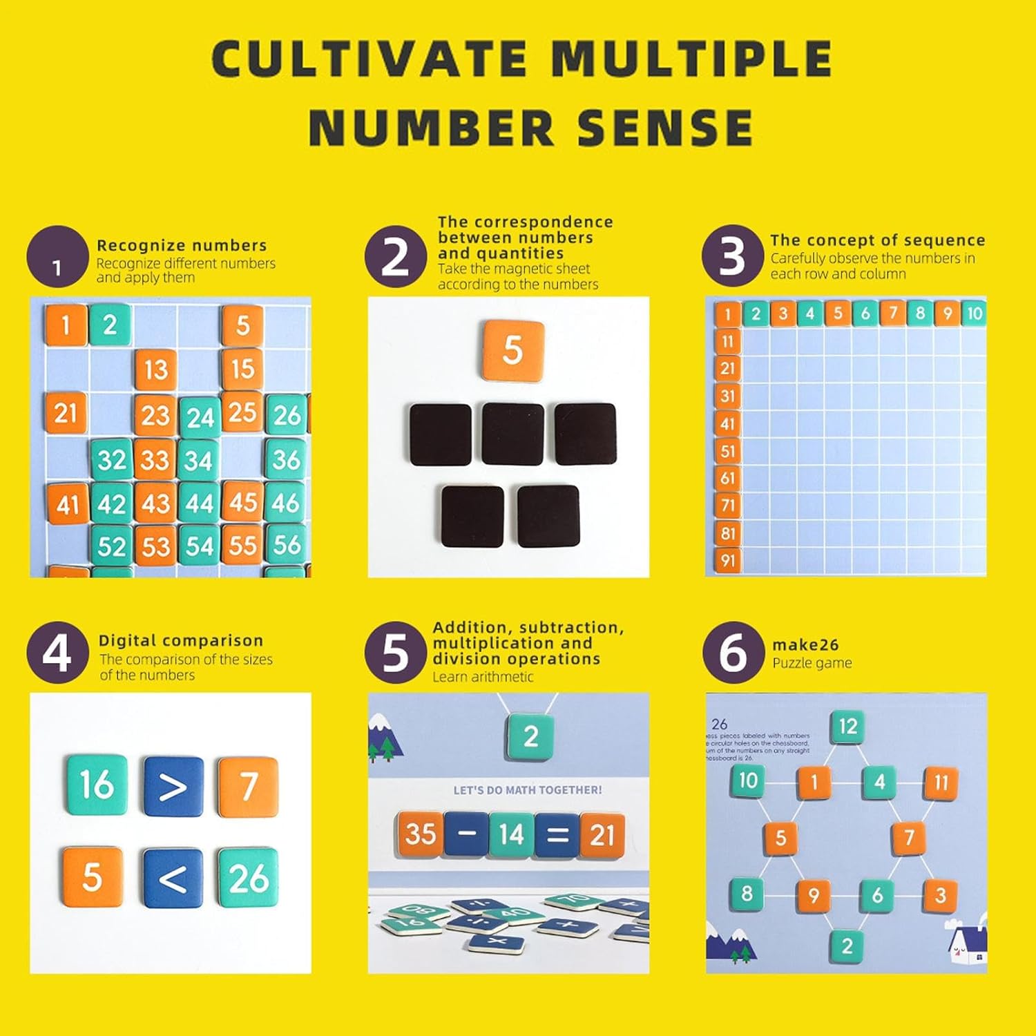 Gioco di Matematica Avvincente: Trasforma la matematica in un'esperienza di gioco pratica e piacevo, unendo divertimento e istruzione per creare modi coinvolgenti di padroneggiare competenze fondamentali in modo intuitivo e senza stress Apprendimento delMatematiche: Sfide progressive potenziano la comprensione dei numeri 1-100, addizioni e sottrazioni, favorendo l'apprendimento matematico per bambini in età prescolare e primi anni scolastici con giochi da tavolo avvincenti Esperienza di Gioco Sicura: Cartoncino bianco bordi vigati e componenti lucidati a mano garantiscono un gioco sicuro per bambini dai 3 anni, con angoli arrotondati per prevenire eventuali inconvenienti durante l'utilizzo del gioco da tavolo matematico. Stabilità Potenziata: magnetica affidabisupporta un gameplay stabie l'esposizione, mantenendo ogni pezzo saldamente attaccato per migliorare la concentrazione e l'impegno educativo Sviluppo delabilità: Migliora capacità logiche e di ragionamento posizionando numeri per ottenere la somma di 26 su ogni linea, con un design creativo di gioco da tavolo che potenzia abilità spaziali e di probm solving attraverso il pensiero strategico e la pianificazione