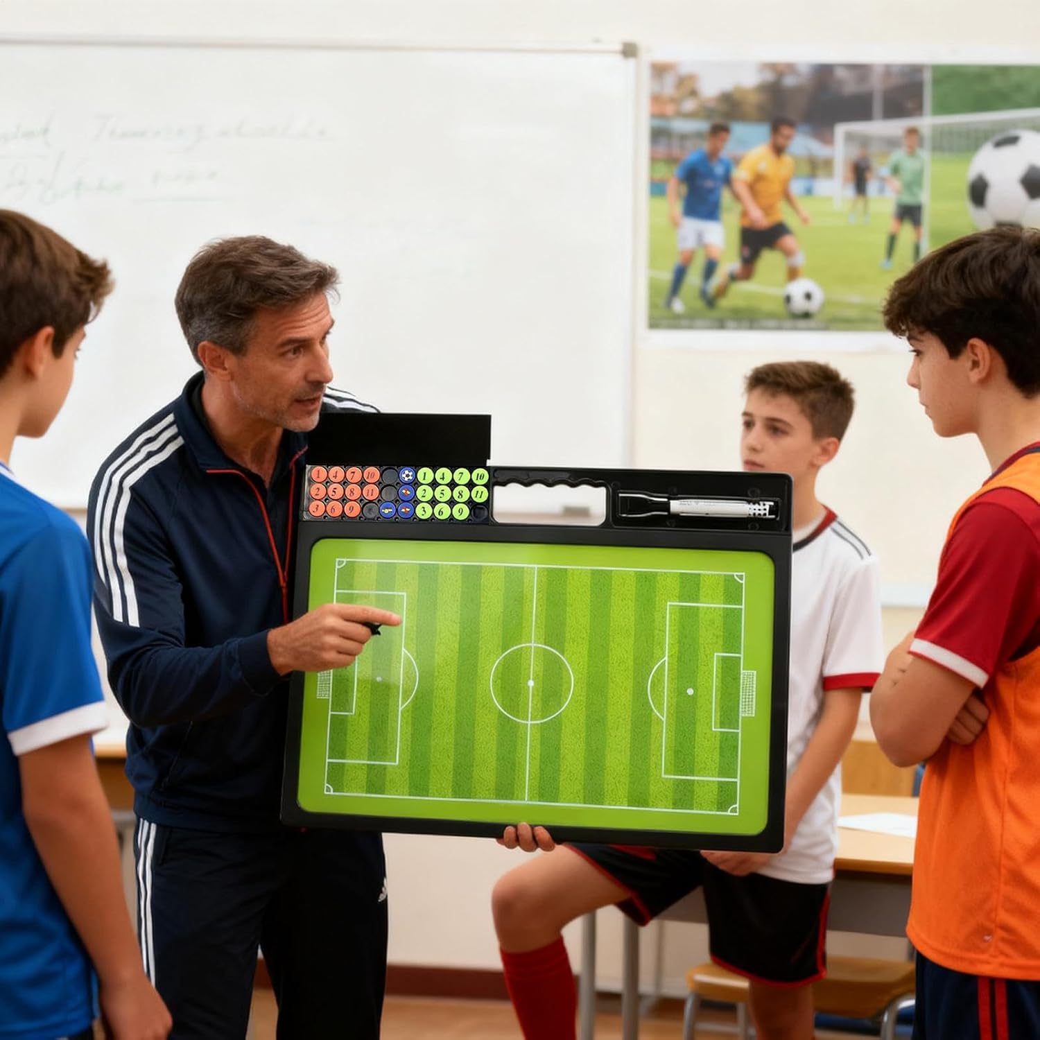 Cancellatura Senza Sforzo: La lavagna da calcio offre una scrittura e con linee luminose di facile lettura, rinforzando l'apprendimento mediante chiarezza e mantenendo le modifiche pulite e senza sbavature, fornendo agli allenatori strumento efficiente per pianificare le giocate con facilità e una superficie sempre pronta per nuovi schemi. Pianificatore di Gioco Magnetico: Progettato per la praticità, il tavolo da calcio combina un di marcatori magnetici e strumenti user-friendly come penne scanalate, rendendo facile organizzare formazioni e posizioni per un coaching in qualsiasi contesto sportivo, con una gestione intuitiva e senza sforzo. Affidabilità Tutto : La lavagna per allenamento calcio vanta un design resistente a sudore e pioggia, fornendo un'utilità affidabile stagione dopo stagione; la struttura regge un uso giornaliero rigoroso, e l'esterno facile da pulire assicura visualizzazioni chiare, essenziale per la pianificazione tattica durante gli allenamenti, con performance durevoli in ambienti esterni e condizioni climatiche variabili per un supporto costante al training calcistico. Efficienza nel Coaching: Abilitando configurazioni dettagliate delle formazioni e un tracciamento fluido delle sostituzioni, la lavagna magnetica per calcio migliora l'efficienza degli allenatori e la preparazione della . Assicura che i team siano pronti per partite competitive e drill di allenamento produttivi, ottimizzando la pianificazione tattica e la gestione delle risorse. La sua praticità d'uso lo rende adatto a vari scenari, aiutando a visualizzare e adattare le strategie in modo Supporto Allenamento Completo: La lavagna magnetica per il calcio fornisce una visualizzazione nitida degli spostamenti dei giocatori attraverso i doppi diagrammi di campo, aiutando gli utenti a comprendere in modo il posizionamento e le rotte per gli schemi di campo intero e mezzo campo. Questo supporto di allenamento completo migliora la pianificazione tattica, permettendo di afferrare i dettagli del movimento e delle posizioni in modo intuitivo e pratico per sessioni di addestramento