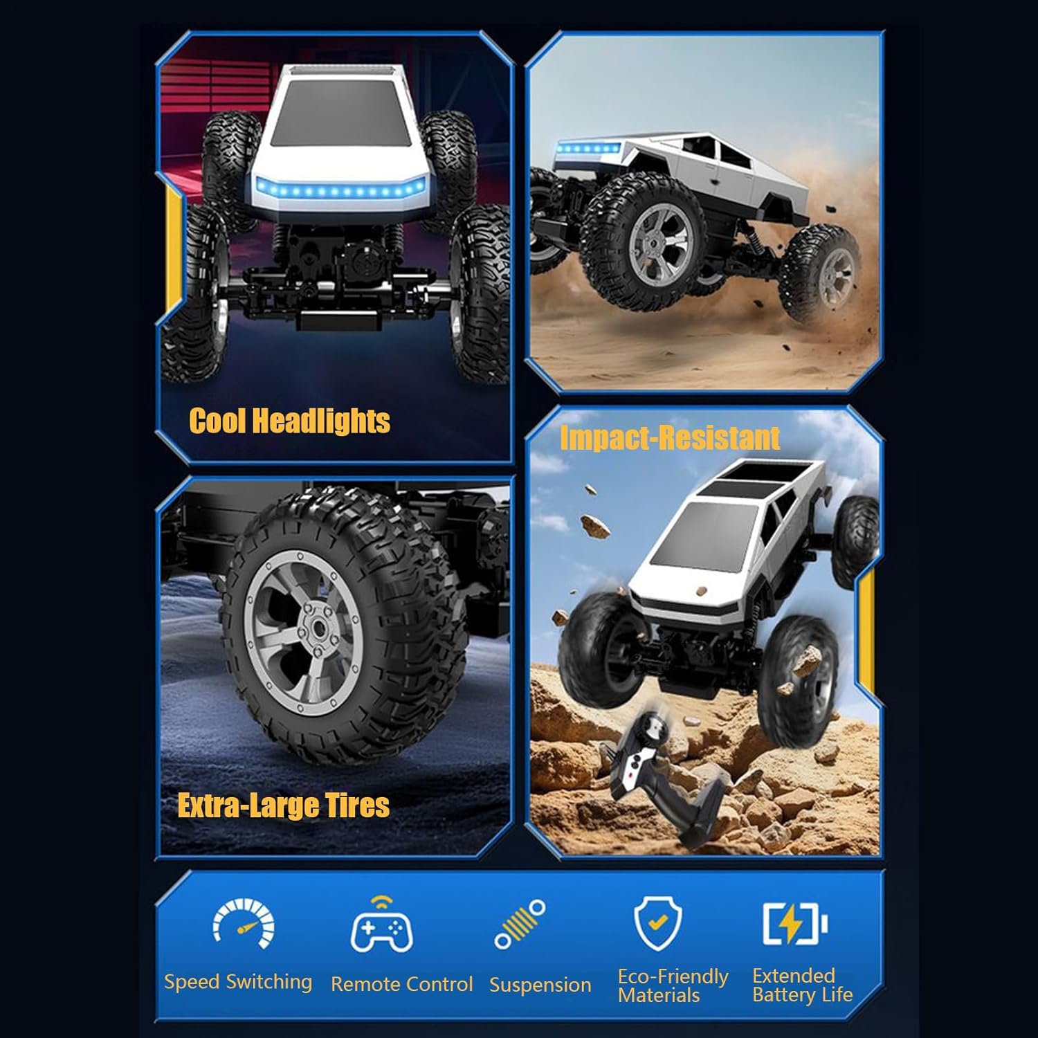 Struttura Flessibile e Robusta: Le macchine radiocomandate sono progettate con una carrozzeria ad alta durezza che offre un'eccellente resistenza agli urti durante le sessioni di gioco intense, garantendo prestazioni e riducendo i rischi di , ideali per avventure all'aperto o gare al chiuso con amici e famiglia Regalo Ricercato: Questa auto radiocomandata per bambini funziona come un regalo significativo per trasmettere affetto, deliziando i piccoli durante le festività come Natale e Capodanno mentre migliora l'allegria con la sua esperienza di gioco avvincente e piacevole Prestazioni Ovunque: Auto rc per bambini con rotazione a 360 gradi su terra e acqua, dotata di gomme robuste per eccellente che consentono di affrontare terreni impervi con facilità, garantendo ore di divertimento in ambienti vari e avventure emozionanti senza limiti Avventura su Tutti i Terreni: Dotata di telecomando impermeabile e luci LED, assicura operatività affidabile in diverse condizioni, ideale per corse notturne e intrattenimento familiare mentre mostra il design elegante su qualsiasi superficie con illuminazione integrata e protezione dagli schizzi Soluzione di Gioco Dinamica: Il camion rc arricchisce il gioco fisico e interattivo con un'esperienza pratica, ideale per un divertimento prolungato all'aperto grazie a 30 minuti di autonomia. È l'opzione perfetta per sostituire i videogiochi e favorire il coinvolgimento attivo durante gite in famiglia o avventure in giardino, stimolando il movimento.