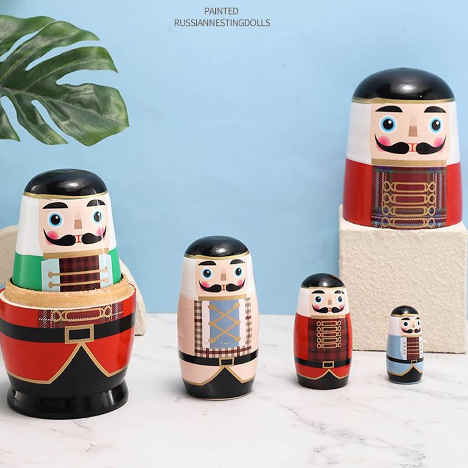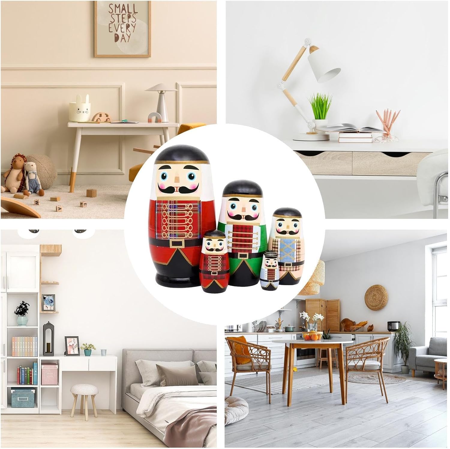 Prezioso: Porta gioia a famiglia, partner e amici in compleanni, festività, Natale o Capodanno con queste matriosche, che comunicano con grazia sentimenti d'amore e cura creando ricordi duraturi insieme Divertimento ed Estetica: Queste matriosche uniscono il gioco al fascino visivo, abbelliscono gli ambienti con opportunità creative di insegnamento artigianale e aggiungono calore durante le feste o per l'uso quotidiano, ideali per decorazioni e attività educative Design a Strati Multi: Queste matriosche presentano una struttura a nidificazione progressiva che stimola la curiosità nel scoprire ogni bambola, favorisce il risparmio di spazio grazie alla compatta impilabilità e funge da giocattolo educativo per sviluppare il gioco immaginativo dei bambini attraverso l'esplorazione tattile e visiva Design artistico dipinto a mano: Realizzate con tecniche tradizionali di pittura a mano e lucidate per una superficie liscia, queste matriosche schiaccianoci mostrano una manodopera squisita. Sono una scelta divertente per l'interazione genitore-figlio o per l'arredamento domestico, evidenziando il valore artistico e il fascino senza . Materiale Pregiato: Bilanciamento tra sicurezza e valore da collezione con legno di tiglio naturale, resistente a crepe e deformazioni grazie a processi meticolosi, ideale per intenditori di creazioni artigianali ricercate e nel loro appeal estetico