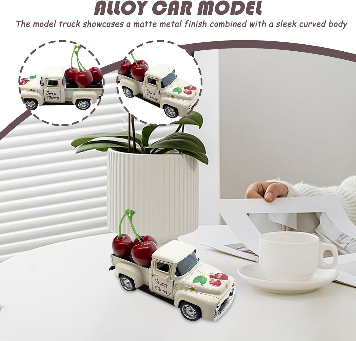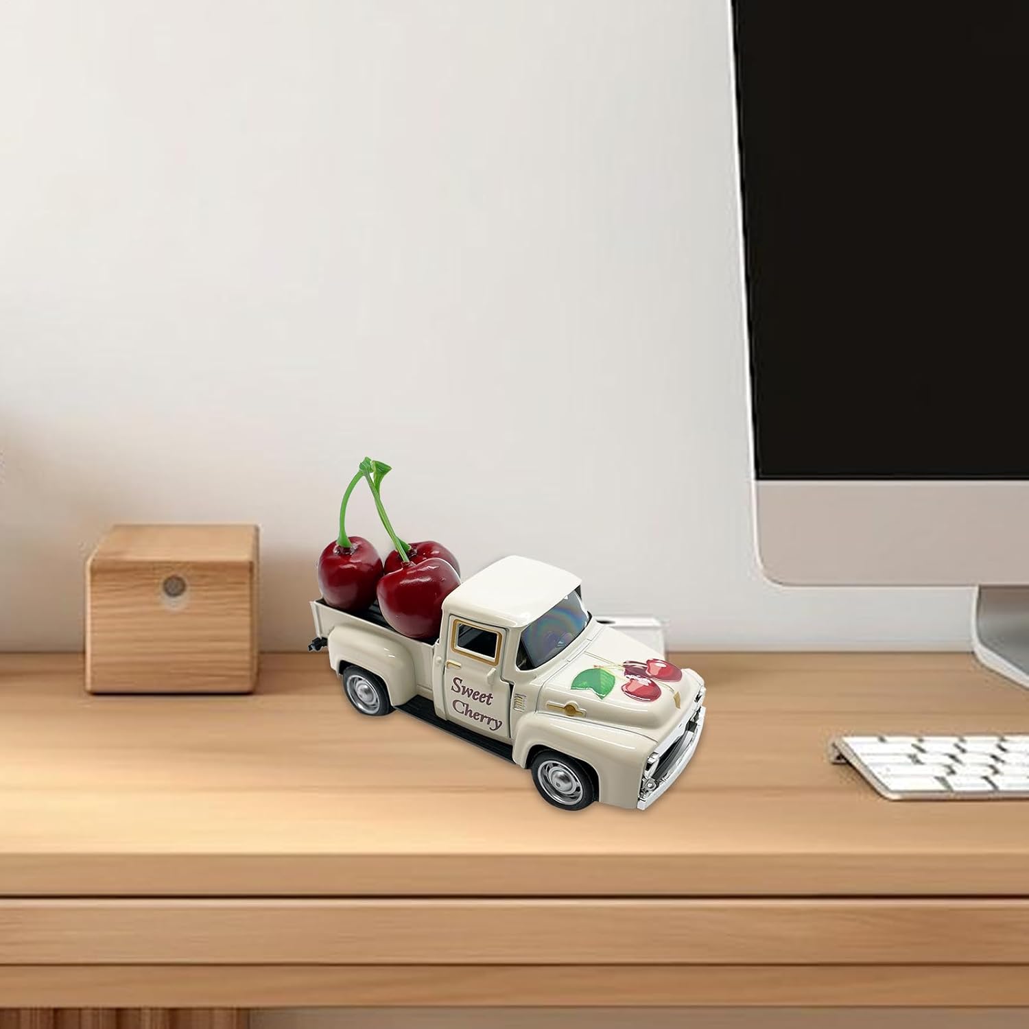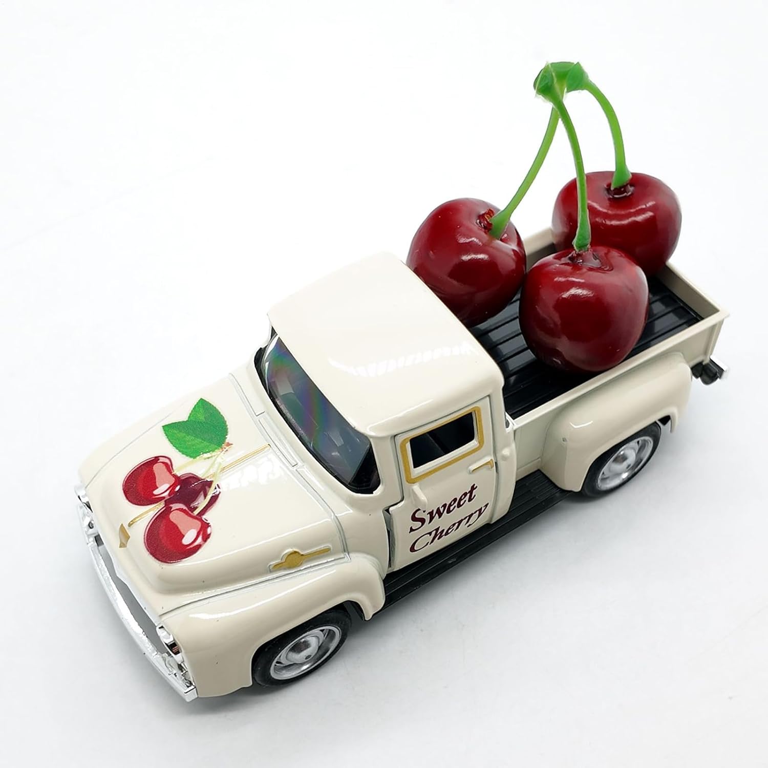 Materiale Robusto: Realizzato in lega di zinco e materiali avanzati, questo camion modello resiste alla ruggine, include parti ammortizzanti e offre una superficie opaca morbida che riproduce un'estetica Tetto con Frutti Dettagliati: Ottieni un aspetto autentico con dettagli di gambi flessibili che sostengono frutti decorativi in tonalità gradiente rosso, offrendo ottima resistenza e un'estetica giocosa e naturale Stile Automobilistico Nostalgico: Ispirato al design anni '50, unisce finitura metallizzata opaca a curve raffinate. Dettagli cromati un'eleganza vintage autentica, ideale per collezioni. Dettagli realistici: porte definita e fari luminosi completano ruote a raggi con lavorazione precisa, garantendo autenticità nel camionismo in Impiego Multifunzione: Si inserisce senza sforzo in ambienti diversi: ottimo per arricchire scrivanie, eccelle come pezzo protagonista in esposizioni e fornisce utilità aggiuntiva come accessorio fotografico per contenuti creativi