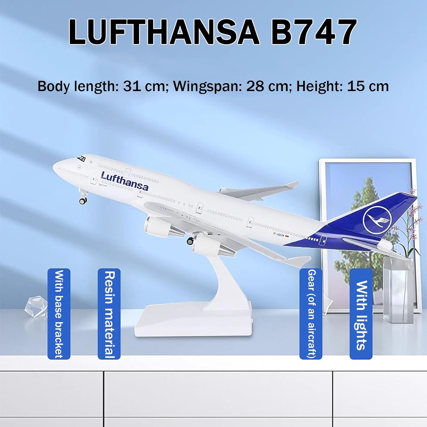 Design di precisione: il modello misura circa 28-30 cm ed è meticolosamente realizzato sulla base del B747 originale, garantendo un autentico pezzo da esposizione for gli amanti dell'aviazione. Materiali di alta qualità: realizzato in plastica ABS di alta qualità con una solida base trapezoidale e un supporto in ABS, questo modello è stabile e visivamente accattivante. Utilizzo versatile: perfetto for la decorazione di uffici, case o negozi; può anche essere un regalo aziendale premuroso, un regalo di compleanno o una sorpresa festiva for appassionati di modellismo e collezionisti. Maestria artigianale: ogni caratteristica, dai motori alla fusoliera, rispecchia i dettagli intricati del vero aereo, offrendo un impatto visivo sorprendente che cattura gli spettatori. Confezione elegante: il nostro modello è confezionato in una scatola protettiva dal design accattivante, che lo rende un'ottima scelta come regalo o come oggetto da collezione, garantendo al contempo una conservazione sicura.