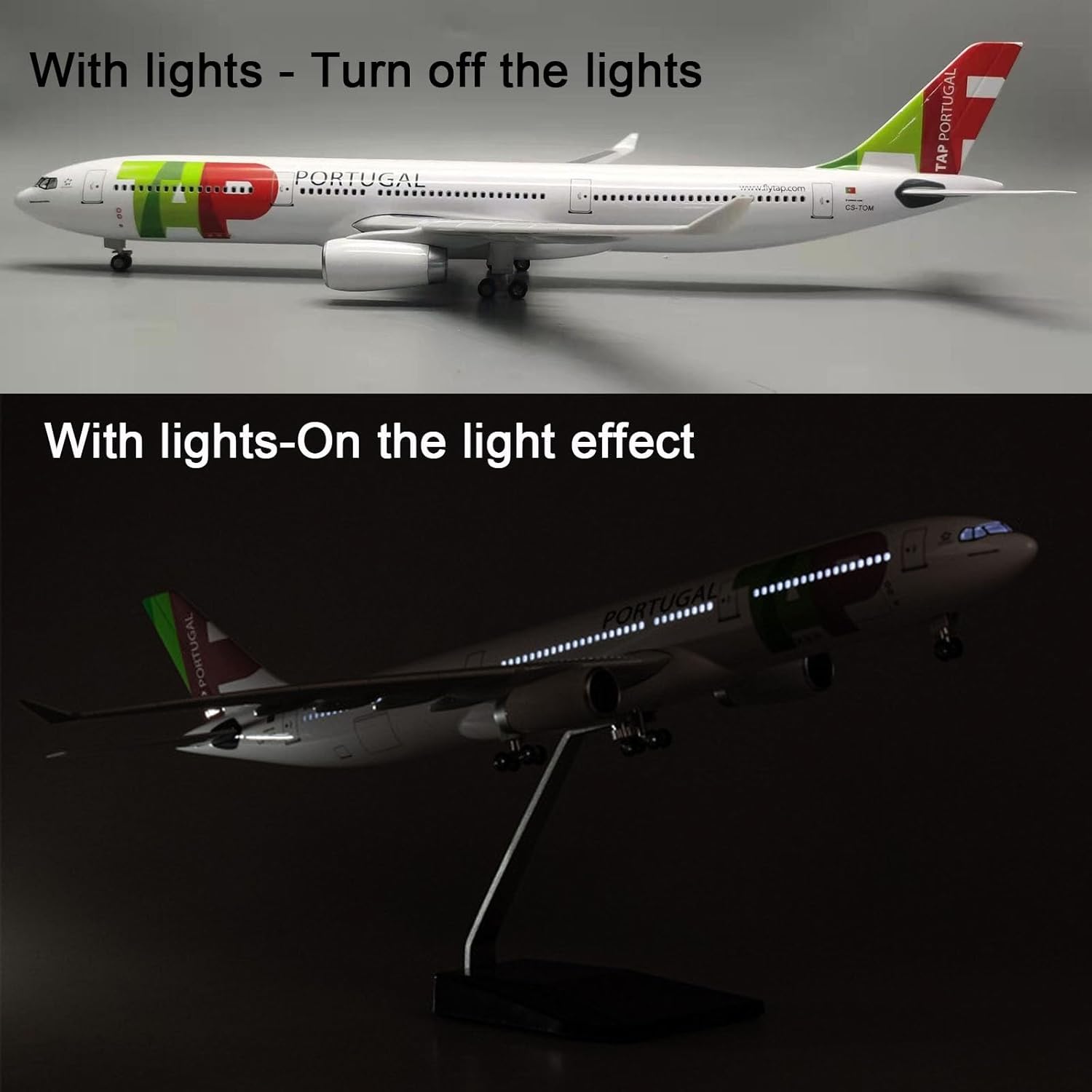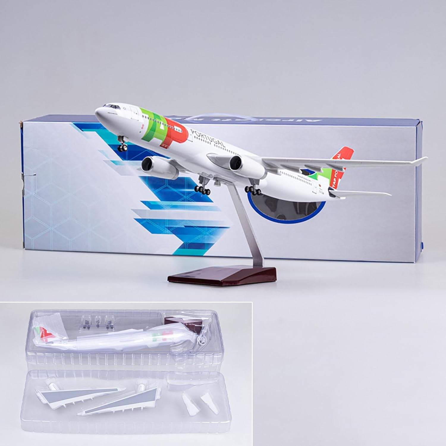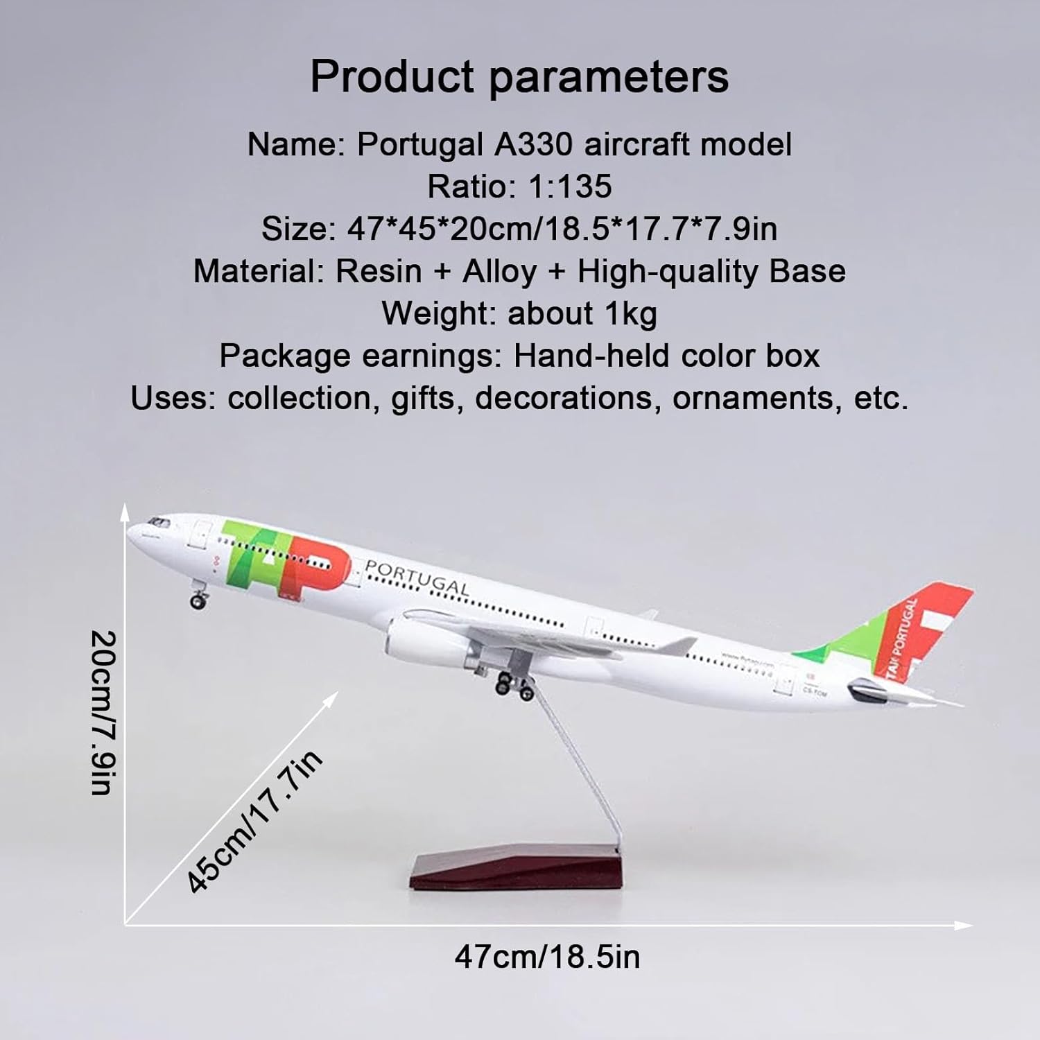 Aeroplano modello in scala reale: modello di aereo a reazione Portugal A330 in scala 1:135 da 18,1 pollici con ruote, 18,1 x 17,7 x 7,3 pollici. Artigianato raffinato: il modello dell'aereo Portugal A330 adotta una fusoliera in resina di alta qualità, una base solida e una staffa in lega metallica. Il modello dell'aereo è molto aerodinamico. Inoltre, il colore della carrozzeria è ricco e mette in risalto la bellezza di molti dettagli. Modello di jet restaurato: modello di aereo Portugal A330 in scala 1:135, dimensioni: lunghezza dell'aereo (18,1 pollici), larghezza (17,7 pollici), base dell'aereo e altezza complessiva (7,3 pollici), peso circa 1 kg, la scala ridotta consente una migliore visualizzazione dei modelli di aerei in qualsiasi momento. Design semplice con fibbia: facile da montare e installare, basta inserire le ali nello slot for schede e utilizzare lo slot speciale assemblato for fissare la base e la fusoliera. L'installazione è molto semplice, rendendo la visualizzazione sul desktop più veloce e comoda. Stabile e altamente restaurato, è un'ottima scelta for chi ama collezionare modelli di aerei. Regalo da collezione: il modello di aereo è dotato di una base pronta for essere esposta, è una bella decorazione e un oggetto da collezione for l'ufficio e la casa ed è un regalo perfetto for gli appassionati di aviazione e i collezionisti.
