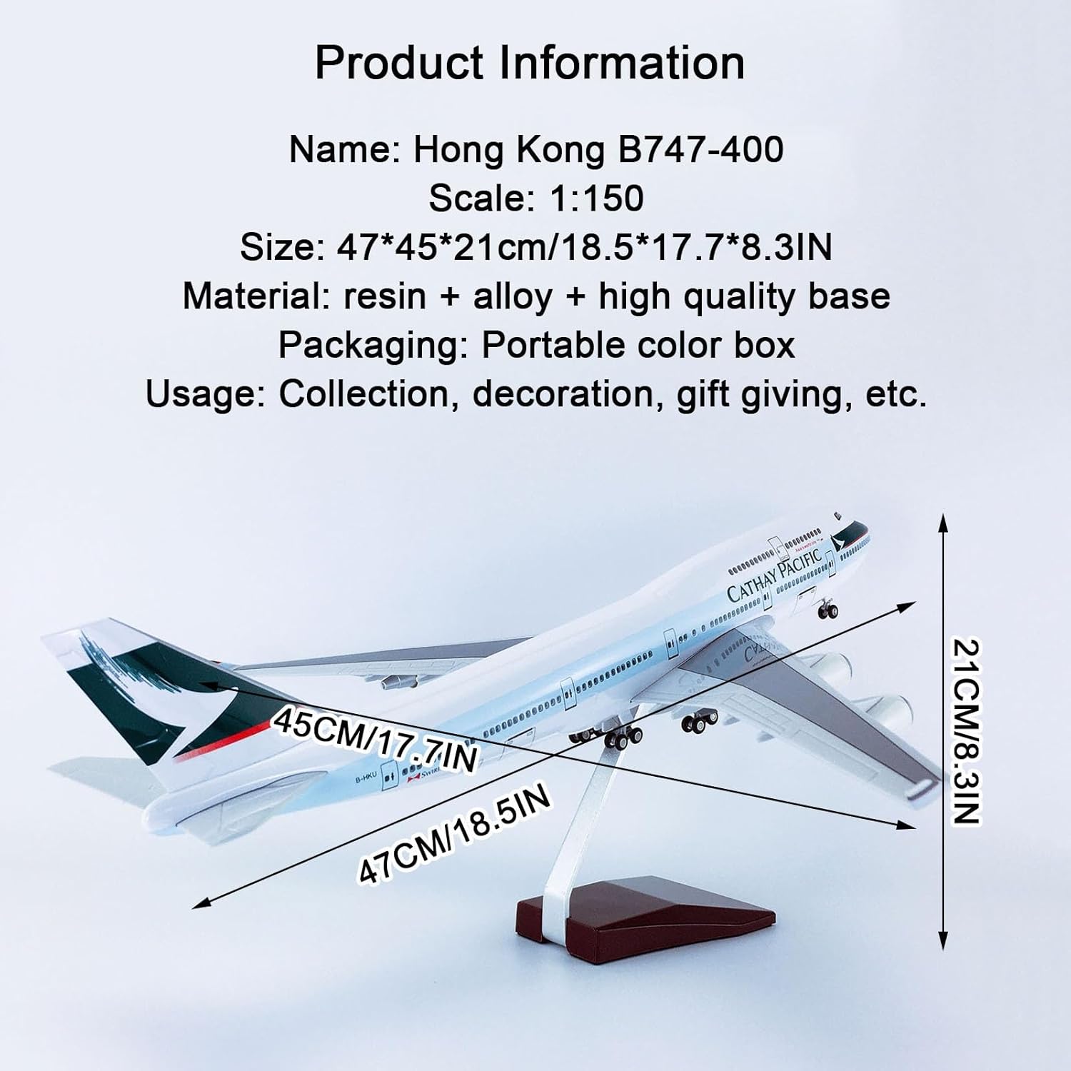 Aeroplano modello in scala realistico: modello di aereo a reazione Hong Kong B747-400 in scala 1:150 da 18,5 pollici con ruote, 18,5 x 17,7 x 8,3 pollici. Squisita fattura: il modello dell'aereo Hong Kong B747-400 adotta una fusoliera in resina di alta qualità, una base solida e una staffa in lega metallica. Il modello dell'aereo è molto aerodinamico. Inoltre, il colore della carrozzeria è ricco e mette in risalto la bellezza di molti dettagli. Modello di jet restaurato: modello di aereo Hong Kong B747-400 restaurato in scala 1:150, dimensioni: lunghezza dell'aereo (18,5 pollici), larghezza (17,7 pollici), base dell'aereo e altezza complessiva (8,3 pollici), peso circa 1 kg, la scala ridotta consente una migliore visualizzazione dei modelli di aerei in qualsiasi momento. Design semplice con fibbia: facile da montare e installare, basta inserire le ali nell'apposito slot Snap e utilizzare lo speciale slot Snap assemblato for fissare la base e la fusoliera. L'installazione è molto semplice, rendendo la visualizzazione sul desktop più veloce e comoda. Stabile e altamente restaurato, è un'ottima scelta for chi ama collezionare modelli di aerei. Regalo da collezione: il modello di aereo è dotato di una base pronta for essere esposta, è una bella decorazione e un oggetto da collezione for l'ufficio e la casa ed è un regalo perfetto for gli appassionati di aviazione e i collezionisti.
