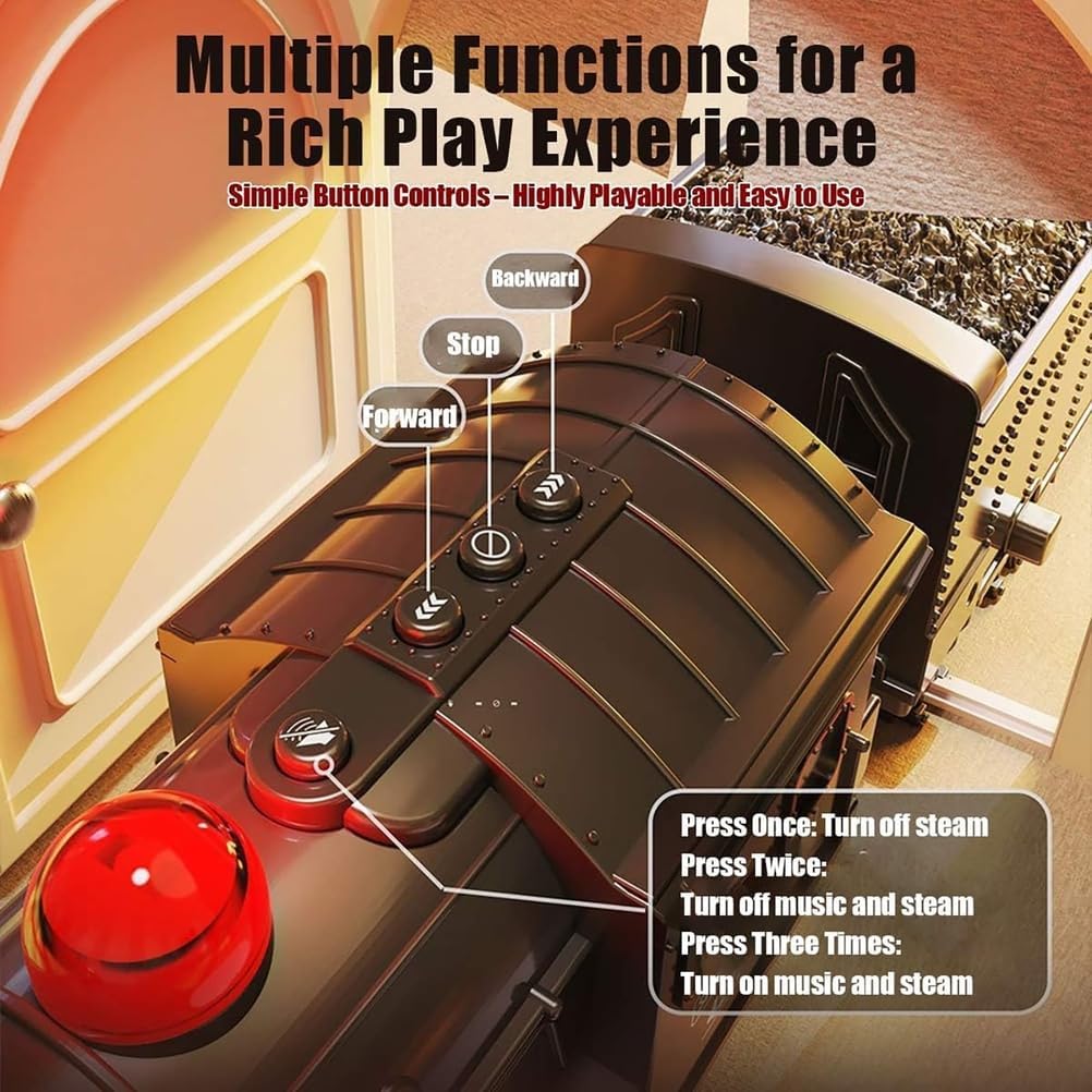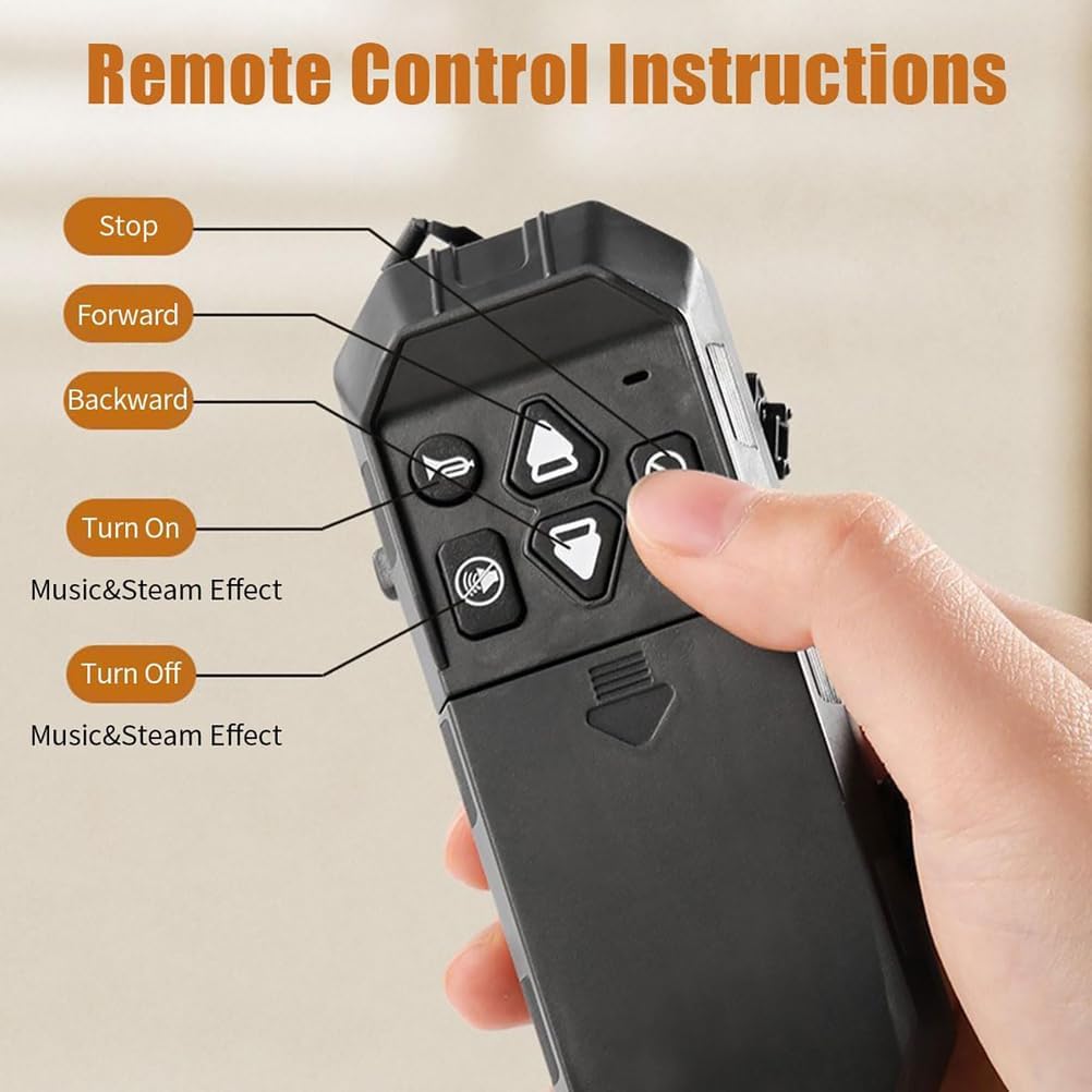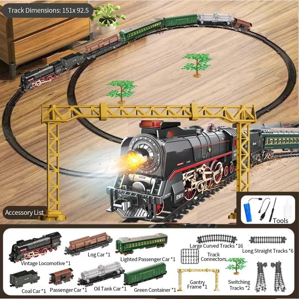Set completo di trenino a vapore telecomandato: questo set deluxe include una locomotiva a vapore, una carrozza passeggeri, un vagone carbone, un vagone merci, componenti ferroviari dettagliati, telecomando e cartoncini decorativi a tema natalizio Funzionamento con telecomando multifunzione: il treno elettrico è azionato tramite un telecomando intuitivo che offre movimento avanti/indietro, regolazione della velocità, attivazione del vapore/suono e funzione di avvio/arresto, migliorando l'immersione e il controllo. Sistema di tracciato personalizzabile: include una combinazione di curve, rettilinei e binari a X per un design creativo e modulare. Perfetto per costruire configurazioni ferroviarie uniche che si adattano a una varietà di ambienti e allestimenti. Effetti vapore, luci e audio migliorati: dotato di tripla uscita vapore (camino e doppia presa d'aria alla base) per un realismo visivo dinamico. I fari funzionanti e i suoni sincronizzati della locomotiva danno vita al classico viaggio in treno con un effetto spettacolare Centrotavola stagionale ed espositore da collezione: oltre ad essere un modello funzionale, questo trenino a vapore è un eccellente centrotavola festivo o un oggetto da collezione