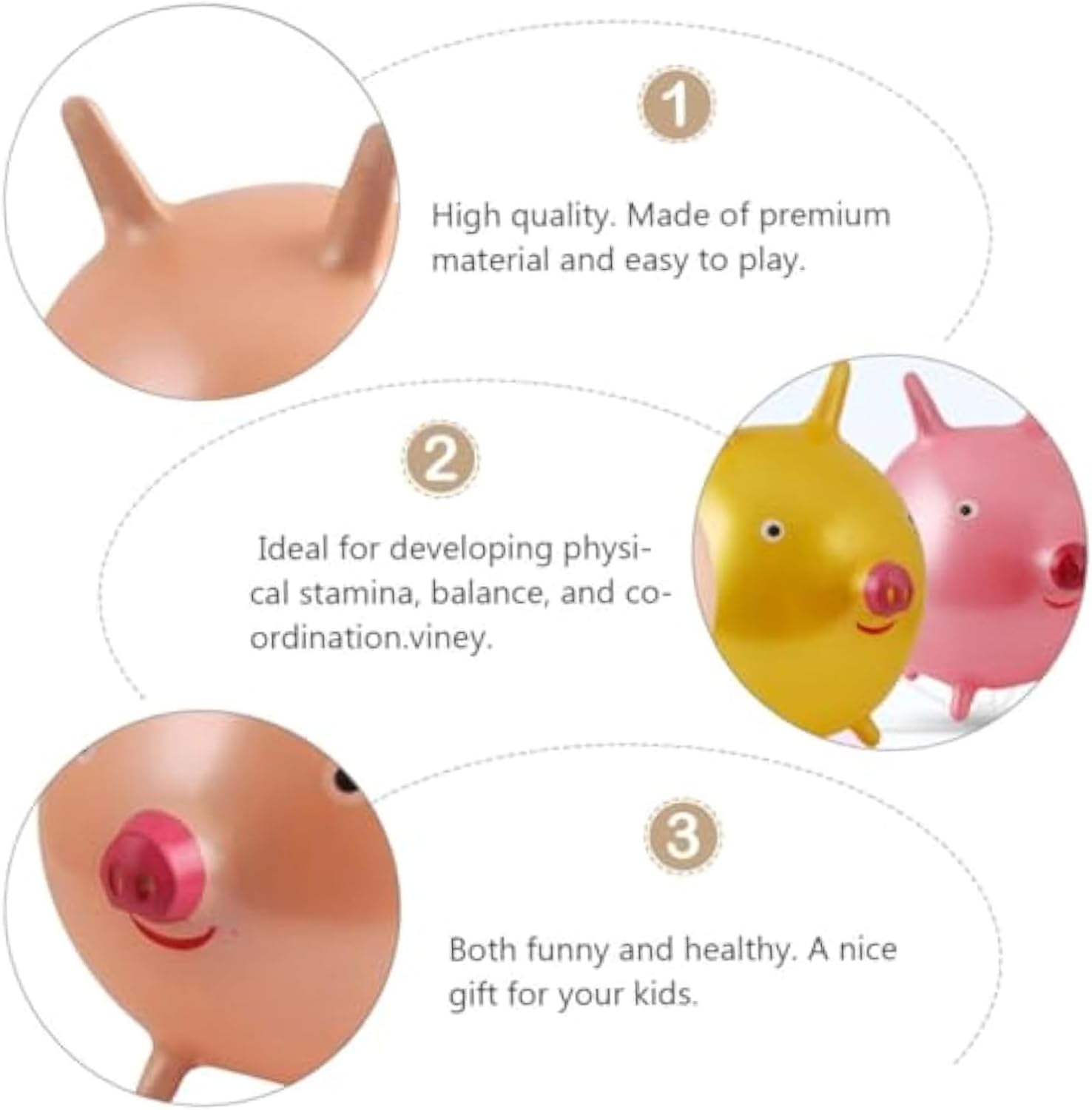 Design rinforzato per una maggiore stabilità: lo spessore rinforzato della palla rimbalzante garantisce una lunga durata resistendo efficacemente alla perdita d'aria e mantenendo un rimbalzo costante. Ciò lo rende ideale per attività ad alta energia a casa, a scuola o nei parchi giochi dove prestazioni affidabili sono fondamentali per un divertimento ininterrotto. La struttura robusta supporta ore di divertimento senza sacrificare il rimbalzo o la stabilità dimensionale. Esperienza di gioco avvincente: con il suo simpatico design a orecchie di animale e i vivaci accenti dei cartoni animati, questa palla rimbalzante trasforma l'attività fisica quotidiana in un'avventura emozionante. Risveglia la creatività e la fantasia durante il gioco per i bambini di tutte le età in diversi ambienti, sia interni che esterni, rendendo ogni movimento un'esperienza speciale. Ore di divertimento durante l'attività fisica: grazie al loro funzionamento affidabile su superfici piane, queste palline rimbalzanti garantiscono un divertimento duraturo. Supportano sia il gioco interattivo genitore-figlio che il gioco individuale, creando opportunità di movimento gioioso in molteplici ambienti, incoraggiando i bambini a essere attivi. Ausilio per la stimolazione vestibolare: progettate per supportare l'integrazione sensoriale, le palline rimbalzanti per bambini migliorano le funzioni propriocettive e tattili e supportano lo sviluppo del sistema vestibolare. Ciò garantisce un migliore mantenimento dell'equilibrio durante scenari di gioco dinamici come esercizi di salto o salto, promuovendo così la salute vestibolare. Rimbalzo sicuro e divertente: con maniglie appositamente progettate, la palla rimbalzante per bambini consente ai bambini di trovare facilmente supporto mentre sono seduti su di essa, fornendo maggiore sicurezza e controllo. Il design ergonomico della maniglia migliora l'equilibrio e crea un'esperienza di rimbalzo affidabile e divertente, sia all'interno che all'esterno in giardino, per un divertimento duraturo.