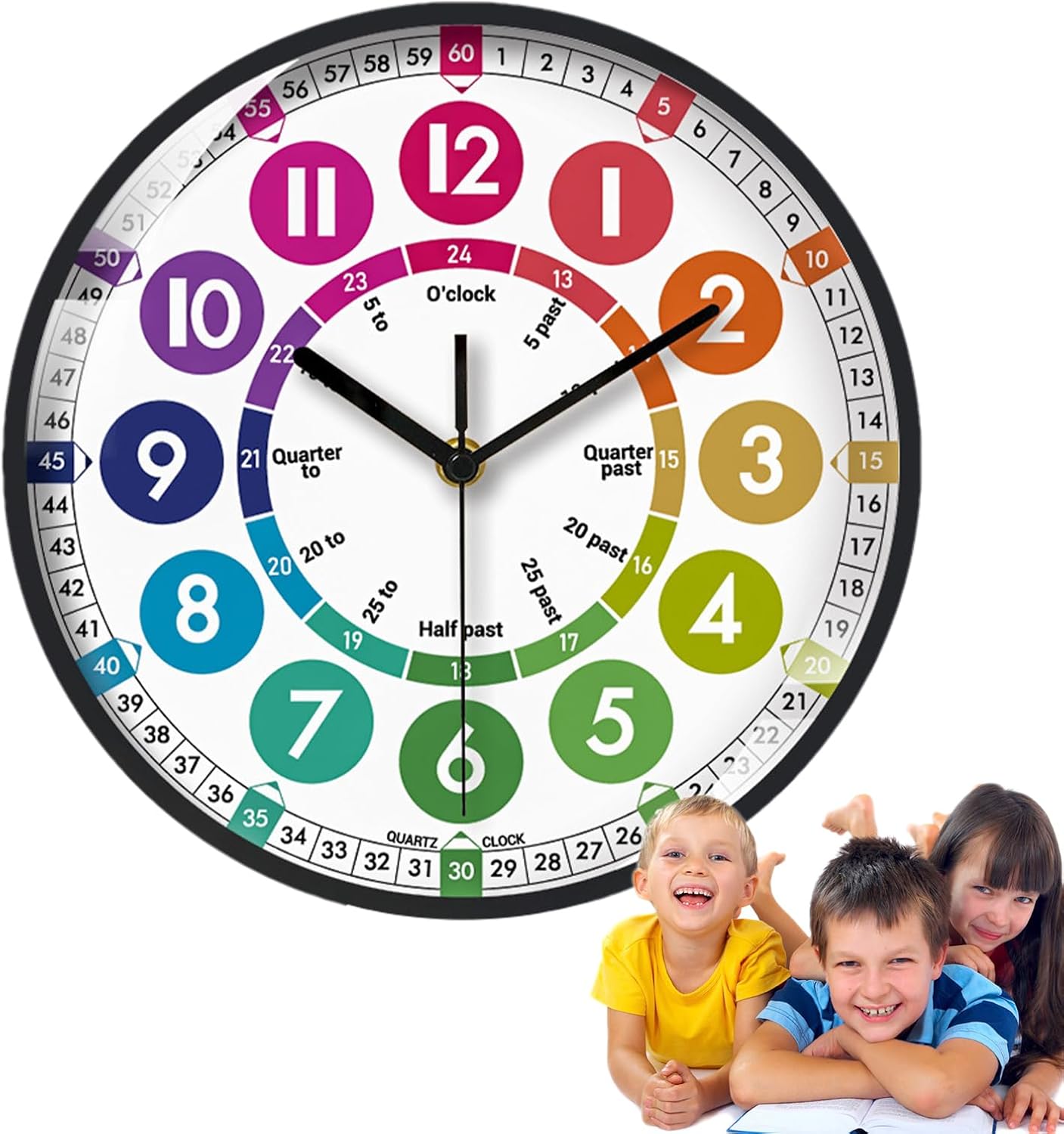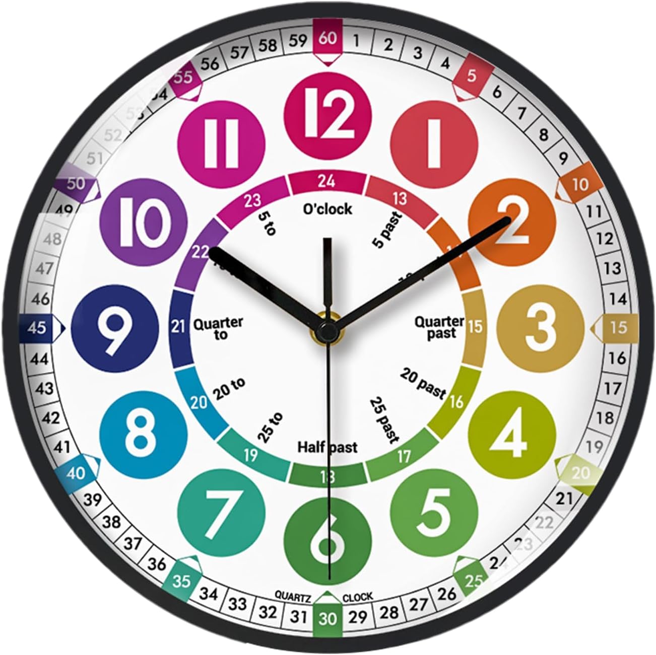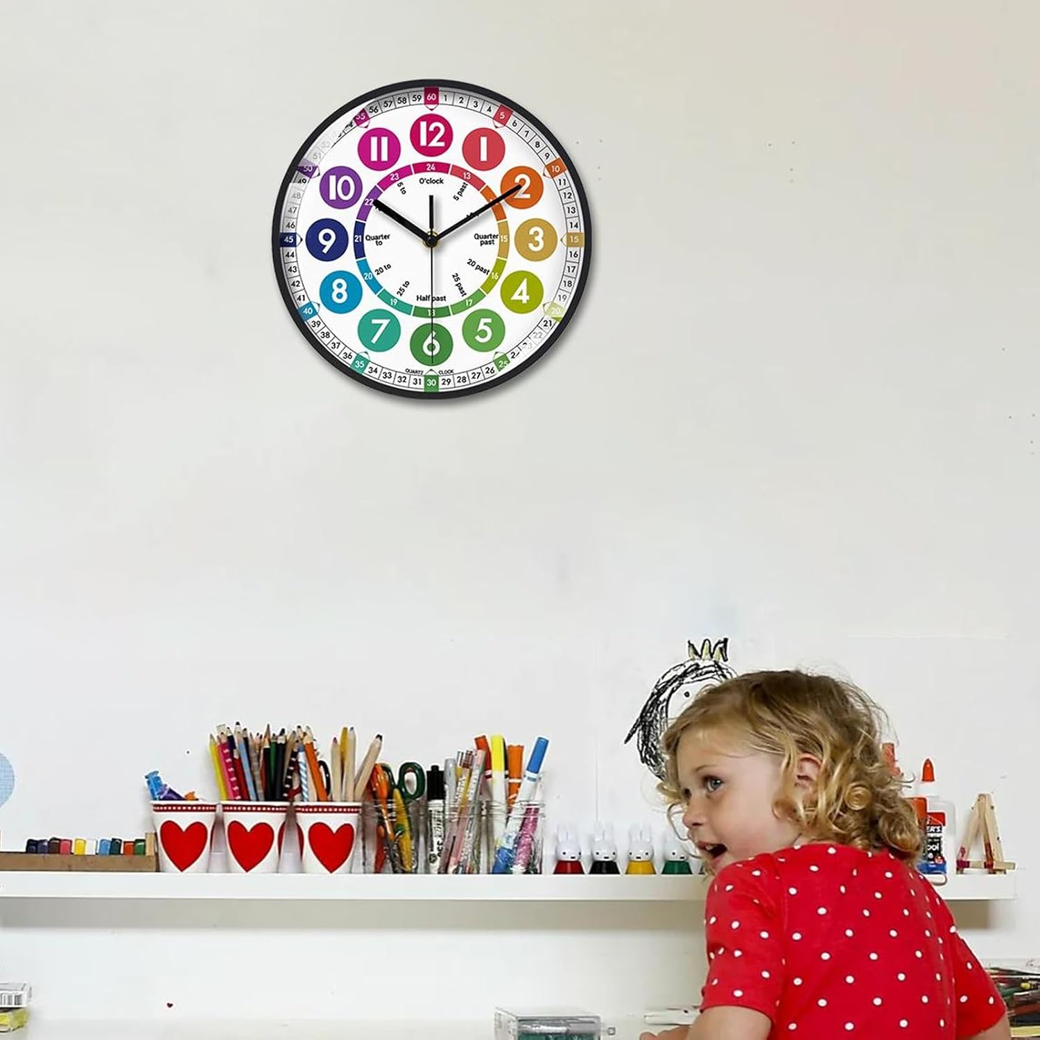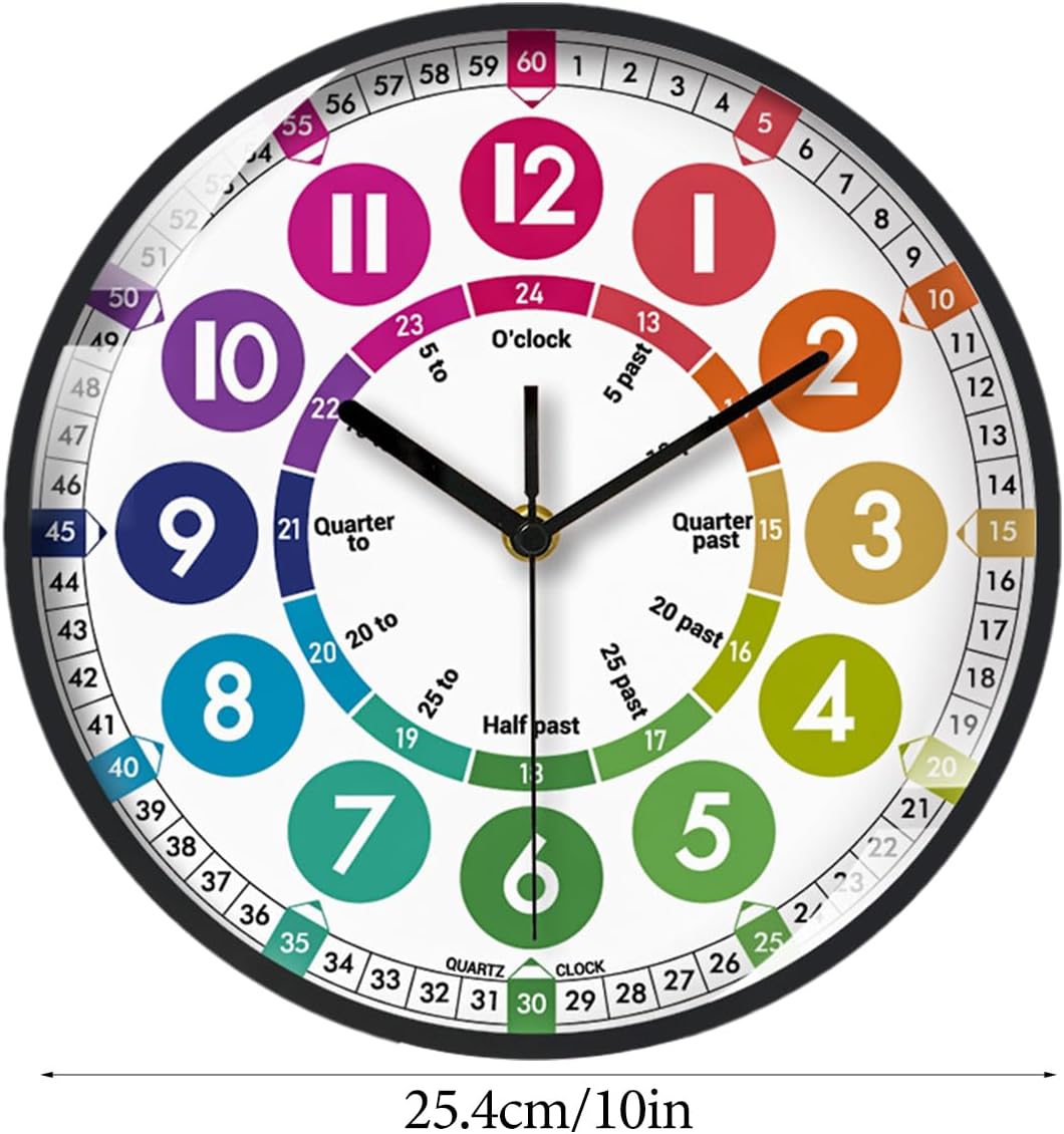 Interessante divisione dei numeri: inizia l'amore per l'apprendimento nei bambini con il nostro orologio per i bambini. Disegni colorati e divisioni intriganti di numeri e scale sul volto 'orologio attirano la loro attenzione e aumentano il loro interesse per gli orologi. mentre la loro curiosità aumenta e la loro comprensione cresce. Dimensioni adeguate: aiutare i bambini a imparare le abilità di per il nel modo divertente. Il nostro orologio di apprendimento da 25x25 cm, realizzato in materiale ABS, garantisce durata e sicurezza, rendendolo una scelta intelligente per la stanza di ogni bambino o l'area di studio. Apprendimento completo del : impara a distinguere gli orologi in più modi con il nostro orologio di apprendimento. Leggi diversi momenti di orologio da parete e combina senza sforzo il formato 12/24 per il facile. Migliore gestione del : con un movimento di scansione silenzioso, questo orologio da parete silenzioso garantisce tempi accurati senza rumore, rendendolo un'aggiunta perfetta all'ambiente di apprendimento di tuo figlio. Installazione semplice: il nostro orologio per i bambini può essere eseguito su una singola batteria (batterie non incluse). Sostituire la batteria è semplice e veloce e non influenzerà la durata del movimento o l'accuratezza 'orologio.