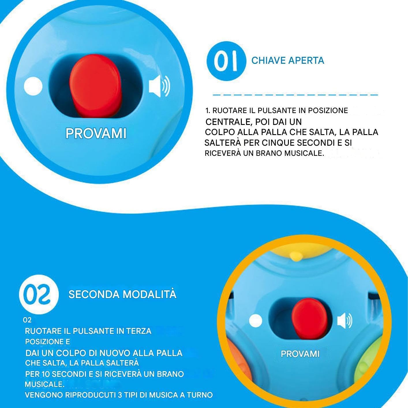 Coinvolgimento Guidato: Rafforza le connessioni emotive e stimola lo sviluppo mentale tramite interazioni genitore-bambino, con effetti sonori giocosi che ispirano curiosità ed esperienze sensoriali strutturate. Intrattenimento Educativo:Pallina sensoriale a d'ape con movimento rotatorio, effetti vibranti e suoni musicali promuove abilità tattili e incoraggia attività di inseguimento spontaneo per coinvolgere attivamente i bambini nel gioco interattivo. Strumento Divertente Flessibile:Adatto a gattonamento e primi passi, favorisce l'interazione sicura con animali domestici e si utilizza facilmente in interni o esterni. Soluzione sensoriale portatile che si adatta a vari ambienti con design versatile per esperienze coinvolgenti Promuove Raggiungere e Gattonare: Colorata intensamente e di dimensioni adatte alle manine, la palla sensoriale migliora la coordinazione occhio-mano motivando i bambini a raggiungere, gattonare ed esplorare, favorendo lo sviluppo naturale delle abilità motorie attraverso il gioco coinvolgente Design anti-soffocamento: Struttura senza componenti staccabili, realizzata in materiale durevole per uso prolungato durante il gioco sensoriale infantile con palla da mordere
