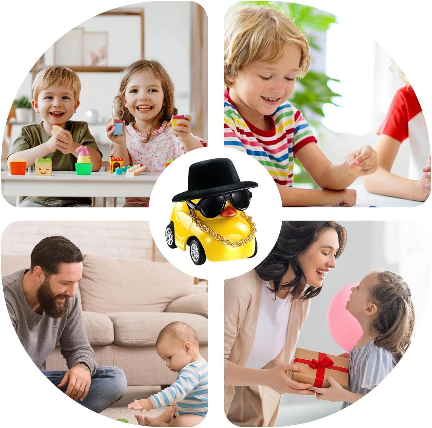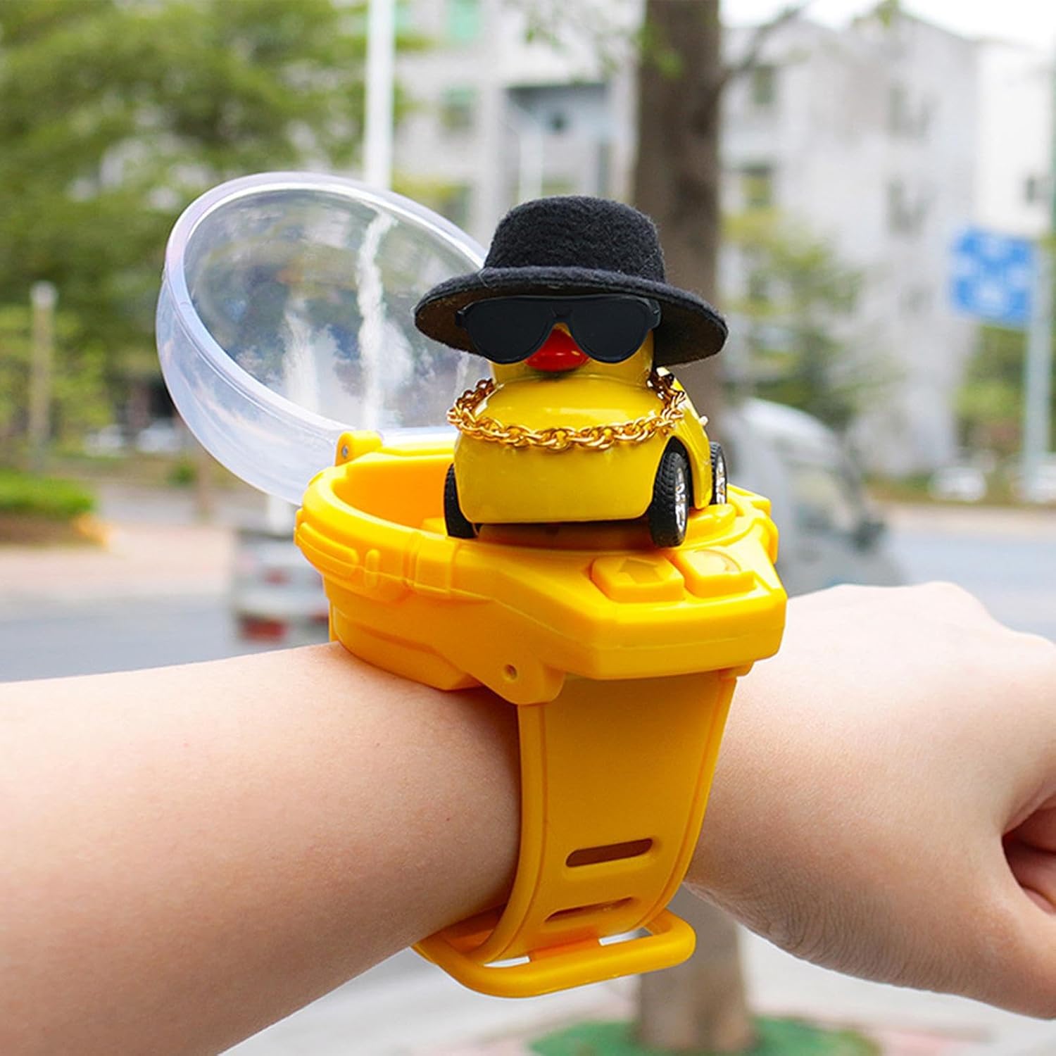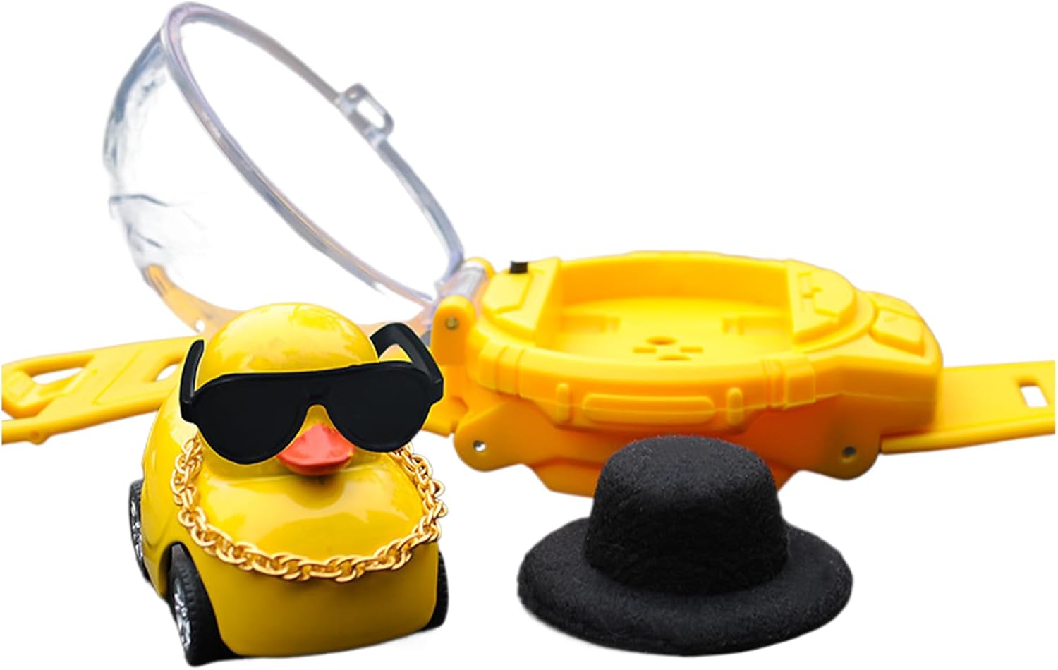 Unique Watch Controller: The wristwatch-style controller makes playtime extra fun, allowing kids to drive their car using just their wrist while enjoying hands- convenience and futuristic play experiences anytime Adorable Duck Design: Featuring a cute duck theme and bright yellow color, this remote car captures children's attention and sparks their imagination with a friendly and playful appearance that makes racing more exciting Rechargeable and Eco Friendly: With USB charging capability, this small RC car eliminates the need for batteries, making it a more eco-friendly and cost-effective toy for everyday use Compact and Travel Friendly: The small car fits snugly into the included watch base, making it easy to carry, store, and take on the go, whether to parks, playdates, or road trips without taking up space LED Lights and Racing Fun: Equipped with vibrant LED lights, this toy enhances visibility and excitement during low-light play, adding dynamic action to each race and boosting engagement for boys and girls