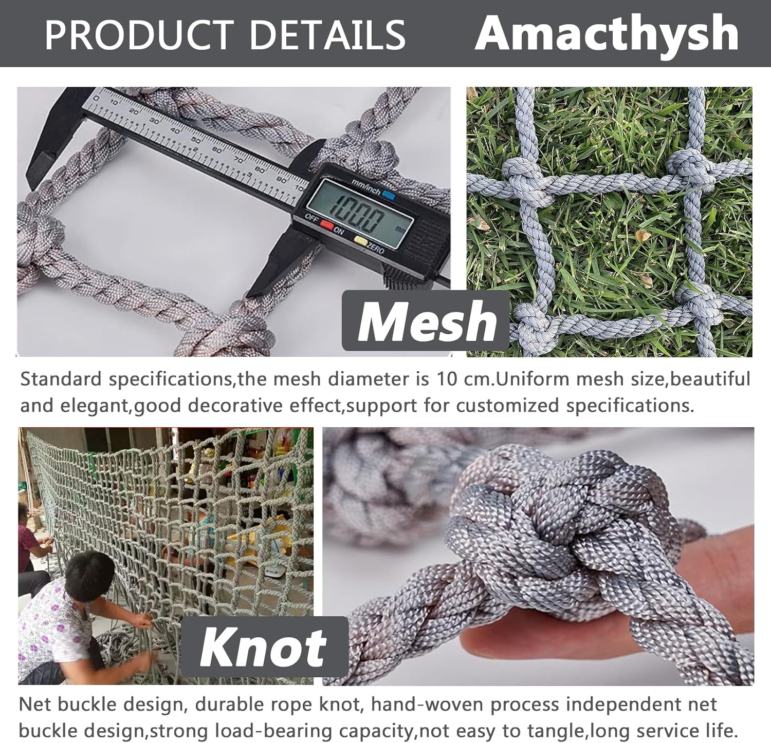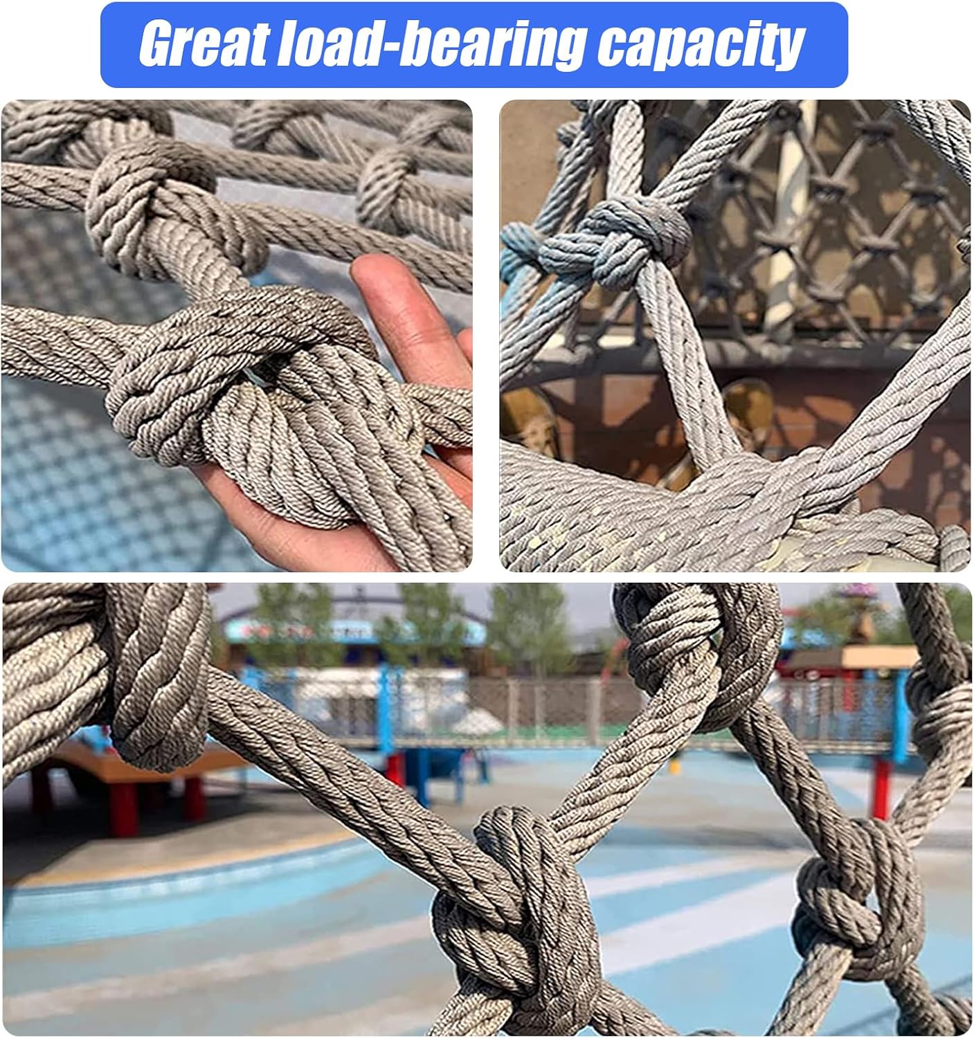 Rete da arrampicata per parchi giochi all'aperto: questa rete da arrampicata resistente e sicura è perfetta per i bambini che vogliono migliorare la loro forza e coordinazione. Ideale per le aree gioco, offre una superficie sicura per l'arrampicata, promuovendo il gioco attivo e l'esercizio fisico. Facile da installare, questa rete da arrampicata è un'eccellente aggiunta a qualsiasi parco giochi o cortile, garantendo divertimento e sicurezza ai vostri bambini. Installazione semplice: i nostri accessori per l'arrampicata sono progettati per un'installazione semplice, consentendoti di migliorare il tuo set da gioco con il minimo sforzo. Crea un'area di arrampicata e gioco sicura per i tuoi bambini, incoraggiando il gioco attivo e il divertimento all'aria aperta. Resistenti e sicuri, questi accessori sono perfetti per qualsiasi set da gioco, garantendo ore di divertimento ai bambini. Reti da arrampicata versatili: personalizza qualsiasi dimensione tu abbia bisogno! Le nostre reti da arrampicata di alta qualità sono disponibili in diverse specifiche per soddisfare le tue esigenze. Che sia per uso ricreativo o per arrampicata professionale, scegli la dimensione perfetta per te. Ideali per la sicurezza, il gioco o l'allenamento, queste reti resistenti sono progettate per prestazioni e affidabilità ottimali. Rete di corde ampiamente utilizzata: scale, balconi, soppalchi, finestre, giardini, arrampicata, altalene, amache, ponti sospesi, centri commerciali, ristoranti, parchi di divertimento, negozi di abbigliamento, reti per appendere i vestiti, reti per soffitti, reti decorative, reti di protezione delle piante, reti di tunnel, reti di bloccaggio, reti infrangibili, reti di isolamento, ecc. Specifiche multiple: qualsiasi dimensione di cui hai bisogno può essere personalizzata. Forniamo reti di corda di diverse dimensioni. Puoi scegliere la dimensione della rete da arrampicata appropriata in base allo scopo.