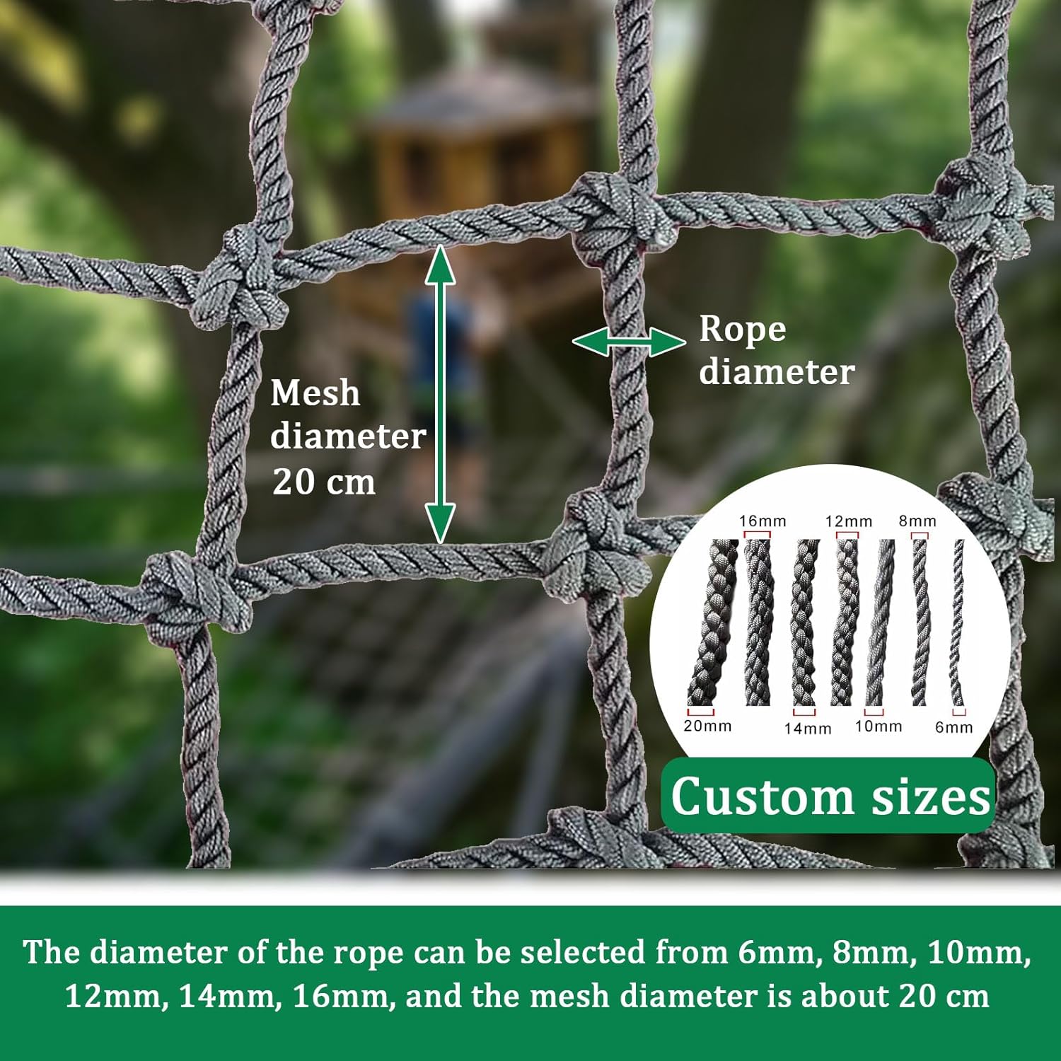 Rete da arrampicata personalizzata per parchi giochi: ideale per l'allenamento all'arrampicata, questa rete protettiva presenta una spaziatura delle maglie di 20 cm e una corda resistente con un diametro di 10 mm. Personalizza la tua rete da arrampicata in base alle tue esigenze specifiche con opzioni di spaziatura delle maglie, spessore della corda, lunghezza, larghezza e colore. Perfetta per migliorare la sicurezza e il divertimento in qualsiasi area gioco o ambiente di allenamento. Rete da arrampicata intrecciata a mano: questa rete di sicurezza per bambini è progettata per l'uso all'aperto, con una robusta struttura intrecciata e nodi resistenti. La sua tessitura multifilo aumenta la robustezza e la resistenza agli urti, garantendo la resistenza alle condizioni più difficili. Ideale per le attività di arrampicata, offre un ambiente sicuro in cui i bambini possono esplorare in tutta sicurezza. Perfetta per parchi giochi e ambienti esterni avventurosi. Rete di sicurezza versatile, adatta a diverse applicazioni interne ed esterne, tra cui case sugli alberi, camion, scale, balconi, asili, parchi divertimento, strutture pubbliche, protezione delle piante e altro ancora. Progettata per migliorare la sicurezza di adulti e bambini, garantendo tranquillità in diversi ambienti. Ideale per l'uso in giardini, edifici e aree di carico. Deposito portatile: la rete da arrampicata per parco giochi è moderatamente morbida, non sbiadisce facilmente, non teme vento e pioggia, ha una lunga durata, è più resistente, facile da installare e smontare. Quando non in uso, può essere ripiegata per una facile conservazione. Applicabile a: varie scene interne ed esterne, case sugli alberi, camion merci, scale, balconi, asili nido, parchi di divertimento, strutture pubbliche, isolamento per la protezione delle piante, edifici, reti da carico, reti da giardino, ecc., possono essere utilizzate per proteggere la sicurezza di adulti e bambini