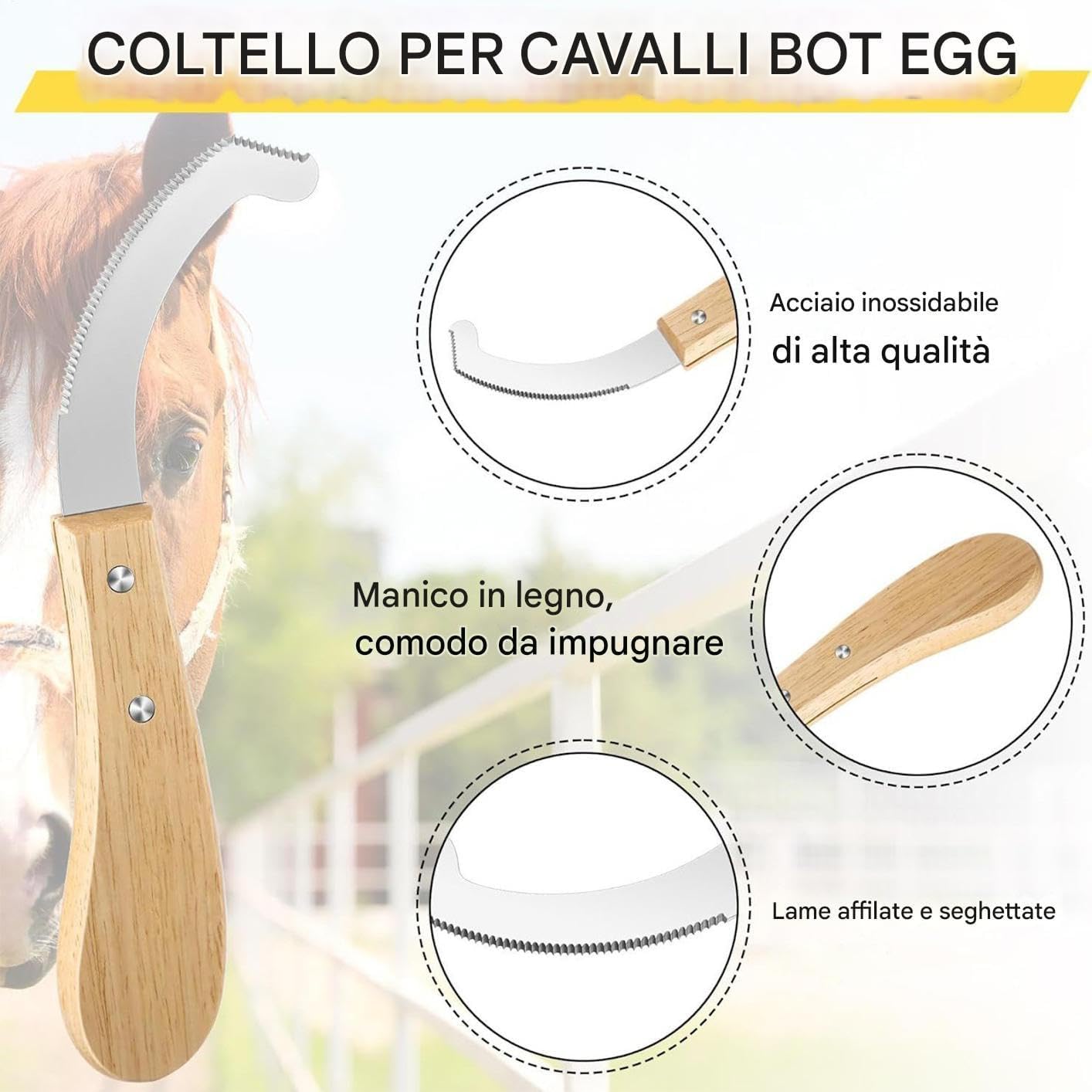 Materiali e Pratici: Questo raschietto per uova di bot fly include materiali durevoli e un design anti-usura, rendendolo ideale per rimuovere detriti e sporco senza sforzo durante le operazioni di manutenzione all'aperto, come in giardini o stalle, garantendo prestazioni costanti e protezione da usura e rotture. Facile da Trasportare: Il rimuovi uova di bot per è ingegnerizzato per essere compatto e portatile, consentendo agli utenti di trasportarlo comodamente nelle loro borse per attrezzi, migliorando la convenienza durante le visite alla stalla o le attività all'aperto. Questo design user-friendly assicura che la toelettatura del cavallo sia semplice e accessibile in vari contesti, supportando una gestione regolare e senza complicazioni. Applicazioni Multiple e Utili: Con la sua capacità di rimuovere le uova di mosca, il Rimuovitore di Uova di Mosca per aumenta il comfort durante gli allenamenti di equitazione all'aperto. Serve come dispositivo ampiamente usato che semplifica gli di ispezione equestre mentre promuove ambienti più sani, garantendo una gestione efficiente delle mosche e un supporto pratico per cavalieri e animali in sessioni di training diversificate. Strumento di Rimozione Sicuro: Progettato con una texture antiscivolo e una curvatura del manico raffinata, il Rimuovi Uova di Bot Fly per fornisce una presa che supporta azioni stabili e precise. Questo si rivela cruciale per gestire aree infestate in modo e con facilità, assicurando una rimozione completa delle uova di bot fly. La presa antiscivolo e il design ergonomico del manico migliorano il controllo e la sicurezza durante l'uso, permettendo operazioni di rimozio Toelettatura Più Semplice: Grazie al design , il rimuovitore di uova di bot fly offre prestazioni di pulizia efficienti, rimuovendo velocemente lo sporco ostinato e semplificando la cura del mantello del cavallo durante le sessioni di toelettatura, per un risultato ottimale con minimo impegno.