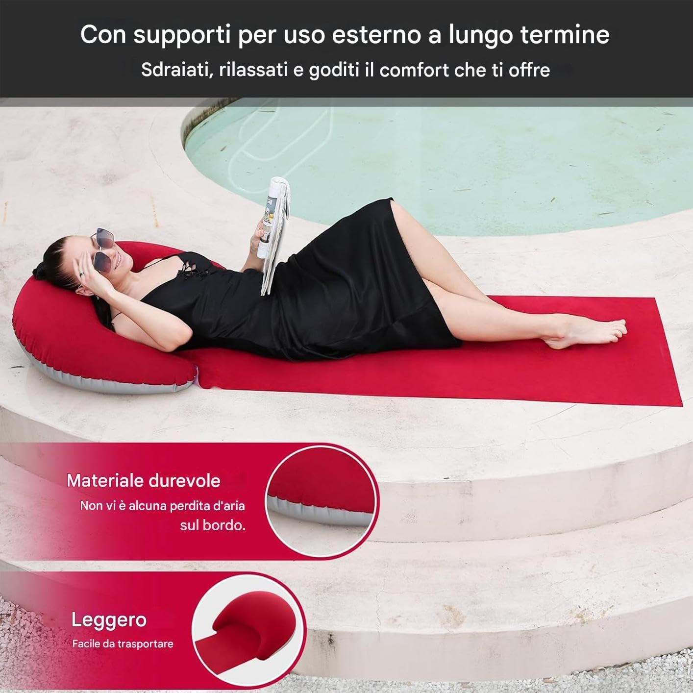 Esperienza Ottimale: Design studiato regala ampio spazio rilassante all'aperto con trasporto agevole per tutte le uscite al mare o nel verde senza fatica Facile da Riporre: Progettato per massima trasportabilità, la forma compatta da ripiegato lo rende per viaggi veloci e uscite al mare con spazio minimo occupato Cuscino Ergonomico: Design anatomico studiato per massimizzare il comfort durante picnic e momenti di svago, con supporto lombare integrato per postura corretta Tocco Vellutato Relax: Il materiale in PVC floccato garantisce una texture soffice che migliora il comfort durante lunghe permanenze all'aperto, per giornate in spiaggia con affidabile protezione da elementi esterni Relax Garantito: Unisce versatilità e comfort, migliorando il relax in attività outdoor come stare in piscina, spiaggia o campeggio tranquillo. Soluzione perfetta per stili di vita attivi che cercano praticità senza sforzo.