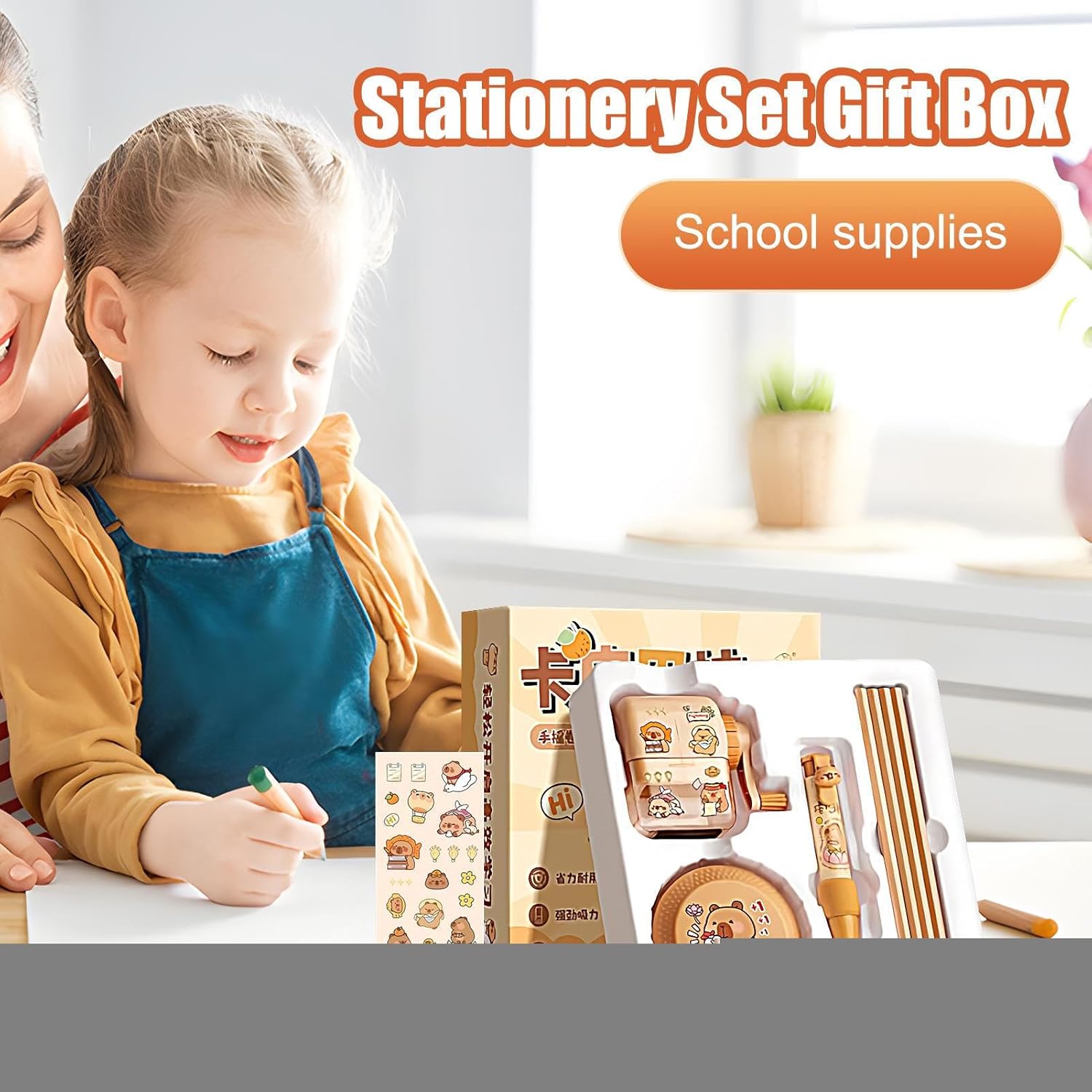 Kit Completo per Scrivania: Aspirabriciole elettrico per tenere pulito lo spazio di lavoro durante la scrittura e temperare matite, completo di gomme morbide e temperamatite a manovella per un uso pratico quotidiano Esperienza Migliorata: Dotato di aspiratore elettrico e temperamatite, il set migliora l'efficienza di studio mantenendo l'area di lavoro ordinata e garantendo compatibilità con tutti i tipi di matite per una maggiore concentrazione Tranquillità Totale: L'eccellente PP garantisce prestazioni stabili con maneggevolezza regolare, offrendo soddisfazione continuativa e rassicurazione durante utilizzi prolungati Creatività Pratica: Kit per bambini che diventa regalo significativo per mostrare cura in eventi come compleanni, festività natalizie e celebrazioni di Capodanno con approccio giocoso Tema Cartone Adorabile: Design accattivanti di capibara e panda un tema divertente che cattura l'attenzione e incoraggia la curiosità nelle attività educative per l'infanzia