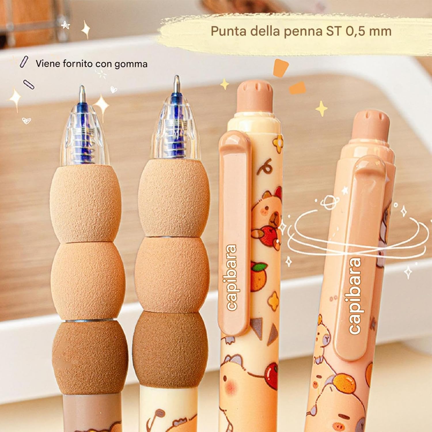 Nessun errore di scrittura: cancella facilmente gli errori con la gomma sulla parte superiore, simile a una matita, senza lasciare segni o danneggiare il documento. È molto pratico Penne retrattili: migliora il tuo gioco di scrittura con le nostre adorabili penne cancellabili retrattili, che vantano affascinanti motivi di capibara a fumetti perfetti per donne, ragazze e ragazzi. Correggi facilmente i tuoi errori senza problemi e goditi ogni volta un'esperienza di scrittura Prestazioni di scrittura migliorate: facile da usare, basta scorrere verso il basso la clip da tasca per scrivere; perfetto per soddisfare le tue esigenze quotidiane di scrittura, marcatura e firma o da regalare a familiari e amici Ampia gamma di usi: ideali per la casa, l'aula, l'area di lavoro o l'ufficio, queste penne sono ampiamente utilizzate per le attività scolastiche, garantendo che ogni parola sia perfetta. È ampiamente utilizzato Cancellazione senza sforzo: dotate di una ricarica sostitutiva blu da 0,5 mm, queste penne cancellabili retrattili offrono una presa comoda e superfici antiscivolo, assicurandoti di scrivere senza intoppi per ore