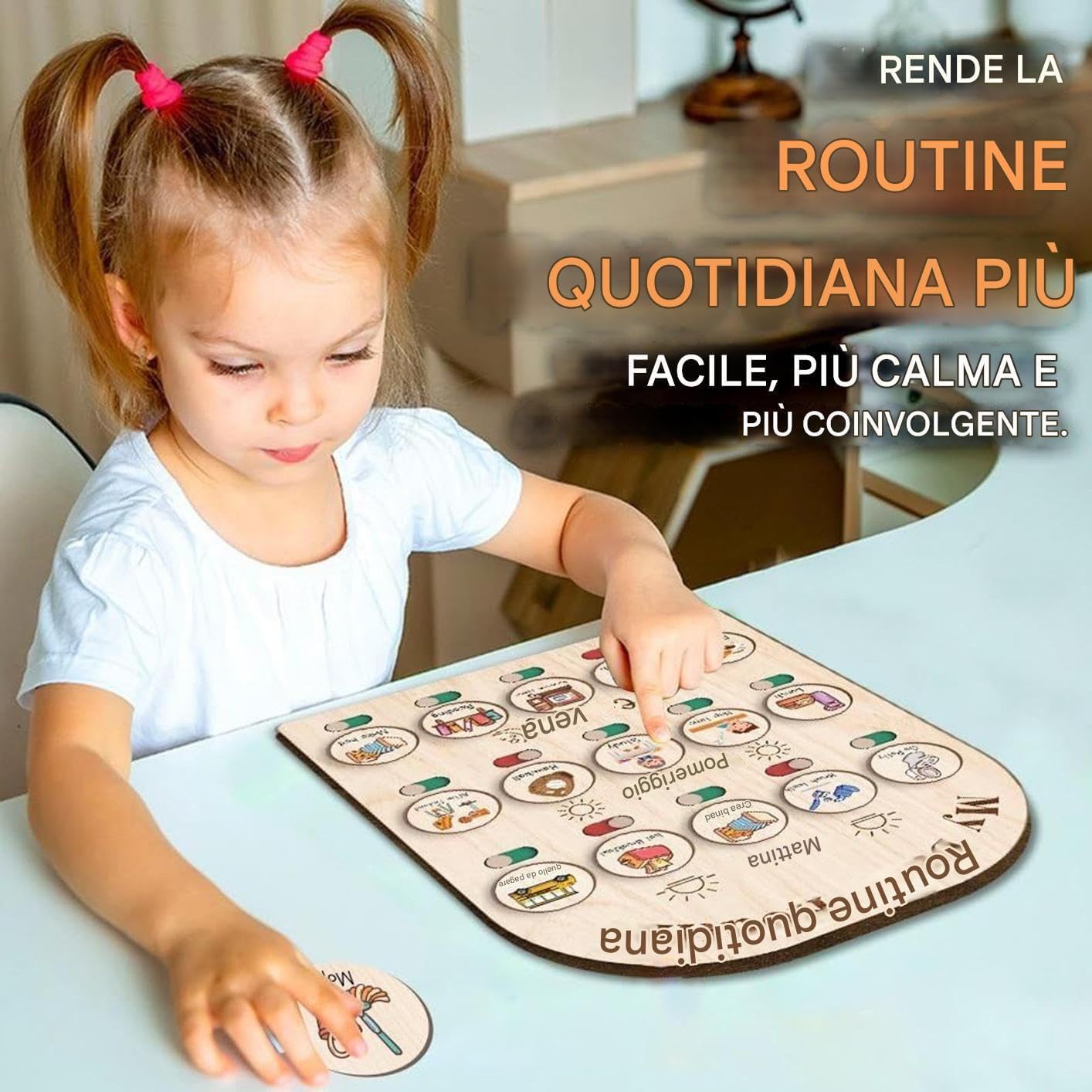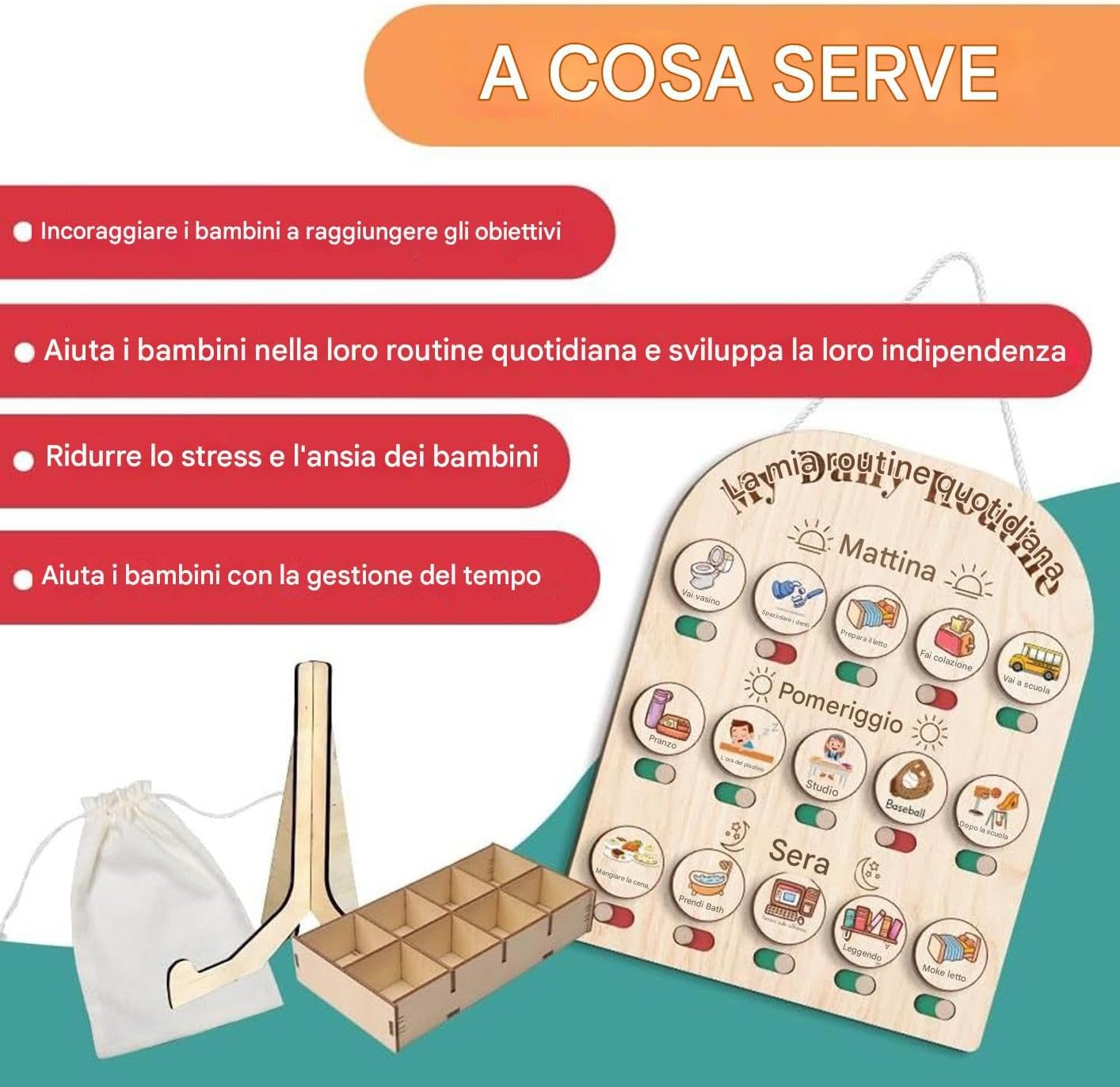 Idea Regalo Unica: Gioco didattico che diventa ricordo speciale, per eventi festivi. Supporta lo sviluppo prescolare con attività educative stimolanti che incoraggiano l'acquisizione naturale di competenze attraverso il divertimento. Organizzatore Attività Quotidiane: completo con carte riutilizzabili robuste, contenitore in legno e borsa in tela per gestire i compiti giornalieri attraverso un pratico telaio circolare visivo. Funzionalità multidimensionale: Grazie all'altezza accessibile e doppie opzioni di posizionamento (tavolo/parete), organizza spazi come abitazioni, aule e zone notte in modo efficiente. Supporto visivo intuitivo per routine quotidiane diversificate Soluzione Grafica Interattiva: Progettata con approccio coinvolgente per bambini la lavagna in legno favorisce lo sviluppo della routine quotidiana fungendo da pratico strumento visivo per pianificare attività durante tutta la giornata Sviluppo Infantile Completo: Migliora il pensiero logico e la creatività attraverso attività coinvolgenti, sostenendo contemporaneamente l'ampliamento del vocabolario, il potenziamento della percezione visiva e il miglioramento delle abilità motorie nei bambini.