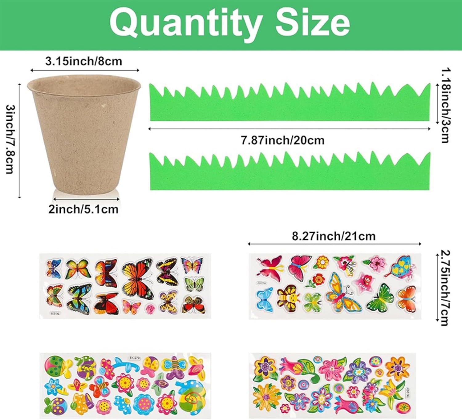 Materiale Solido: Tecnologia adesiva EVA nell'decorativa offre adesione affidabile, rendendo gli adesivi in schiuma stabili e resistenti, ideale per decorazioni durevoli su vasi di carta Strumento di apprendimento creativo: Combina temi di , farfalle e frutta per incoraggiare la scoperta pratica, ispirare la creatività e sviluppare una connessione più profonda con la bellezza naturale Adattabilità Didattica: Favoriscono l'apprendimento pratico attraverso vasi per fiori ideali per attività scolastiche, integrando divertimento e utilità multifunzione per garantire rilevanza negli ambienti di insegnamento contemporanei Aerazione Ottimale: Cupola trasparente con aperture di ventilazione strategiche permette di monitorare la crescita delle piante creando l'ambiente ideale per stimolare naturalmente la fotosintesi clorofilliana Semplice utilizzo: Progettato per la classe, questo kit pre-confezionato offre un'esperienza facile grazie all'assemblaggio intuitivo, garantendo un setup rapido senza bisogno di adesivi o attrezzi aggiuntivi per una creazione conveniente