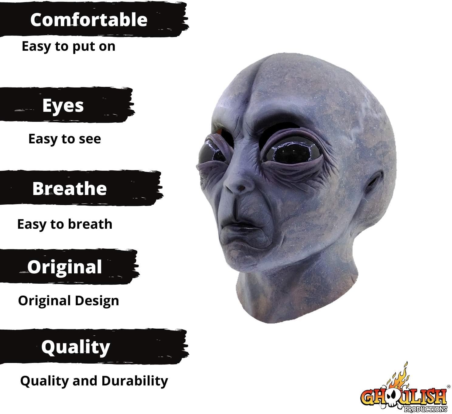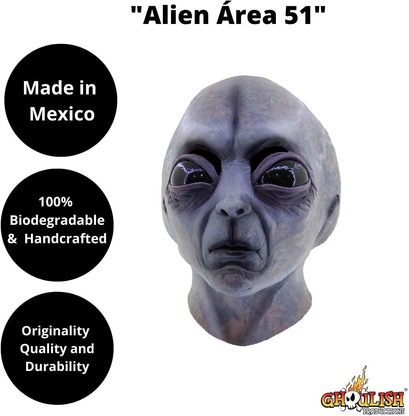 Maschera di Alien Area 51 della linea Aliens di Ghoulish Productions. Amiamo gli extraterrestri perché sono un riflesso di chi siamo, rappresentando sia il peggio che il meglio dell'umanità, da coloro che saccheggiano e uccidono ai saggi e compassionevoli. Sono un deposito dei nostri timori e delle nostre speranze più profonde. Gli alieni grigi sono arrivati in pace. Pronti ad essere invitati alla tua festa di Halloween. Indossa questa incredibile maschera in lattice dell'Area 51 e diventa il centro dell'attenzione alla tua festa. Dimensioni: Una maschera in lattice taglia unica per adulti con le dimensioni di 26 x 24 x 23 cm. Qualità: Realizzato a mano e dipinto in Messico con un processo completamente artigianale utilizzando lattice 100% biodegradabile. Istruzioni per la cura: Pulisci la maschera prima e dopo l'uso con una spugna, acqua tiepida e un po' di sapone liquido senza profumo o con un panno leggermente umido. La maschera è facile da pulire.