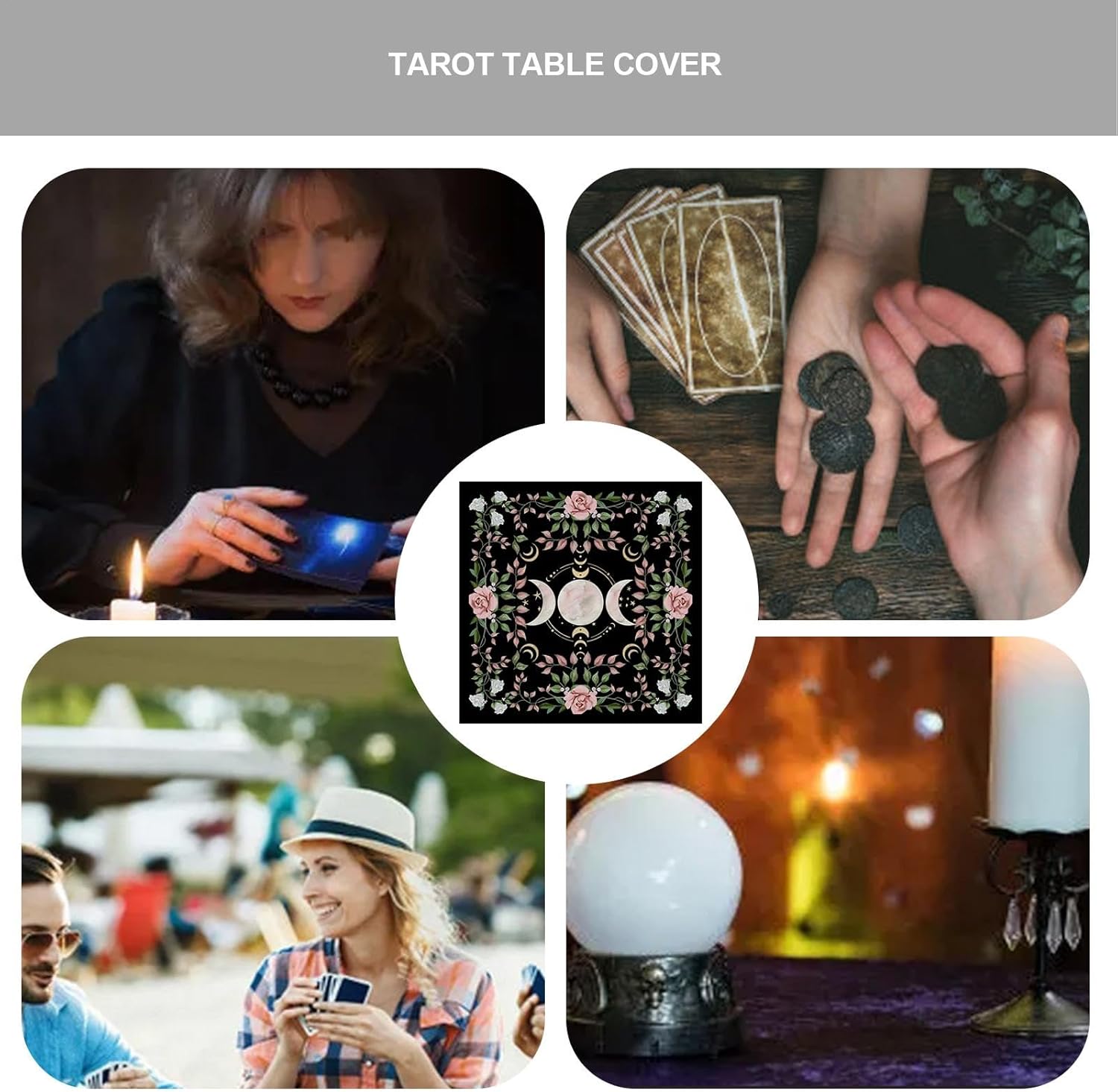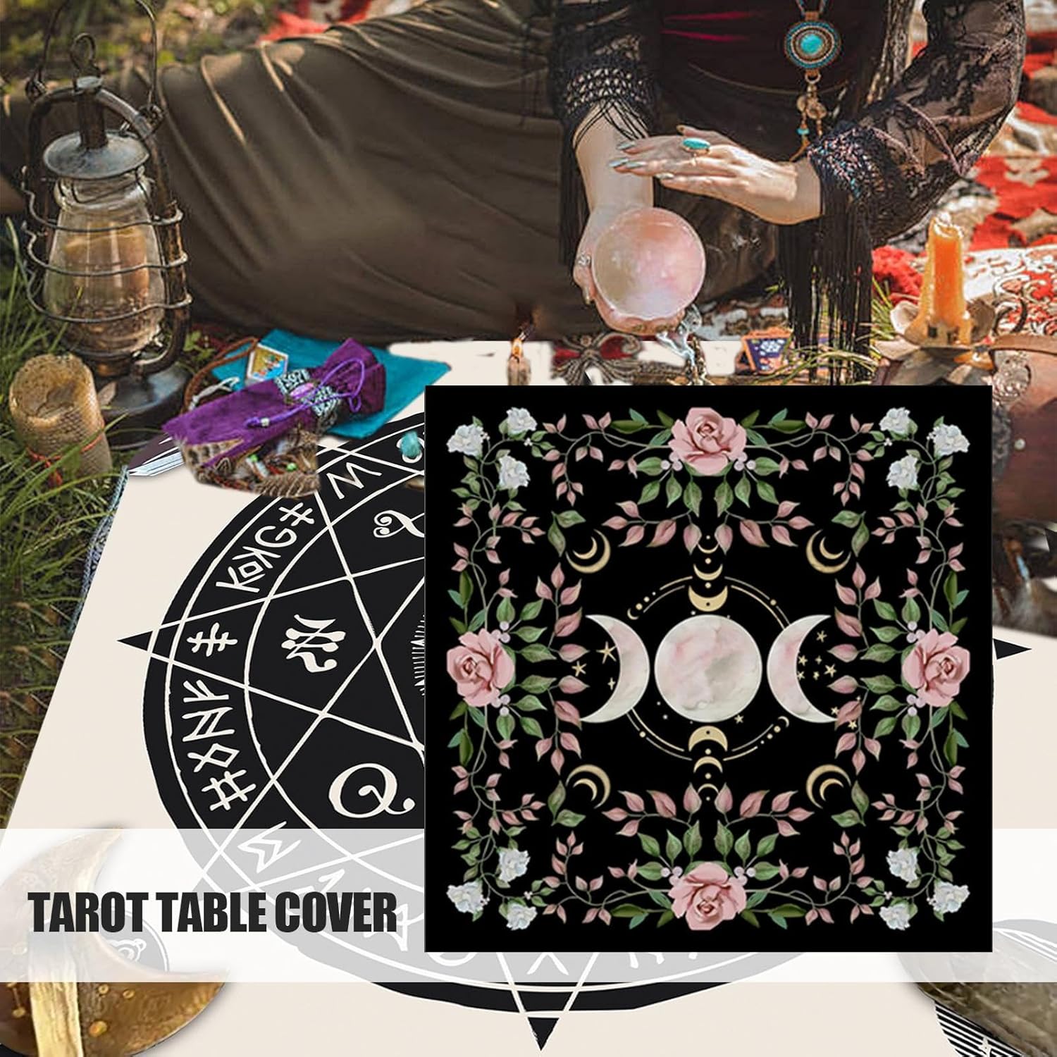 Perfect for Tarot Readings: Designed specifically for tarot enthusiasts, this table cloth features moon phases and a soft , providing the ideal backdrop for your tarot card readings or spiritual practices. & Easy to Store: This table cloth practicality, easy folding up for storage after use, make it convient for those with limited space or on the go. Versatile multiuso Use: While perfect for tarot readings, this table cloth anche serves as a stylish and functional cover for family cenners, protecting your table while adding a touch of charm to any meal. Tessuto morbido e durevole: realizzato in materiale di alta qualità, questo tavolo è morbido al tatto e durevole da utilizzare senza bisogno di un uso frequente, ensuring a long lasting addition to your home or practice space. Design elegante e decorativo: Featuring moon phase imagery, this tablecloth brings an elegant, mystical atmosphere to your space. È un bel pezzo, simbolico che aggiunge un tocco personale ai tuoi tarocchi che leggono l'area o tavola da pranzo.