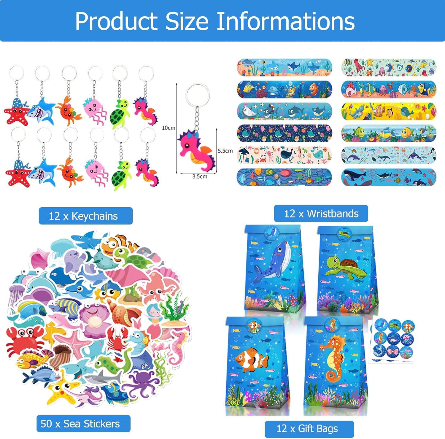 【Borse per feste di compleanno di creature marine】 Il set regalo per feste di creature marine ammonta a 98. Contiene 12 sacchetti regalo di creature marine, 12 portachiavi, 12 braccialetti, 12 segnalibri fai-da-te e 50 adesivi. Perfetto per i tuoi regali per la festa degli animali marini 【Materiale di alta qualità】 Queste decorazioni per feste di compleanno con animali marini sono realizzate con materiali di alta qualità, non tossici, non irritano la pelle, sono comode da indossare e completamente sicure per i bambini 【Goditi il divertimento del fai-da-te】 L'intero set contiene due set artigianali, segnalibri gratta e vinci, con i quali puoi graffiare il motivo desiderato secondo le tue idee. Ti abbiamo dotato di un sacchetto di carta in cui puoi mettere piccoli regali più comodi da trasportare. Una varietà di regali per bambini del mondo sottomarino, aggiungi divertimento alla festa.,Ampia applicazione: le nostre bomboniere per feste di compleanno per bambini con animali marini per molti tipi di feste, feste a tema creature marine, feste di compleanno per ragazze, feste con sirene, feste estive in piscina, regali per feste di compleanno e altro ancora. Perfetto per i tuoi regali per le feste con animali marini