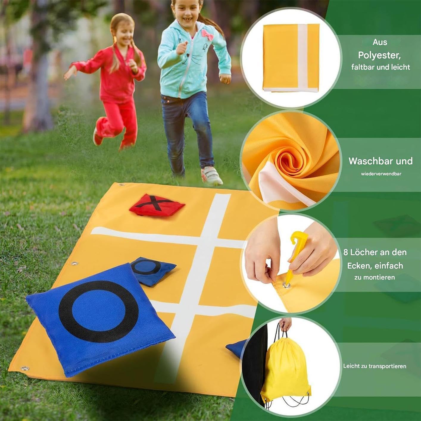 Costruzione senza soluzione di continuità: il gioco Bean Bag Toss è dotato di un meccanismo pieghevole compatto per riporlo e trasportarlo facilmente, trasformando qualsiasi ambiente interno o esterno in un'area di gioco dinamica; Poiché non ha bisogno di essere assemblato, offre divertimento immediato semplicemente aprendolo, rendendolo adatto a feste, ecc. Attività di gruppo interattiva: con un tappetino da gioco, sacchi di sabbia, picchetti e borsa per il trasporto inclusi, questo lancio del pouf fornisce una configurazione completa che aumenta il divertimento in famiglia e incoraggia l'interazione sociale durante picnic, feste o riunioni informali all'aperto. Giochi di lancio perfetti per le feste: questi giochi di lancio sono progettati per migliorare l'interazione sociale e il gioco attivo. Fungono da versatile fonte di intrattenimento in occasione di riunioni come barbecue in giardino, picnic o serate di giochi, offrendo divertimento ai partecipanti di tutte le età in una varietà di impostazioni. Costruzione robusta: realizzato con tappetini in poliestere antistrappo e sacchi di sabbia in tessuto Oxford, questo gioco di lancio dei fagioli all'aperto fornisce una costruzione robusta che può resistere a un uso ripetuto. I suoi componenti lavabili in lavatrice garantiscono una pulizia duratura, perfetta per i picnic e il divertimento in giardino. Aumenta lo sviluppo delle abilità in modo naturale: i giochi Bean Bag offrono una varietà di opzioni di gioco, dal lancio in solitario alle staffette di squadra, aiutando i giocatori a sviluppare senza sforzo la coordinazione occhio-mano e le abilità strategiche durante il tempo in famiglia, eventi scolastici o incontri sociali rilassati