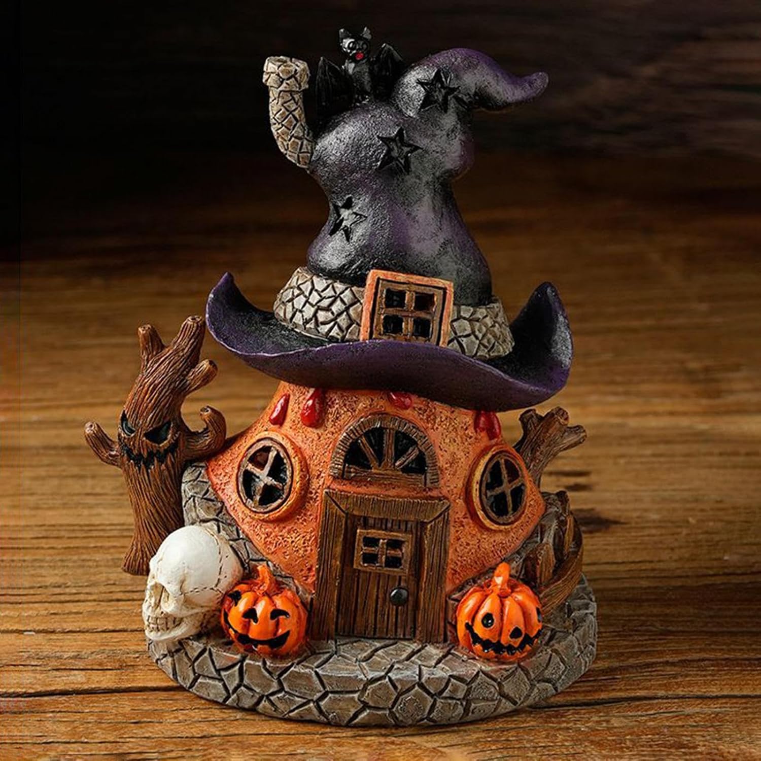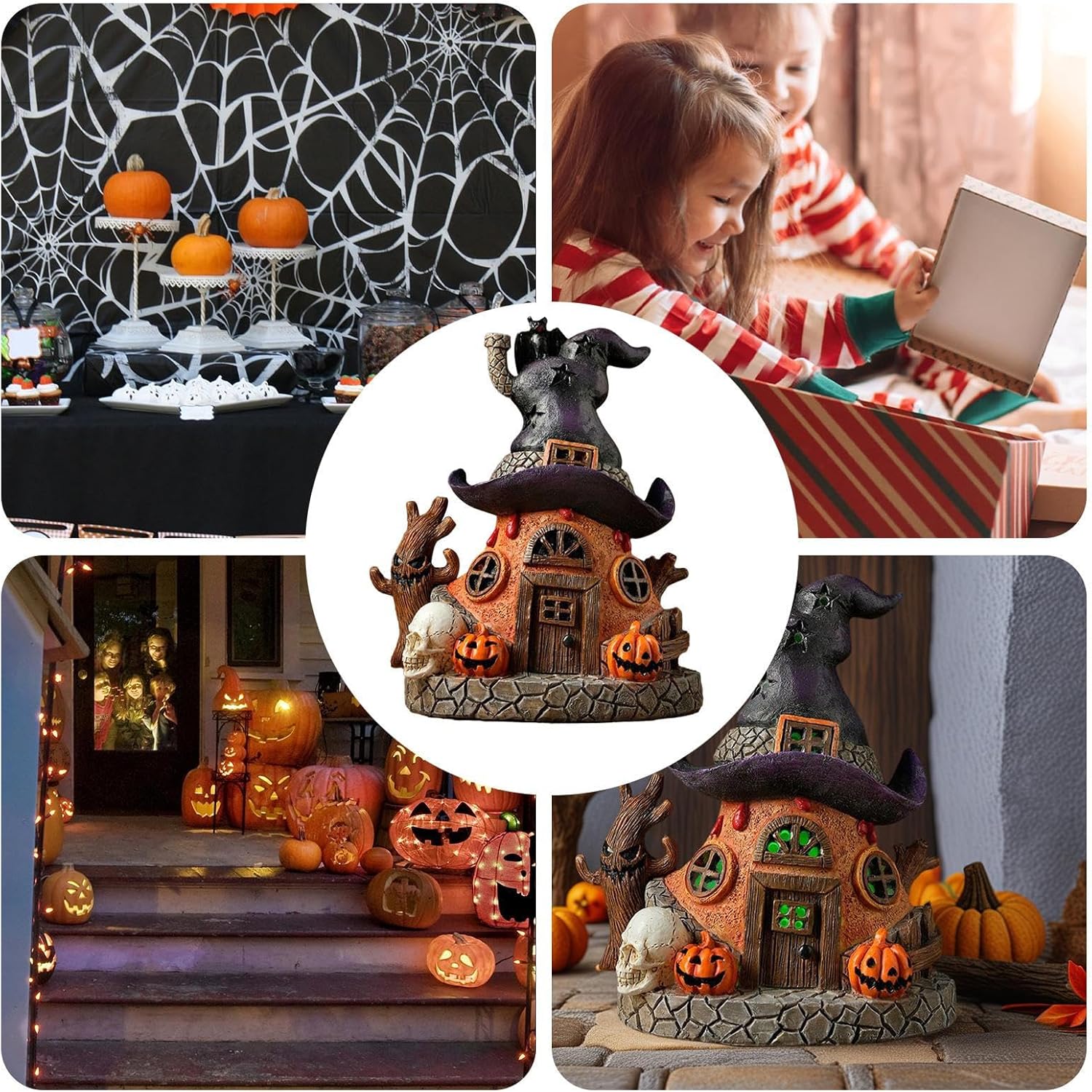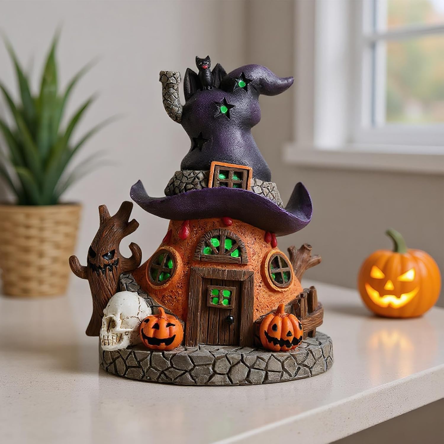 Comodo da utilizzare: pronto all'uso senza montaggio, incluso vano batteria per un maggiore comfort e facile da pulire con un solo panno umido per un piacere duraturo Applicazioni ideali: perfette da appendere o da appoggiare, queste statuette decorative per casa stregata si adattano ad ingressi, finestre o feste e offrono molteplici usi che conferiscono immediatamente profondità visiva Robusta lavorazione in resina: questa statuetta in resina robusta ha una base sicura ed è resistente agli agenti atmosferici e ai graffi, in modo che possa essere utilizzata in modo versatile in interni ed esterni e mantiene a lungo il suo splendore inquietante Luce calda per le festività: diffonde una delicata luce a LED a forma di zucca come decorazione notturna per interni ed esterni, dona alle stanze un fascino festivo e un'incantevole illuminazione con un'atmosfera accogliente Artigianato dettagliato: la statuetta della casa delle streghe presenta motivi come streghe, cappelli e zucche attraverso intagli artistici e crea una luce soffusa che crea un'atmosfera di Halloween incantevole e coinvolgente per gli amanti delle decorazioni stagionali