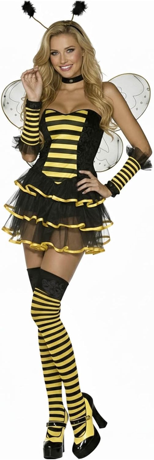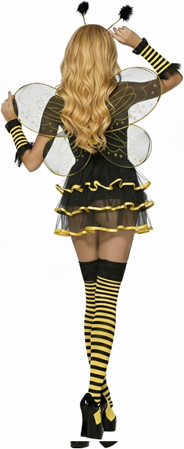 Con questo costume da ape da donna in più pezzi sarà un aspetto incantevole alla prossima festa in costume. Il cuore del set è l'abito corto con un top aderente con effetto a strisce d'api e una giocosa gonna in tulle nero con orlo giallo. Si crea una silhouette femminile e accattivante. I numerosi accessori garantiscono la completa trasformazione. Le ali delicate e trasparenti sono indossate sulla schiena, mentre un cerchietto con antenne oscillanti adorna la testa. In coordinato, polsini a righe e calze sopra il ginocchio completano l'intero aspetto. Questo set offre tutto il necessario per un rivestimento completo e armonioso. Colore: nero e giallo. Contenuto della confezione: 1 vestito, 1 ala, 1 cerchietto, 2 scaldamuscoli, 1 paio di calze