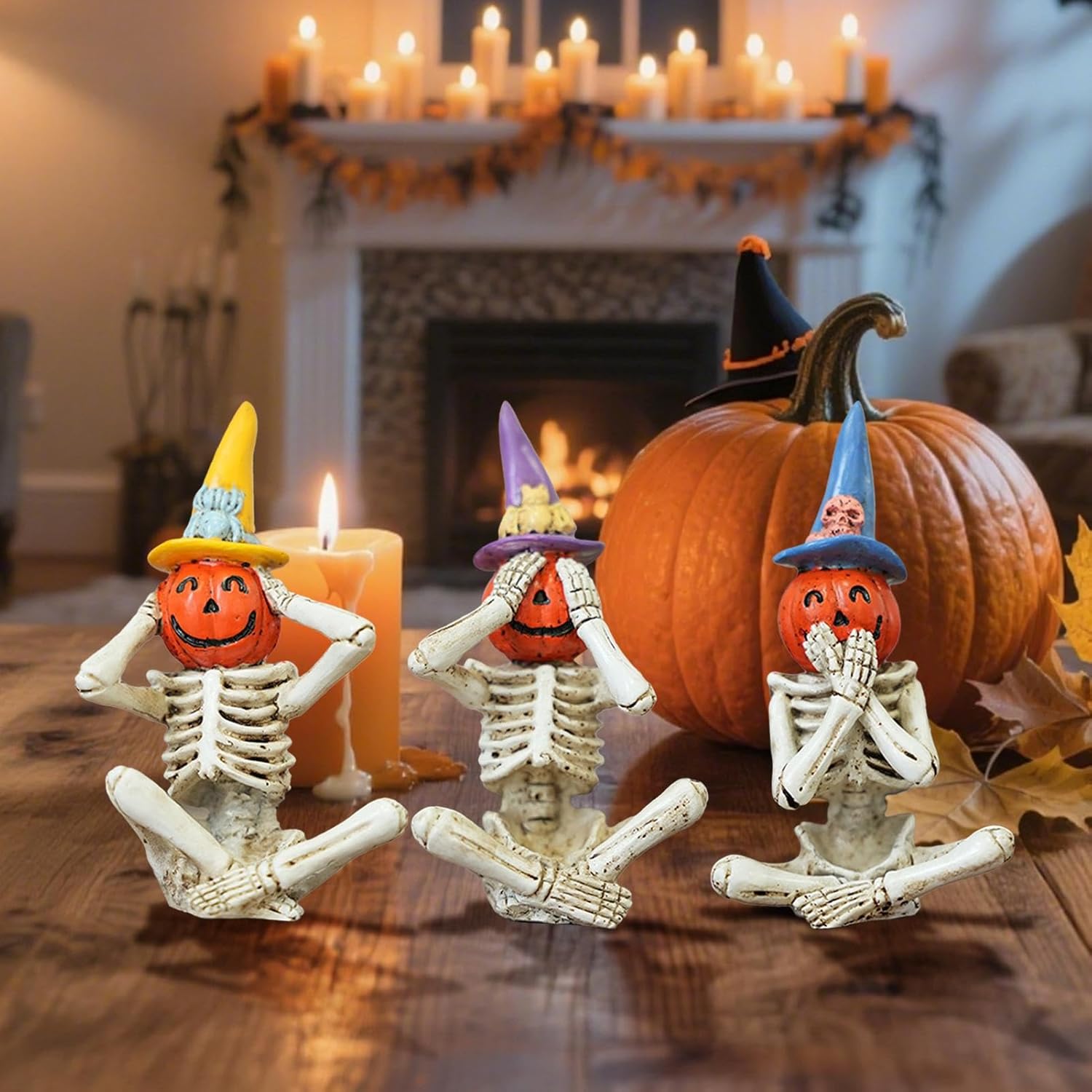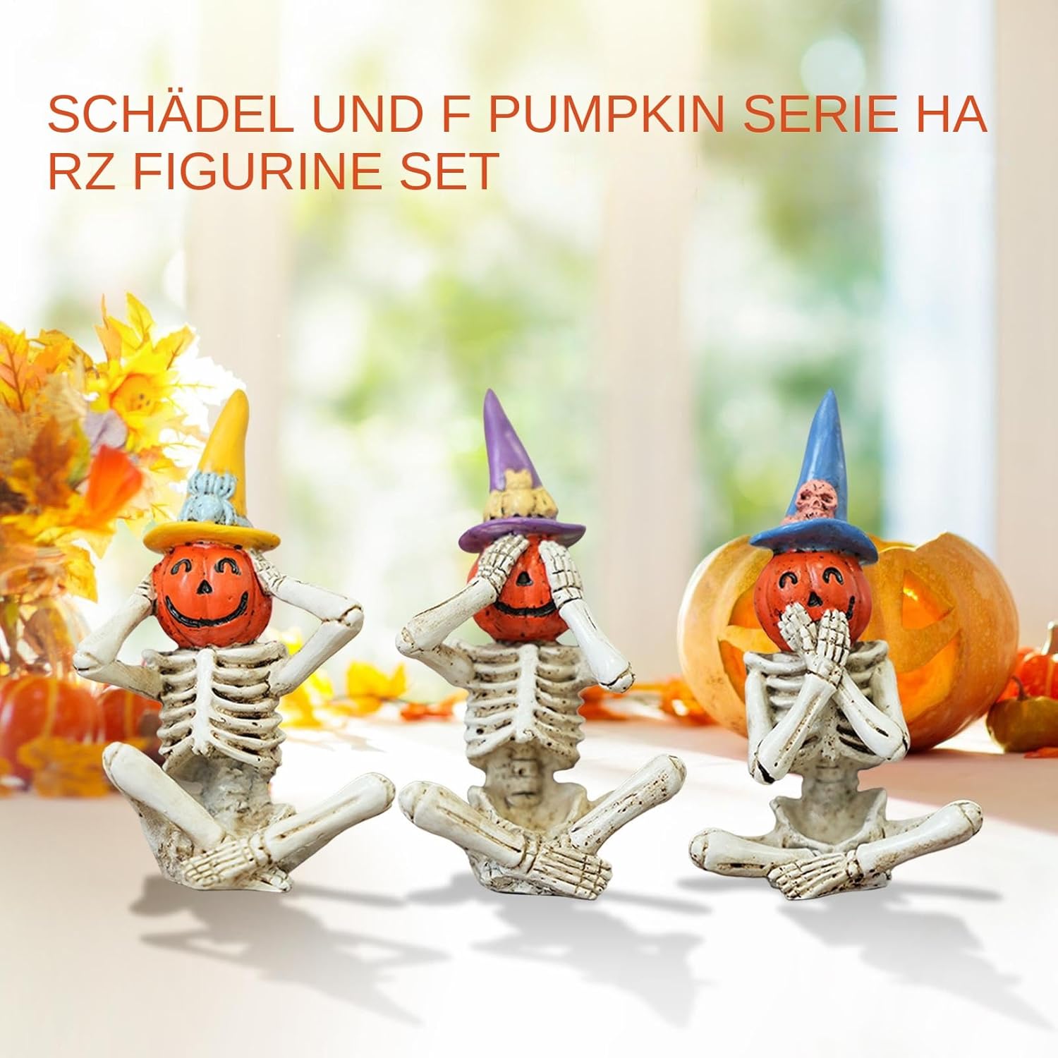 Sorpresa divertente: modo originale per mostrare cura! Queste divertenti figure scheletriche trasmettono sentimenti calorosi grazie al design creativo e rendono ogni festa indimenticabile. Dipinto con cura: meticolosa pittura a mano su resina di alta qualità. La superficie resistente sottolinea il design vivace e crea profondità plastica. Decorazione versatile: ideale per soggiorno, scrivania, giardino, cortile, balcone o casa spaventosa. Si adatta perfettamente a diverse aree e crea senza sforzo un'atmosfera inquietante di Halloween in qualsiasi stanza. Dettagli del set completo: tre figure scheletriche con teste di zucca dettagliate mostrano il classico linguaggio del corpo "non vedere nulla, non sentire nulla, non dire nulla" per una suggestiva decorazione di Halloween Arrangiamenti creativi: grazie alla moderata altezza singola perfetta per caminetti e banchi da lavoro. Il posizionamento flessibile multi-angolo consente decorazioni di accento salvaspazio con un elevato impatto visivo in formato compatto