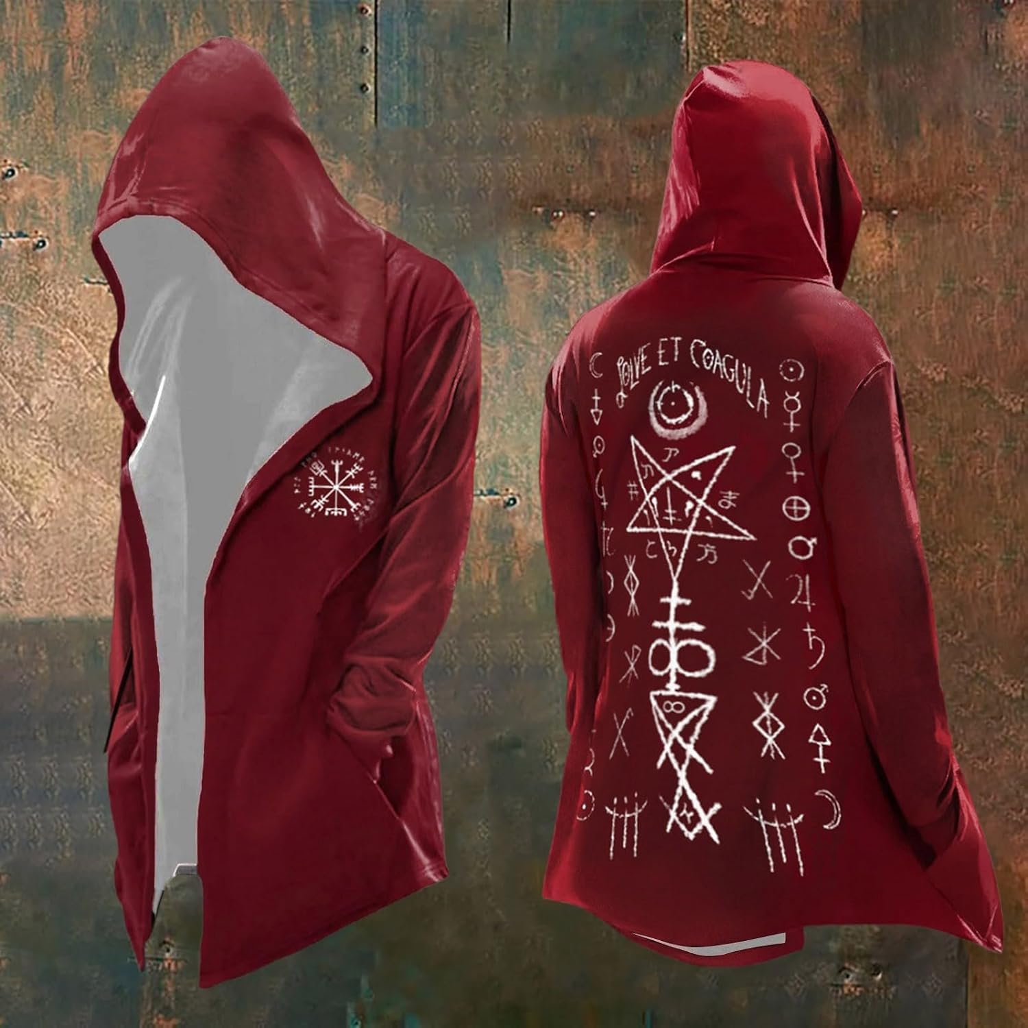 Mantello gotico con cappuccio e demoni. Cappotto medievale per Halloween e cosplay.