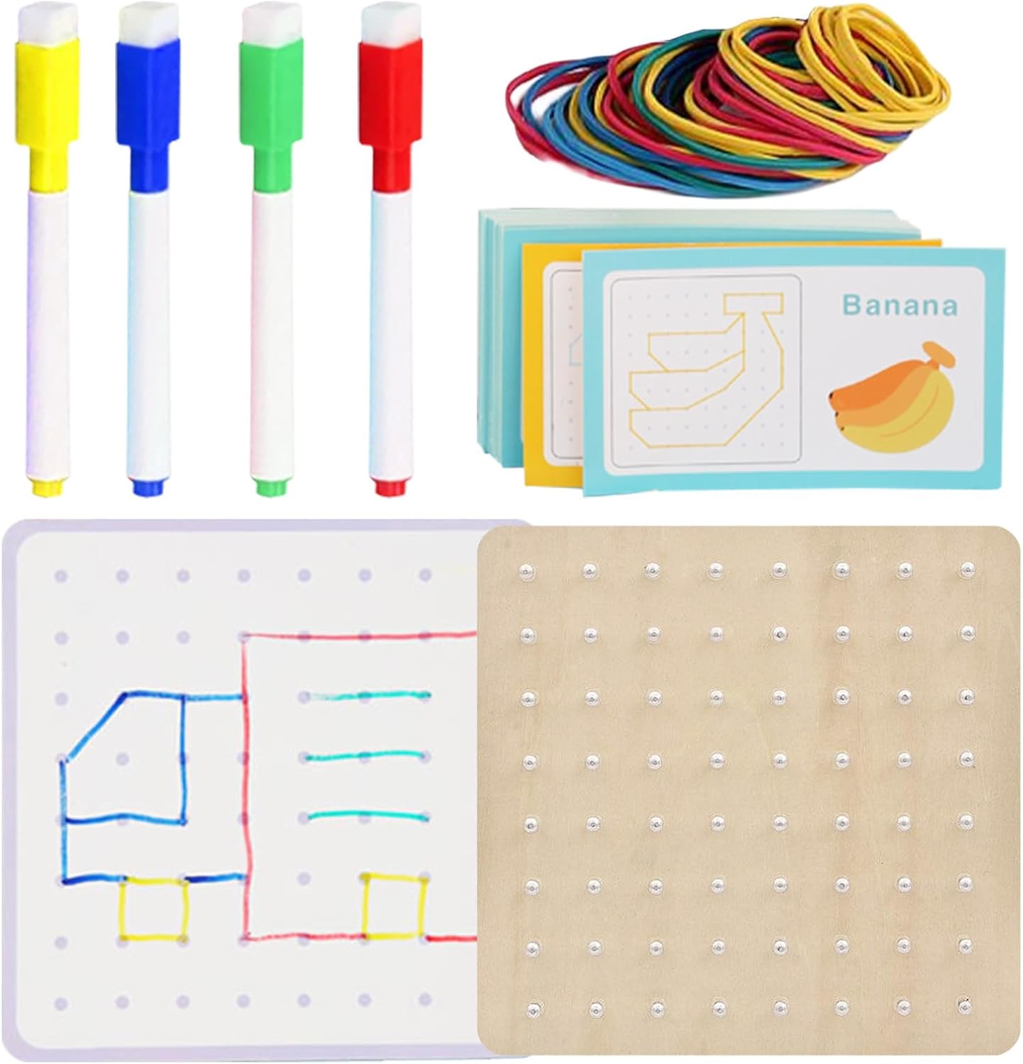 【Sicuro da giocare】 64 chiodi rotondi incorporati di Geo Boards For Classroom, il cinturino in gomma è abbastanza resistente, inoltre il design degli angoli arrotondati garantisce sicurezza al , consentendo ai tuoi bambini di giocare in sicurezza 【Promuovere la coordinazione occhio-mano】 Questa è una grande opportunità per promuovere le capacità motorie e la coordinazione occhio-mano, poiché i bambini possono costruire forme diverse sui Geoboard con elastici in base alle sfide 【Istruzione e intrattenimento】 Geo Board Set è adatto a bambini di età compresa tra 3 e 6 anni, costruisce le abilità di differenza di colore e dimensioni delle forme, aiuta i bambini a imparare forme, colori, contare 【Informazioni sulle forme geometriche astratte】 TheRubber Band Board è progettato per avere forme geometriche astratte davanti e dietro. La giustapposizione deliberata aiuta i bambini a sviluppare il pensiero geometrico astratto 【Funzioni multiple】 Oltre all'apprendimento della geometria in età prescolare, una varietà di oggetti diversi di Geoboard in legno può anche aiutare i bambini a imparare il vocabolario di oggetti di uso quotidiano, come animali, veicoli, verdure, ecc., Quindi questo è strumento di apprendimento versatile