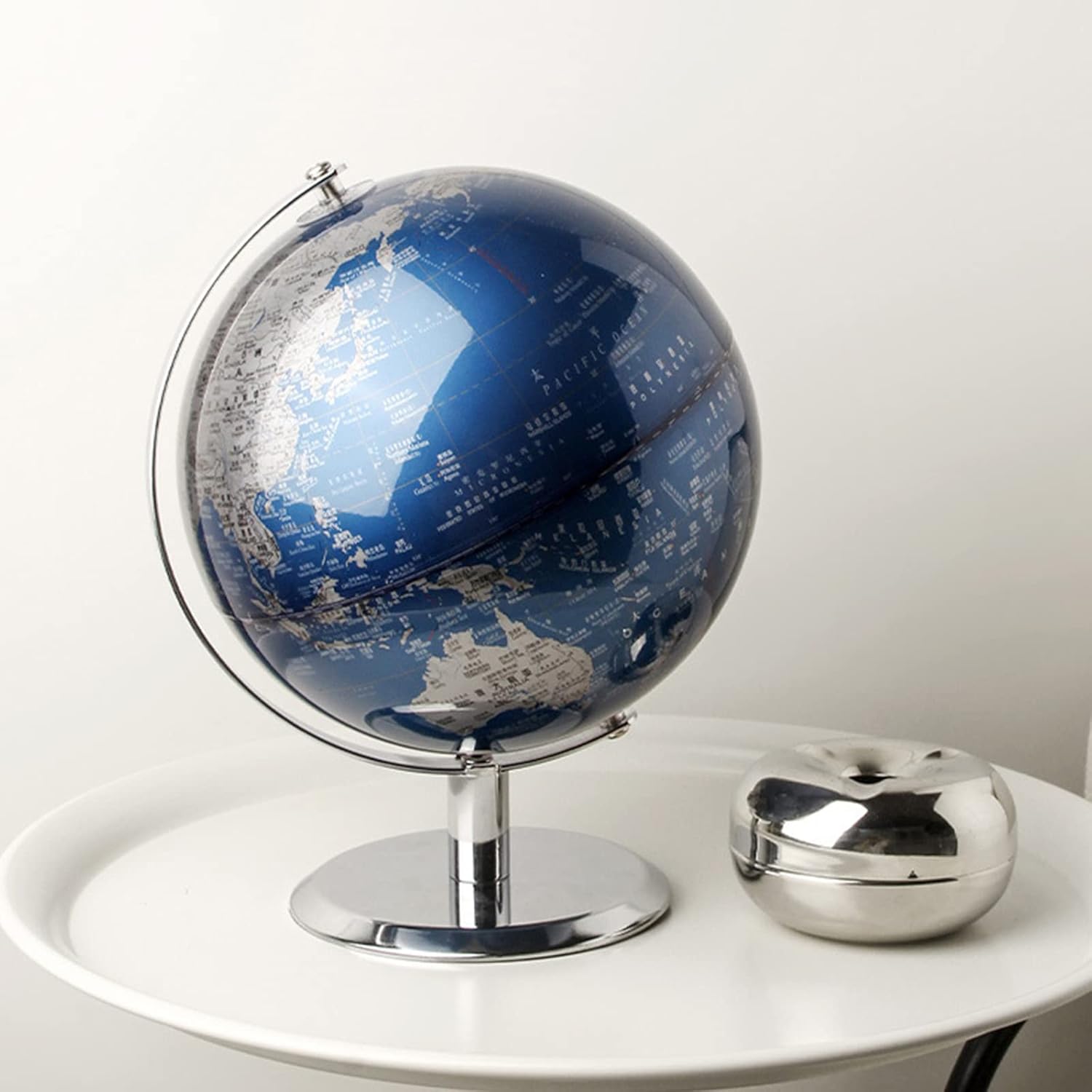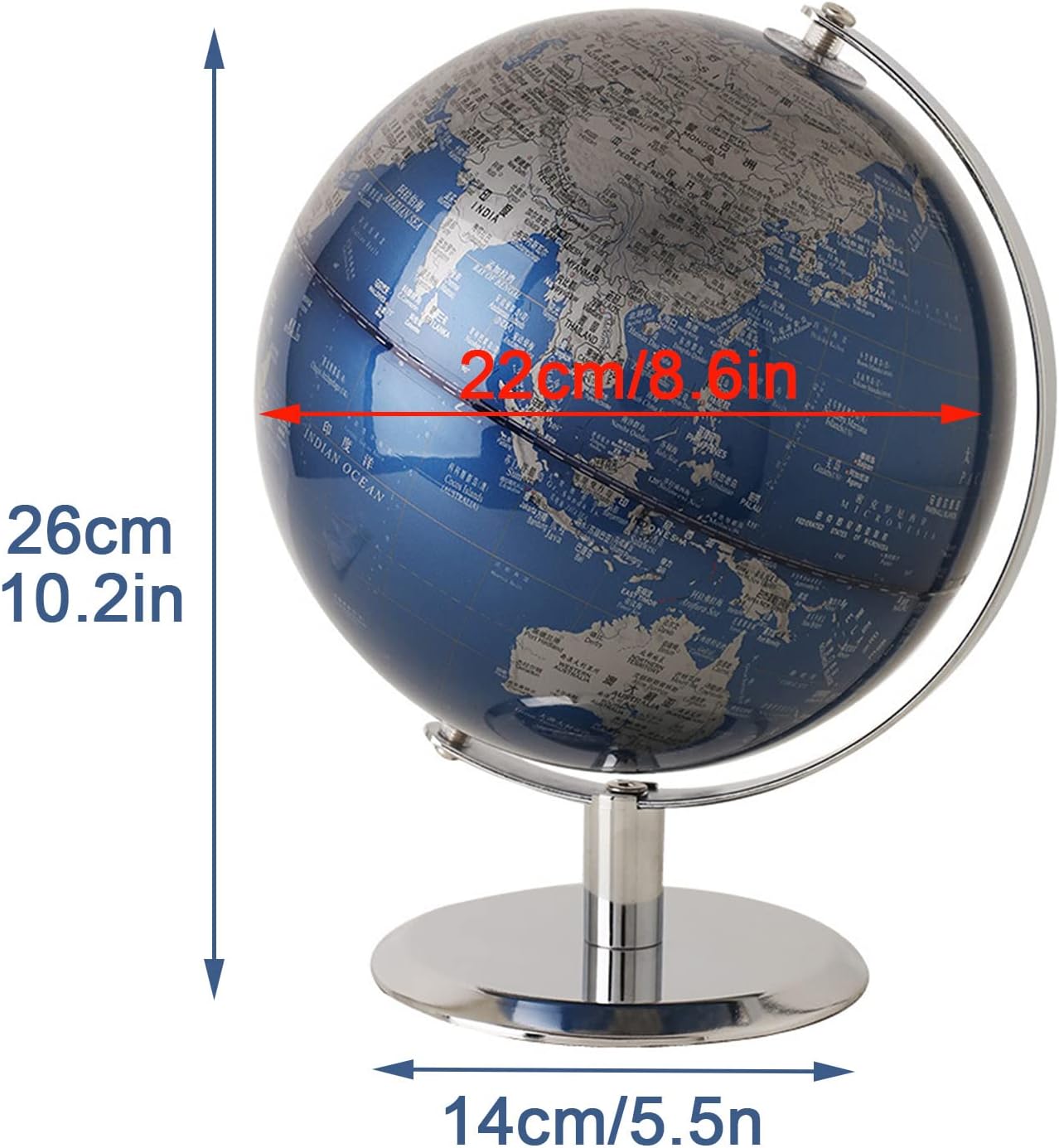 La superficie della sfera è chiara e liscia, stampata con vernice metallizzata Dimensioni: 14*22*26 cm/5,5*8,6*10,2 pollici Sul fondo del tappetino antiscivolo viene aggiunto un design del tappetino antiscivolo, che non è facile da graffiare i mobili Può essere usato come aiuto for l'apprendimento e come regalo squisito. Questo mappamondo rotante, durevole ed elegante, è un regalo di Natale o di compleanno indimenticabile per coppie o bambini, che conserveranno per tutta la vita!