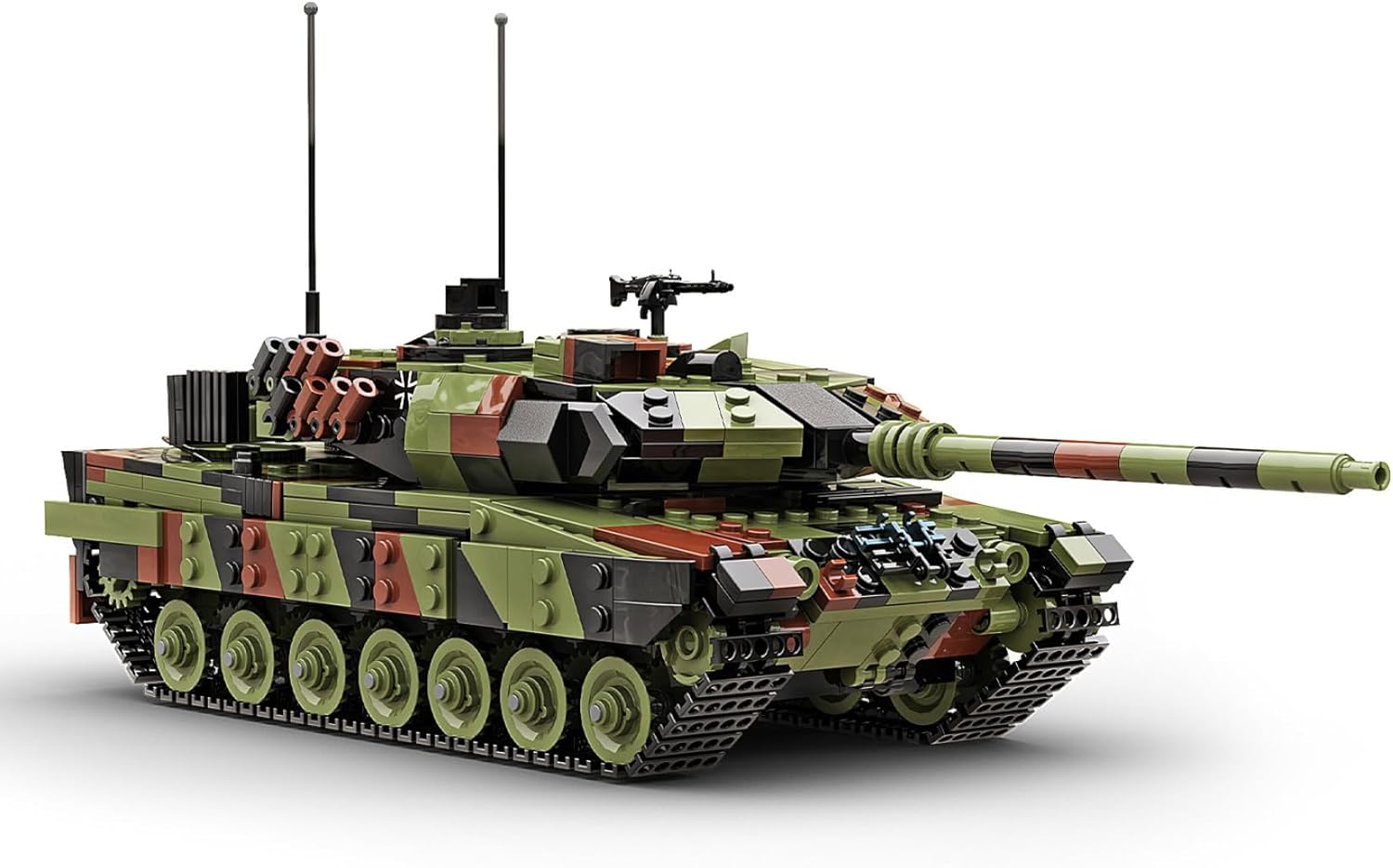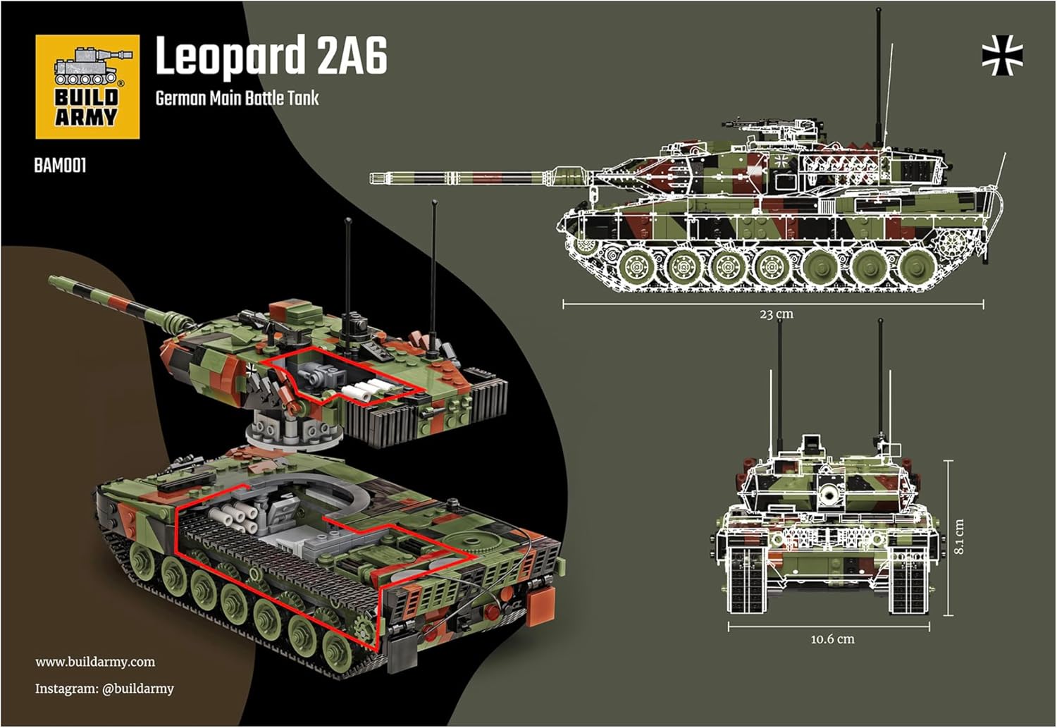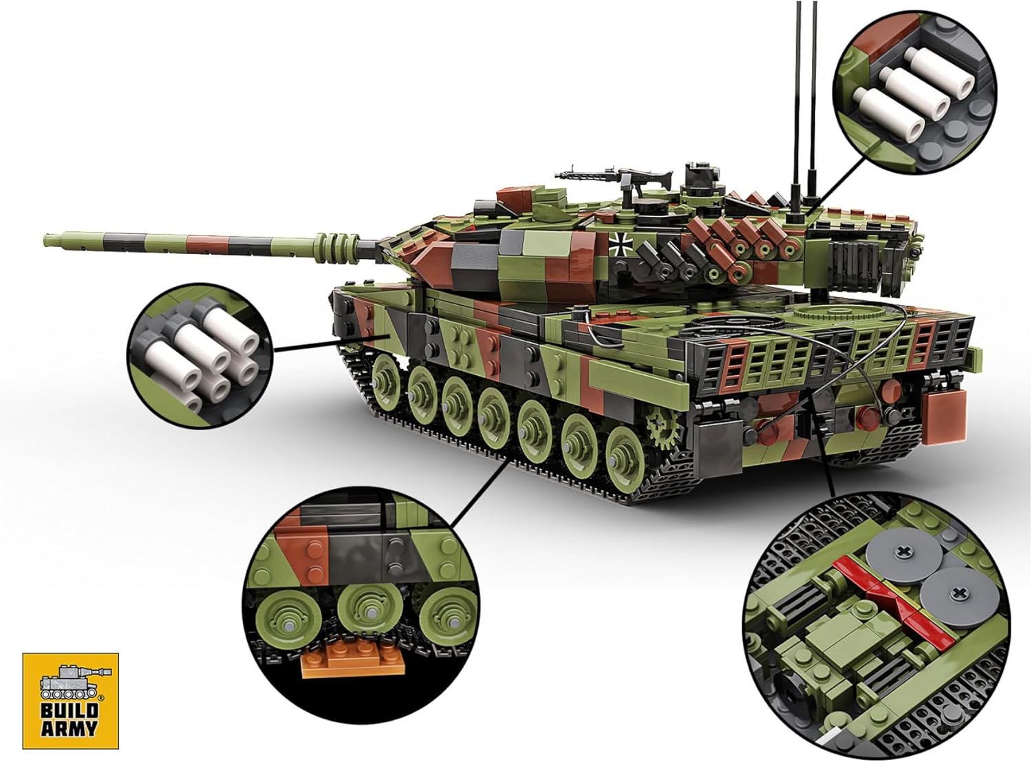 Scala autentica: preciso modello di carro armato Leopard 2A6 in scala 1:33, misura 23 cm di lunghezza e 10,6 cm di larghezza, ricreando fedelmente uno dei carri armati principali più avanzati al mondo Costruzione premium: dispone di 1.400 mattoni ABS di alta qualità con tecniche di costruzione avanzate per catturare angoli complessi della torretta e design dell'armatura inclinata INTERNO DETTAGLIATO: Include sedili conducente meticolosamente realizzati, cestino torretta, deposito munizioni e vano motore MTU MB 873 Ka-501 per un autentico realismo CARATTERISTICHE FUNZIONALI: Il sistema di sospensione funzionante consente movimenti realistici sugli ostacoli, mentre il design modulare di apertura fornisce un facile accesso agli interni dettagliati Costruzione avanzata: impegnativo livello di difficoltà 8/10 con tempo di montaggio di circa 3,5 ore, completo di adesivi Iron Cross per autenticità