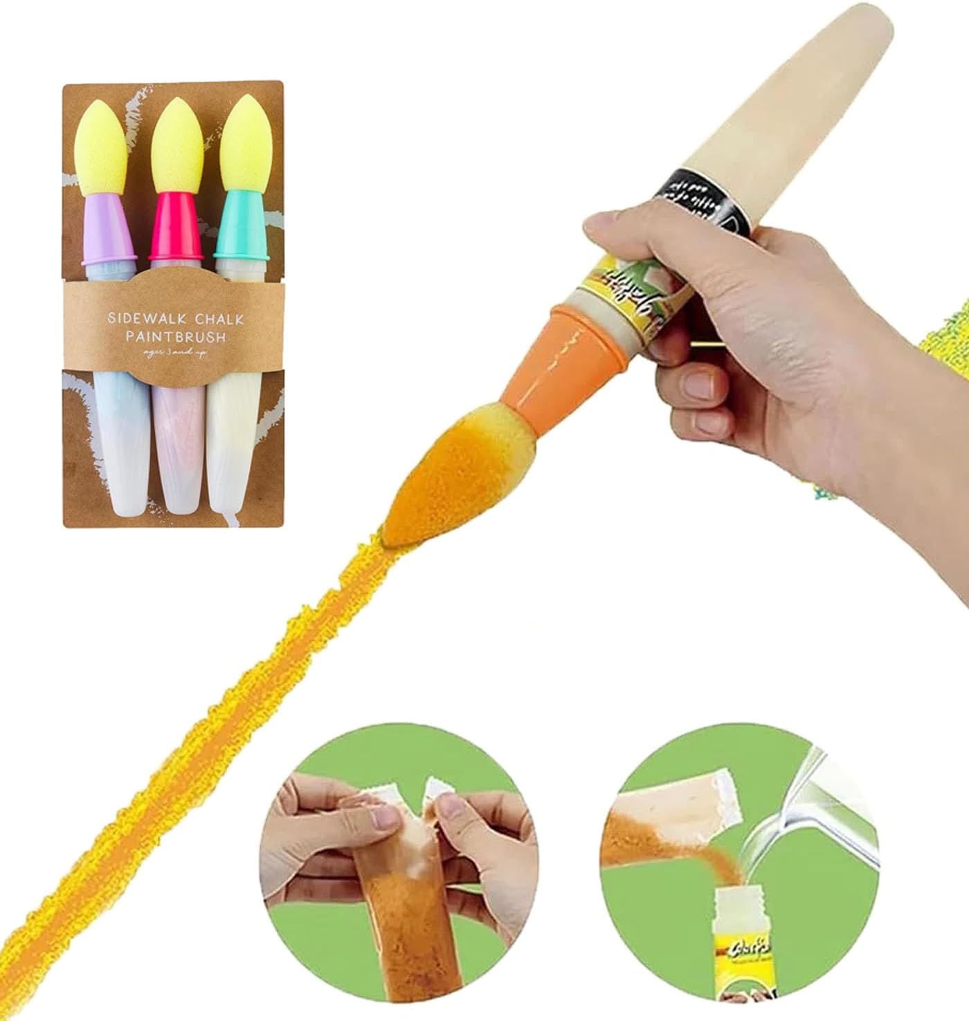 【Pennello per pittura a gesso per marciapiedi】: il pennello per pittura a gesso per marciapiedi è precaricato con pigmenti, basta aggiungere acqua al pennello e iniziare a creare capolavori colorati sul marciapiede 【Adatto a tutte le età】: dai bambini piccoli che esplorano la loro creatività ai bambini più grandi che hanno una gara di pittura a gesso, tutti possono unirsi al divertimento 【Ricaricabile】: il pennello per pittura a gesso per marciapiedi richiede un'attenta manipolazione, ma il pennello è progettato per essere ricaricabile 【Colori vivaci】: questo set di pennelli per pittura a gesso per marciapiedi include vernici rosse, gialle e blu brillanti per disegni realistici e accattivanti 【Ampia applicazione】: perfetto per i bambini che amano i giochi d'arte, consente ai bambini di esprimere liberamente i loro talenti artistici per migliorare le opere d'arte all'aperto senza sporcare