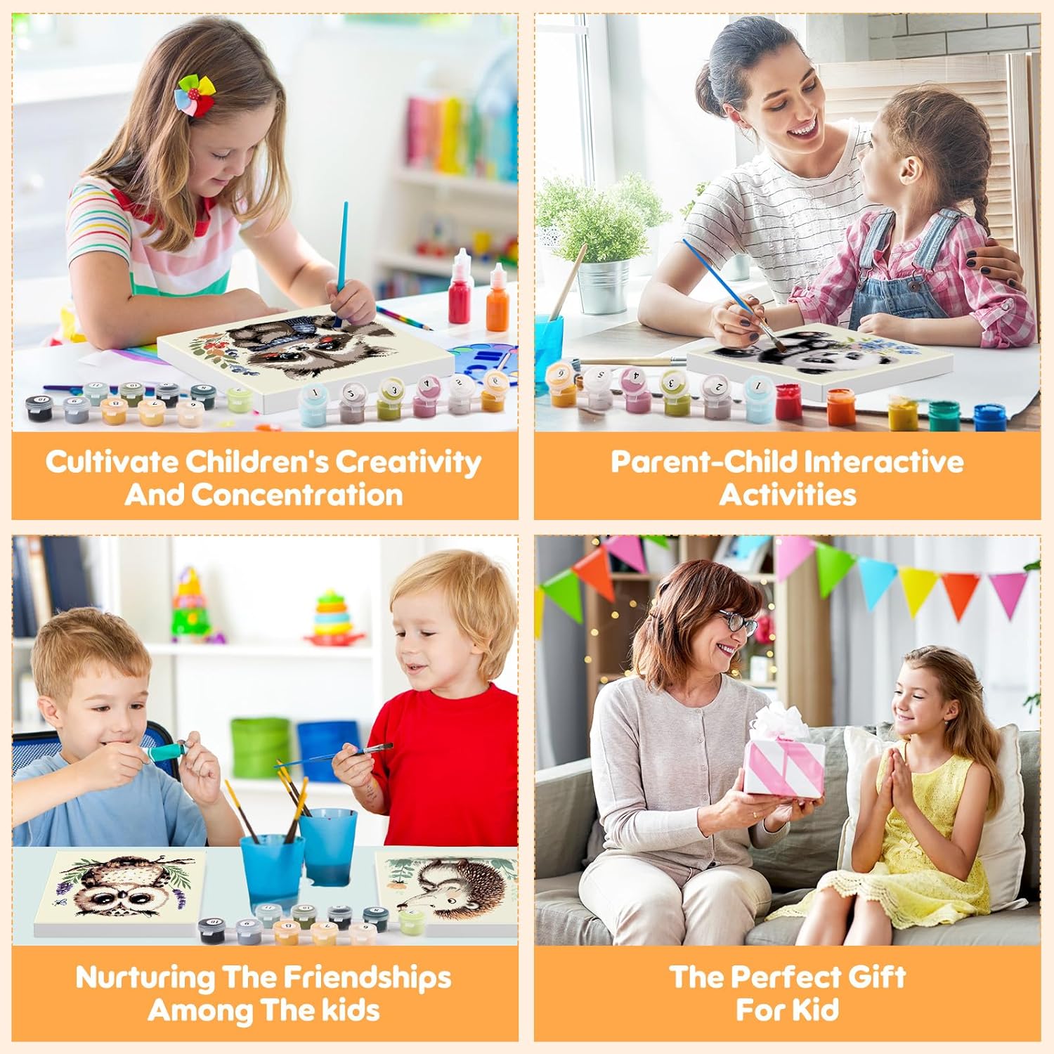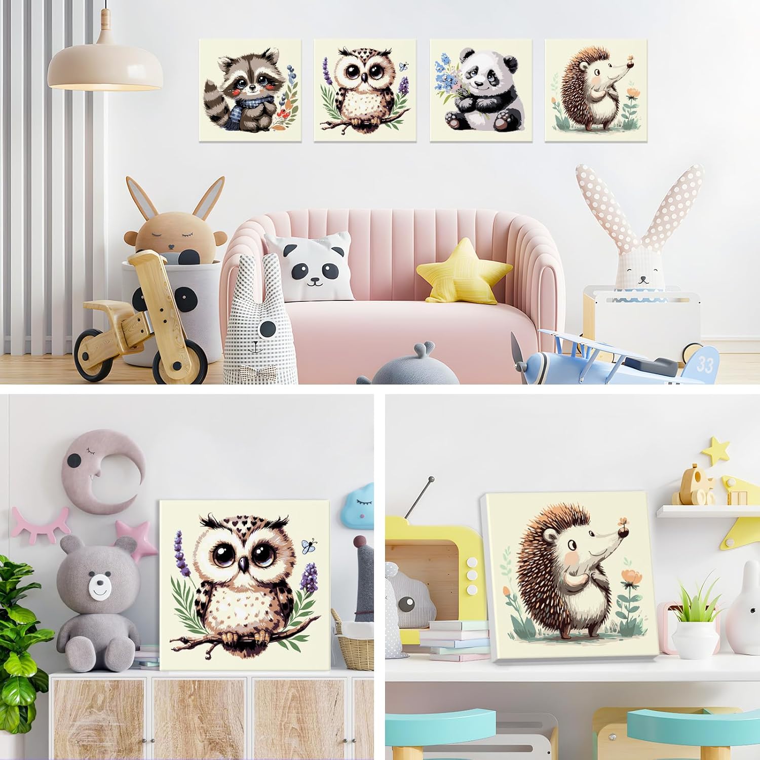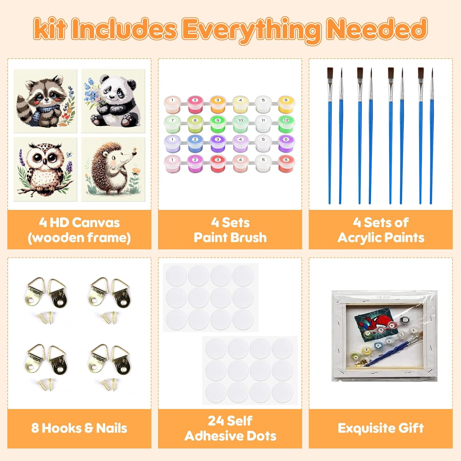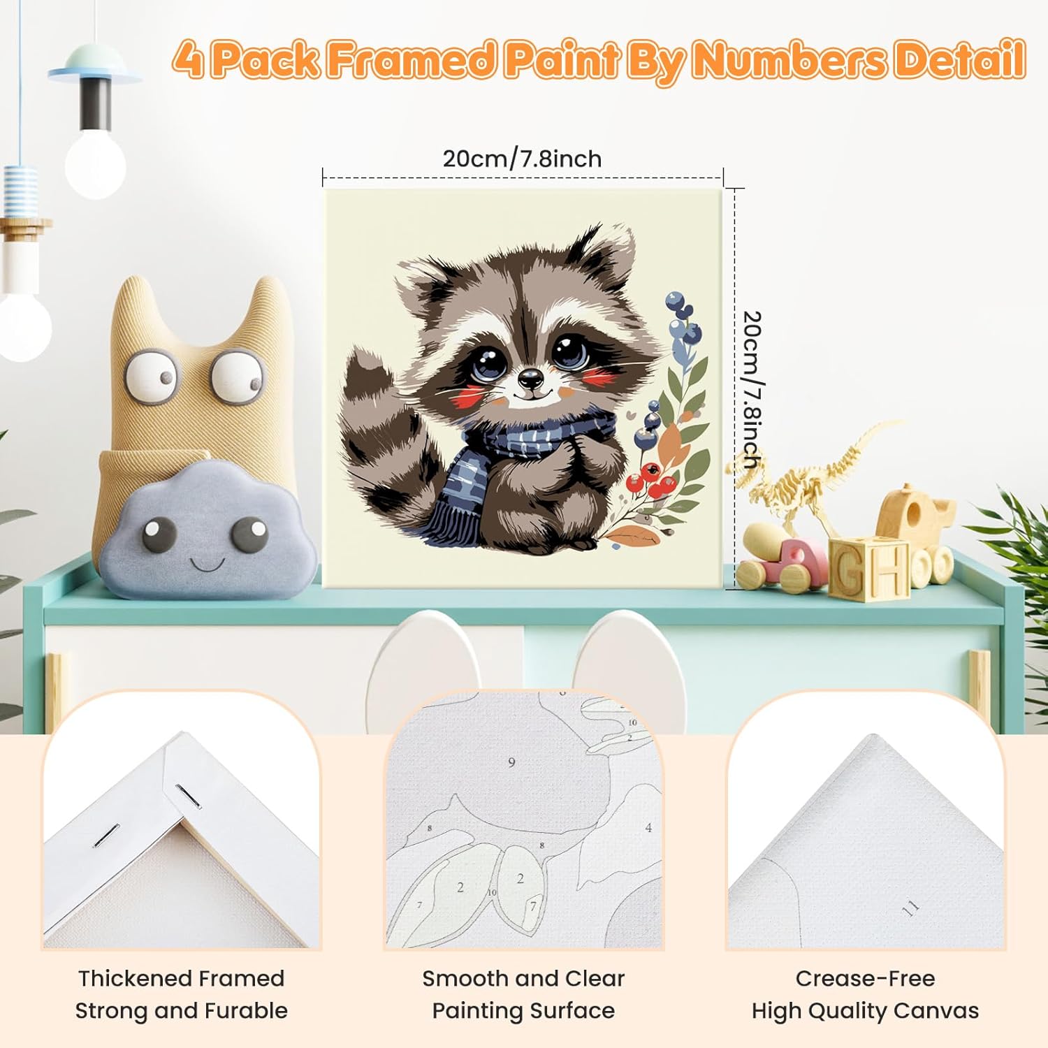 GHHKUD Kit per dipingere con i numeri, per bambini e adulti, confezione da 4 pezzi, kit per pittura su tela con numeri, per principianti, bambini con cornice in legno, animali dei cartoni animati,